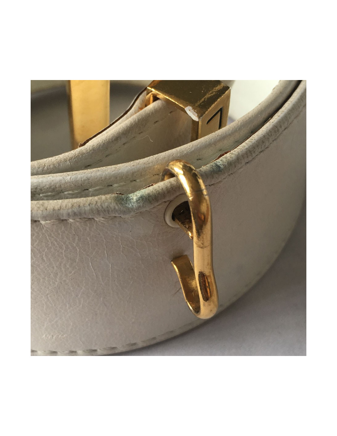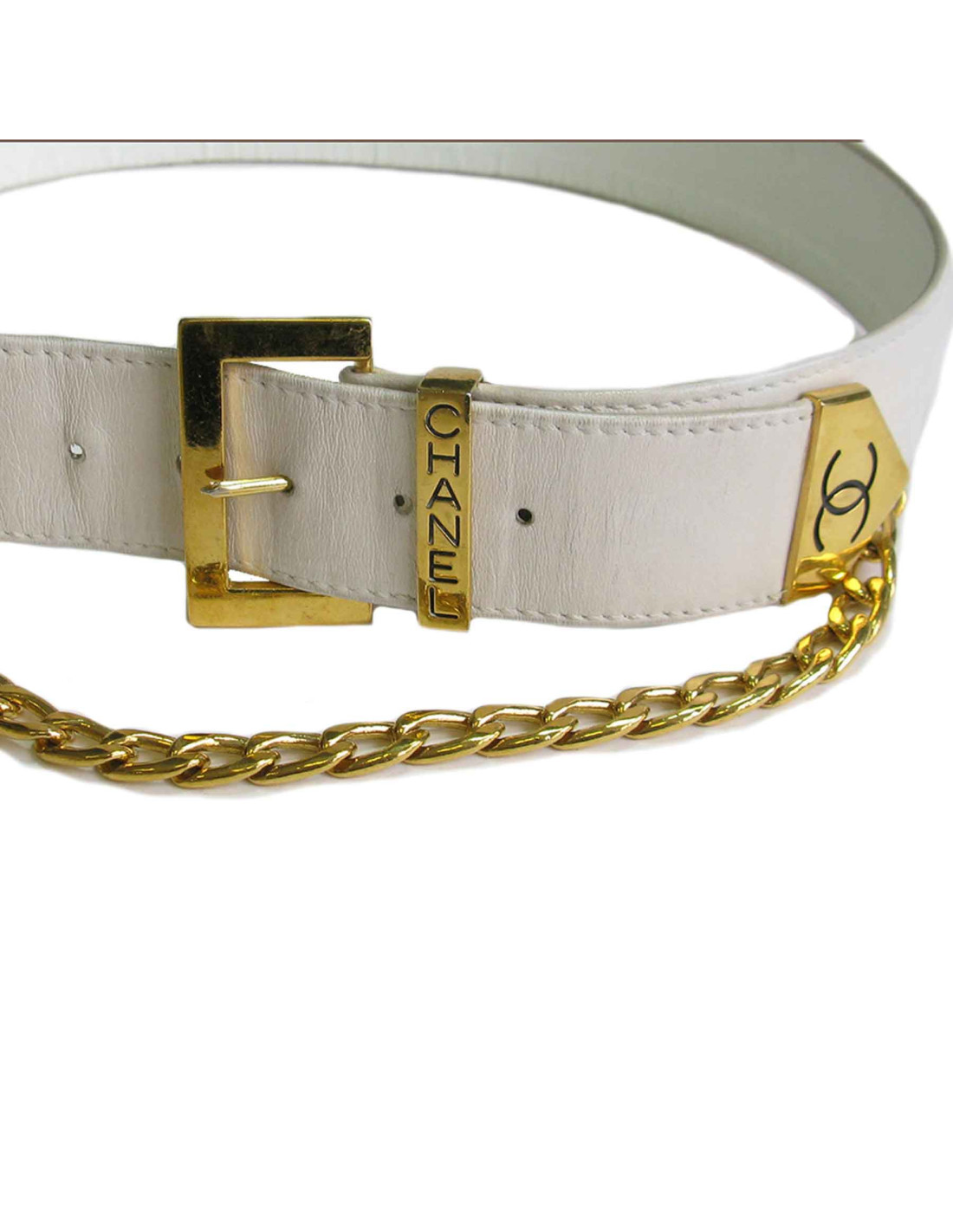 Ceinture Chanel en cuir blanc et chaîne en métal doré. Fermoir en métal doré. CHANEL inscrit sur le fermoir. Une pièce dorée termine la ceinture.
