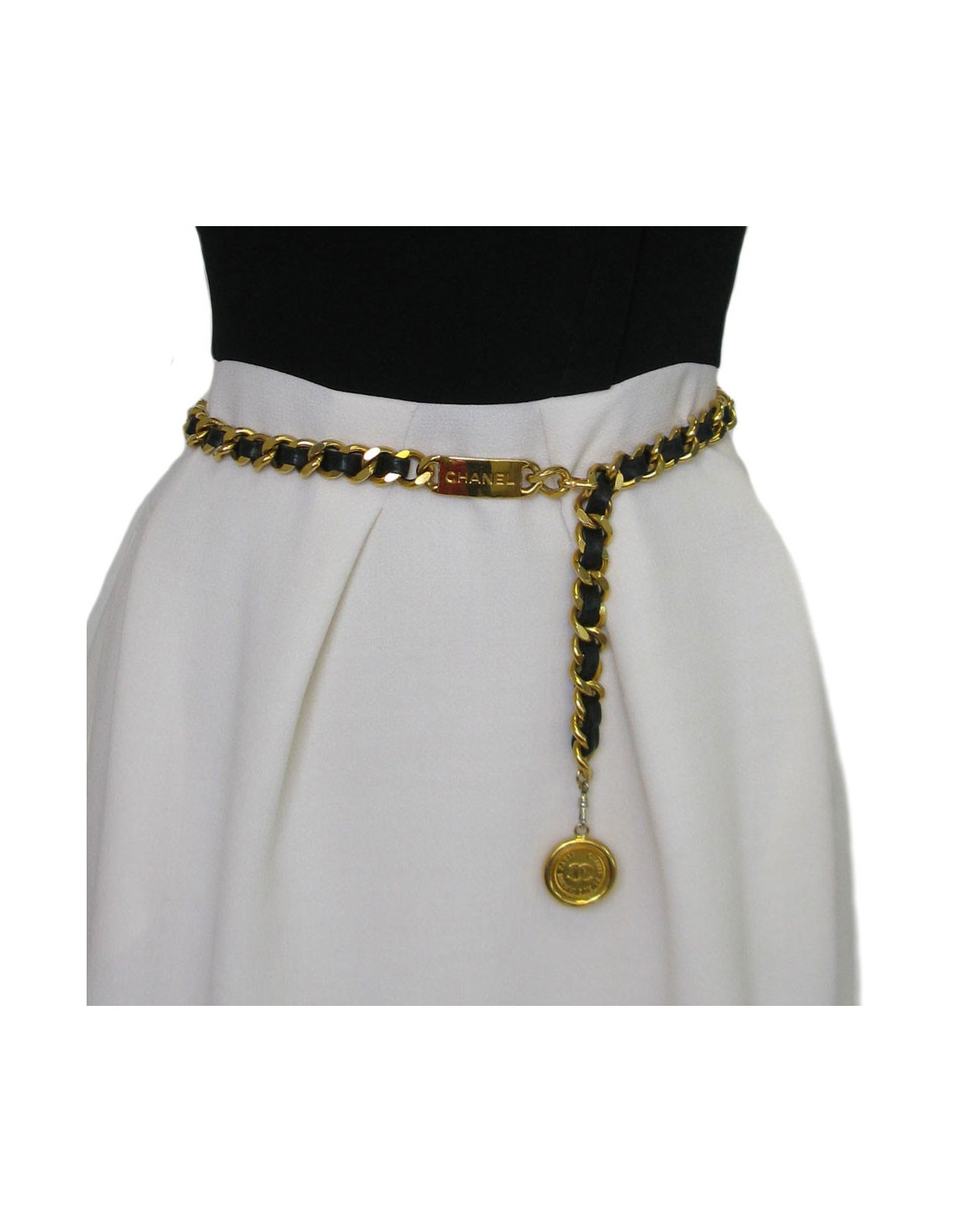 Très belle ceinture Chanel, chaîne en métal doré entrelacée de cuir noir. CHANEL gravé sur une plaque en métal doré. Une pièce