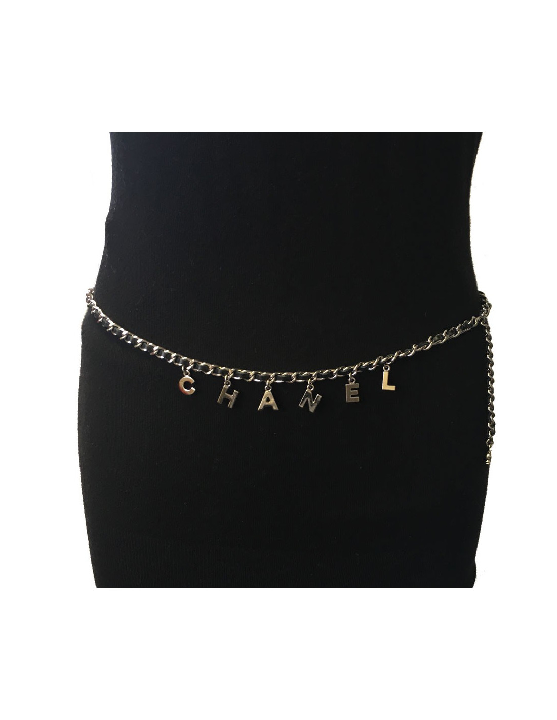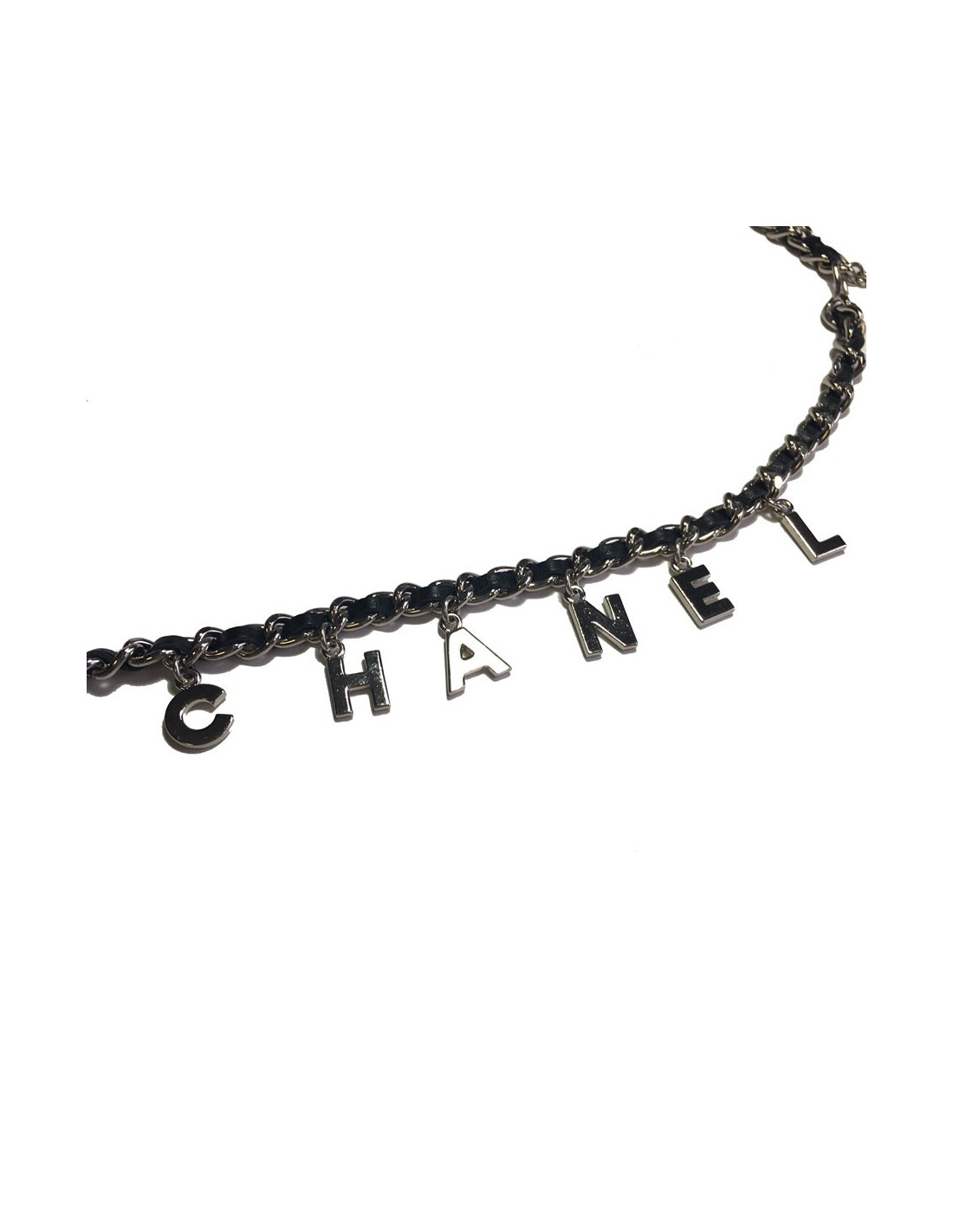 Ceinture CHANEL chaîne en métal argenté entrelacée de cuir noir. Charms lettres CHANEL en métal argenté.