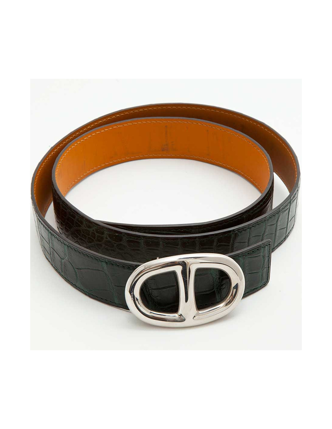 Ceinture Hermès Made in France, taille 90, en crocodile porosus vert foncé. Boucle chaîne d'ancre. Accastillage en métal argent palladié. Lettre Q dans un carré, année 2013. .