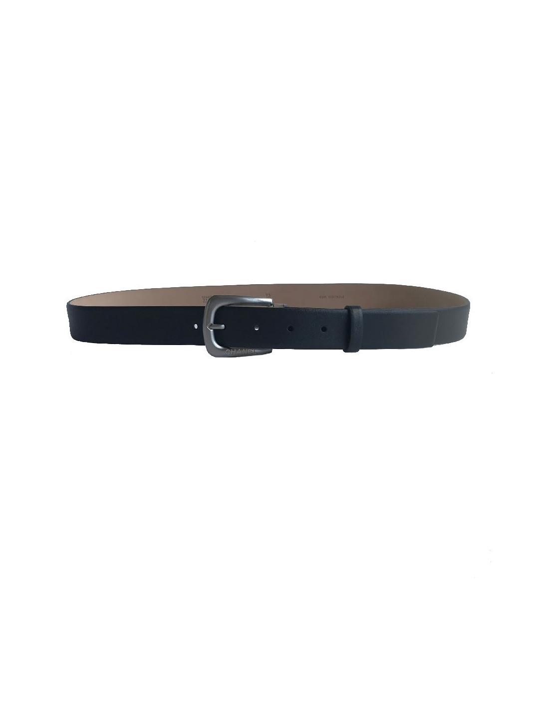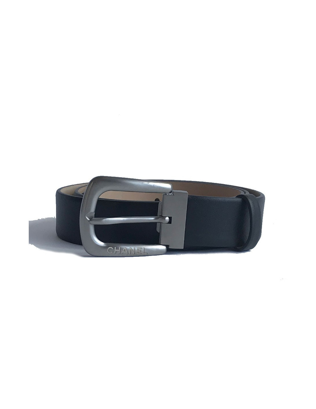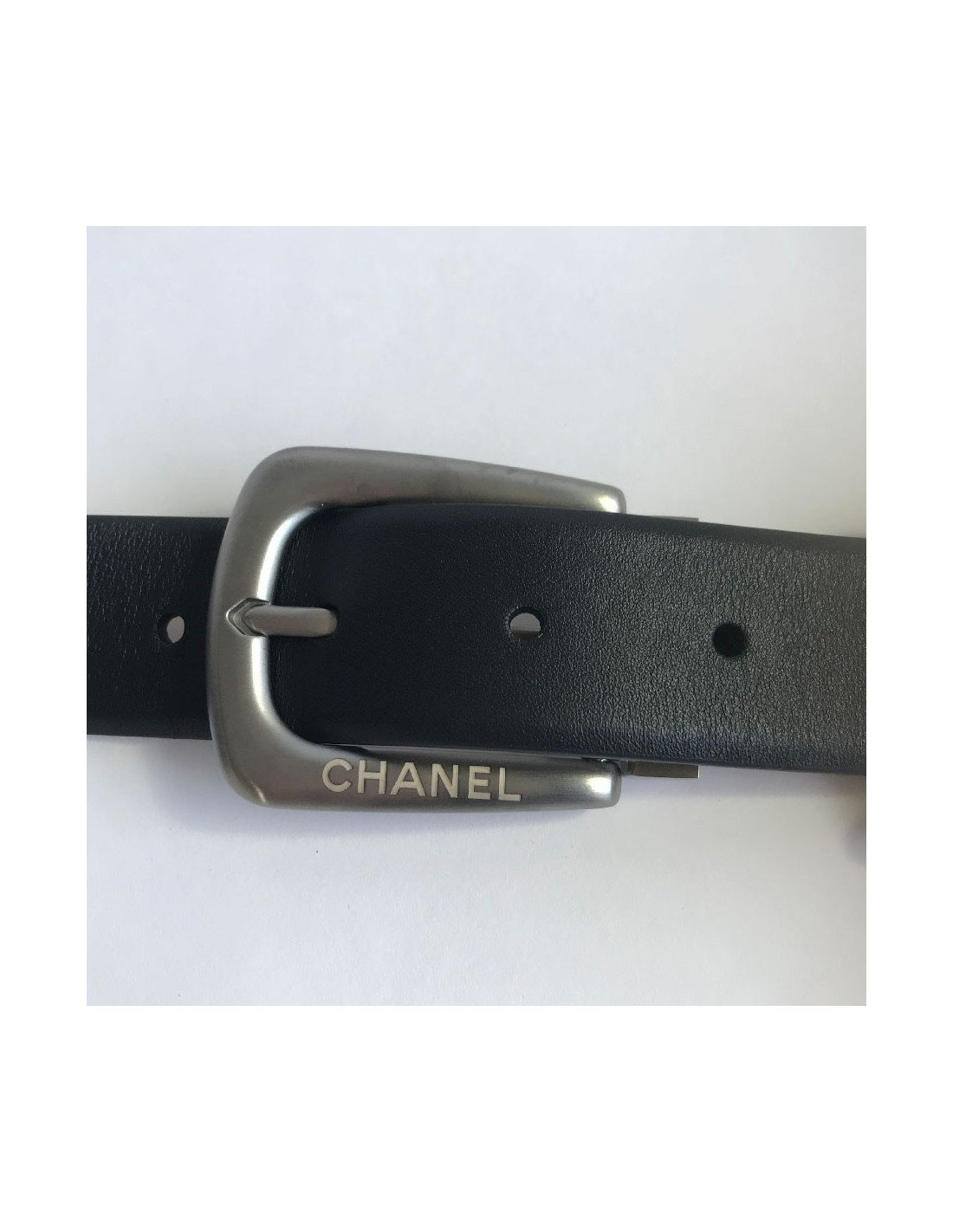 Ceinture Chanel en cuir lisse noir, intérieur en cuir naturel. Boucle en métal argent mat. Inscription CHANEL sur le bas de la boucle. Taille 95/38. Fabrication italienne.