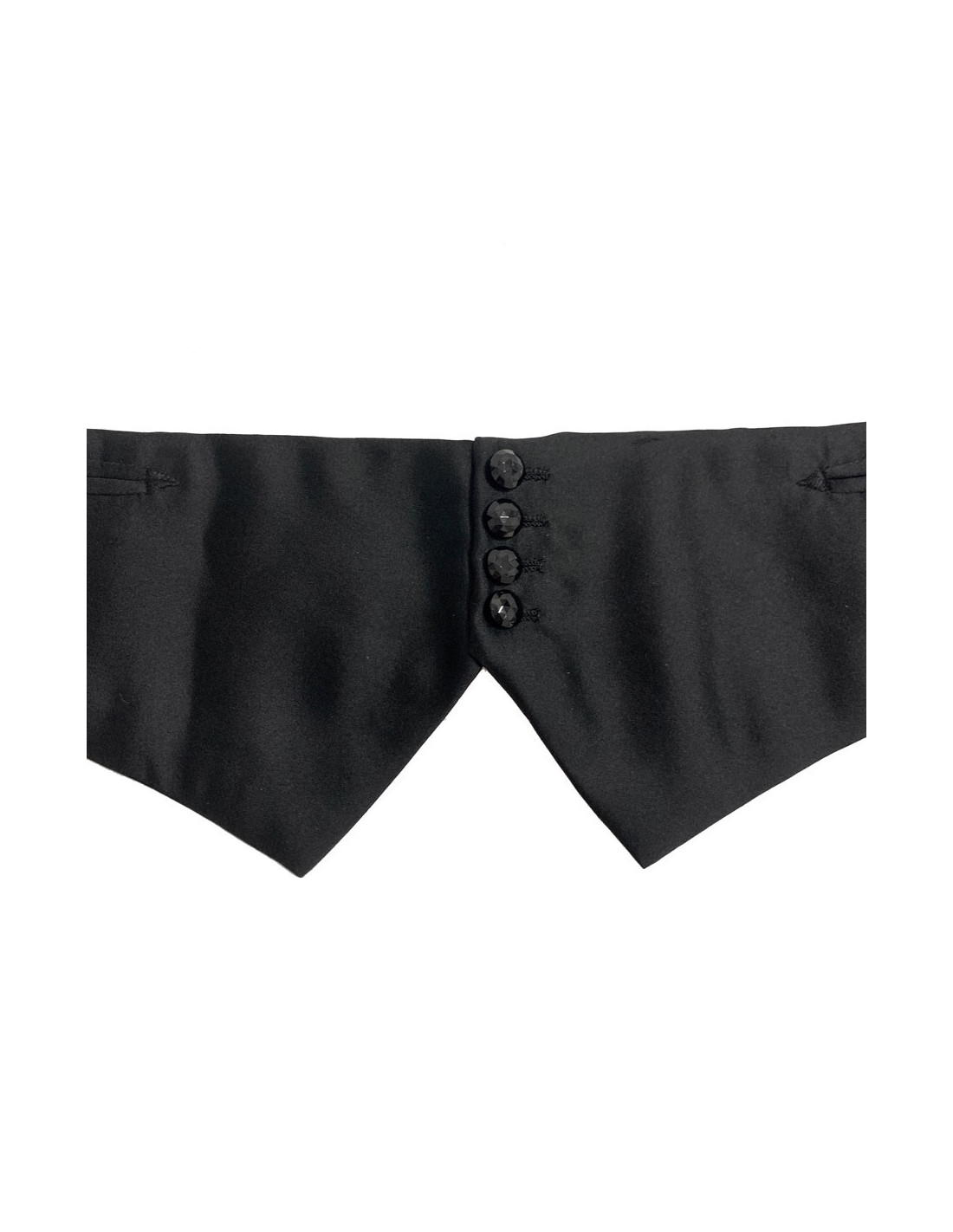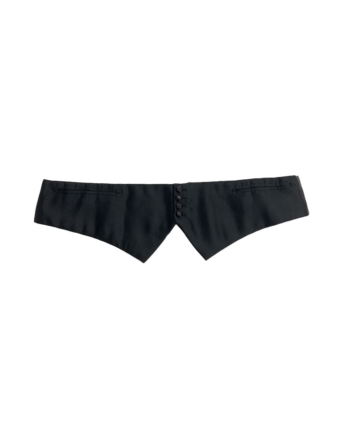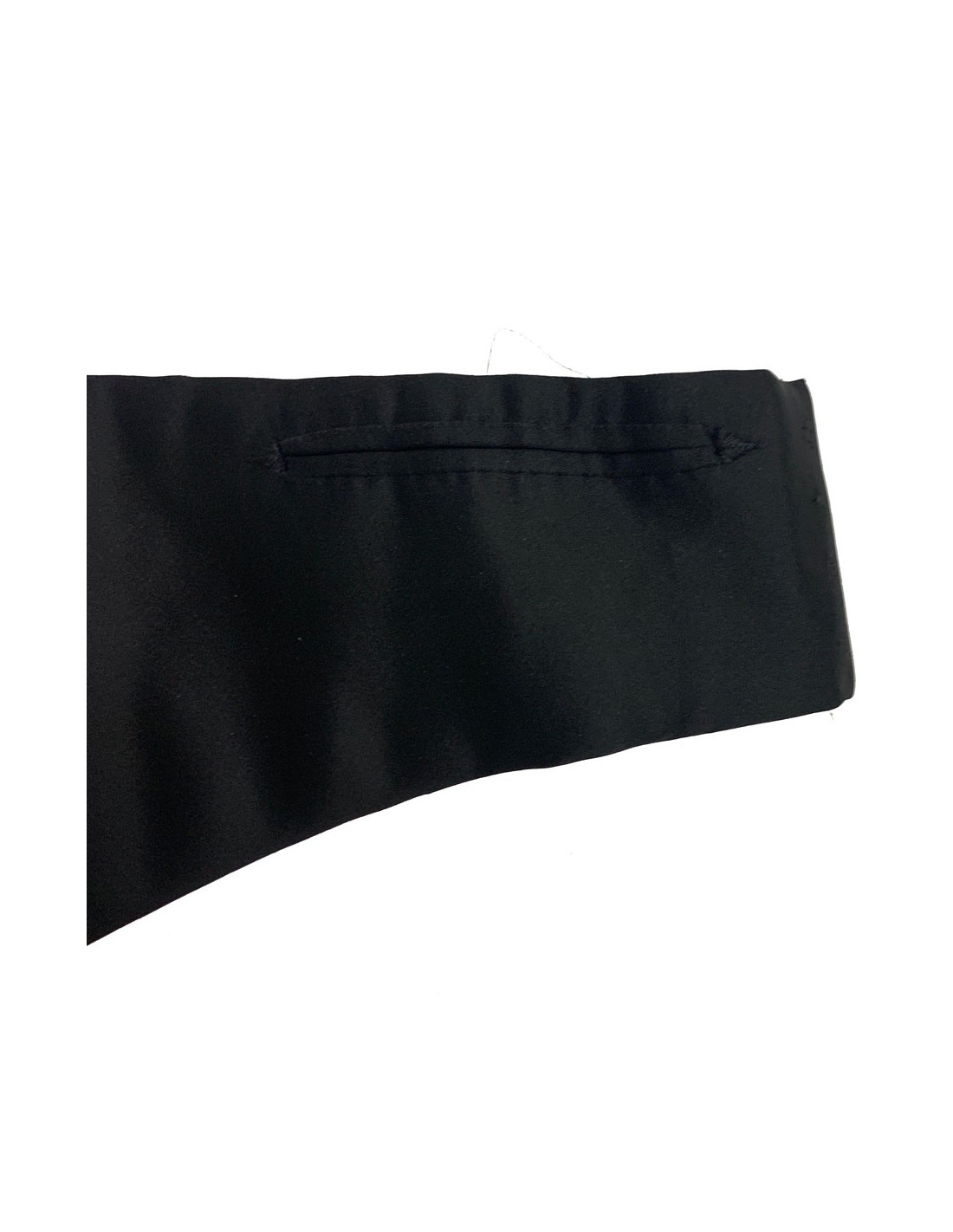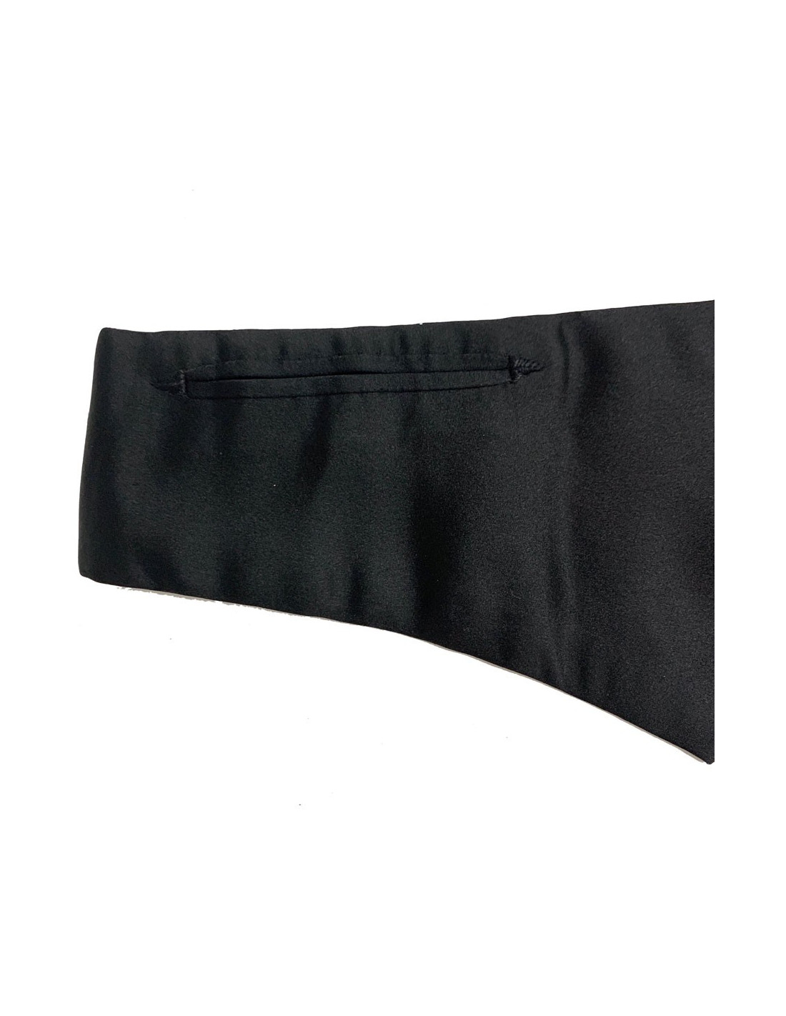 C'est un classique que vous pouvez revisiter. Ceinture LANVIN style ceinture de smoking en soie noire. Elle est doublée en soie beige à l'intérieur. Quatre petits boutons noirs façon pierre facettée se situe au milieu. Il y a 1 fausse poche de chaque côté.