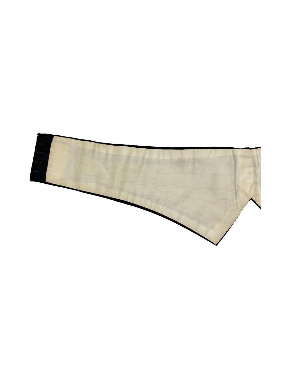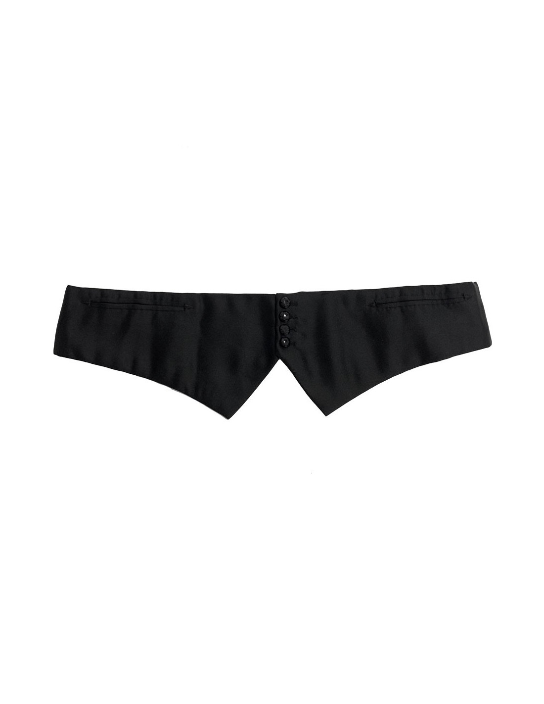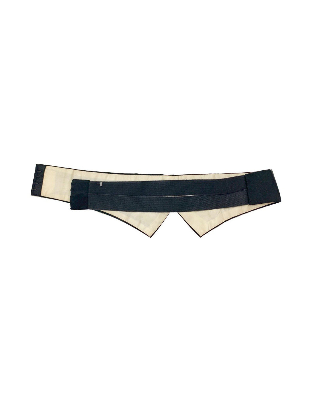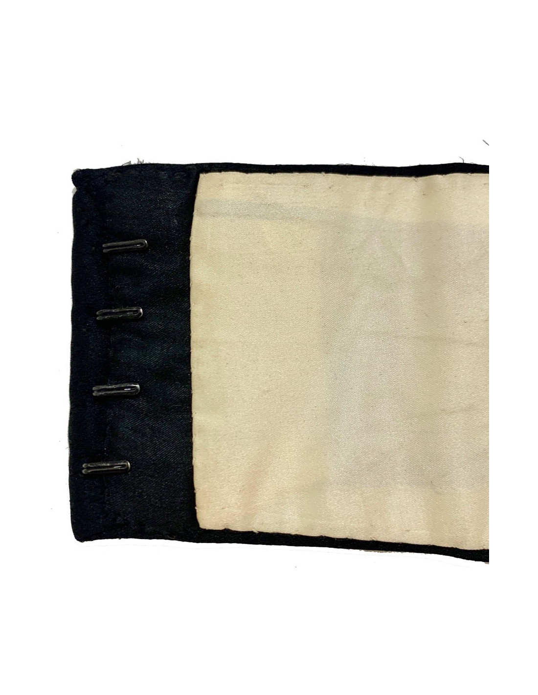 C'est un classique que vous pouvez revisiter. Ceinture LANVIN style ceinture de smoking en soie noire. Elle est doublée en soie beige à l'intérieur. Quatre petits boutons noirs façon pierre facettée se situe au milieu. Il y a 1 fausse poche de chaque côté.