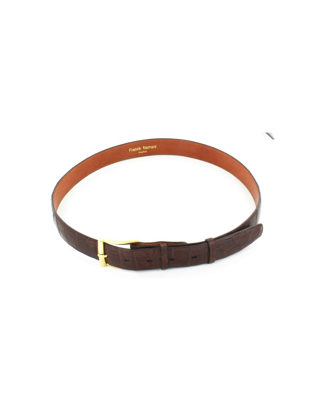 Ceinture FRANCK NAMANI Homme en crocodile véritable marron avec une boucle dorée, intérieur marron, surpiqûres de la même couleur. Simple et élégante, à porter sur un jeans ou sur un pantalon de costume.
