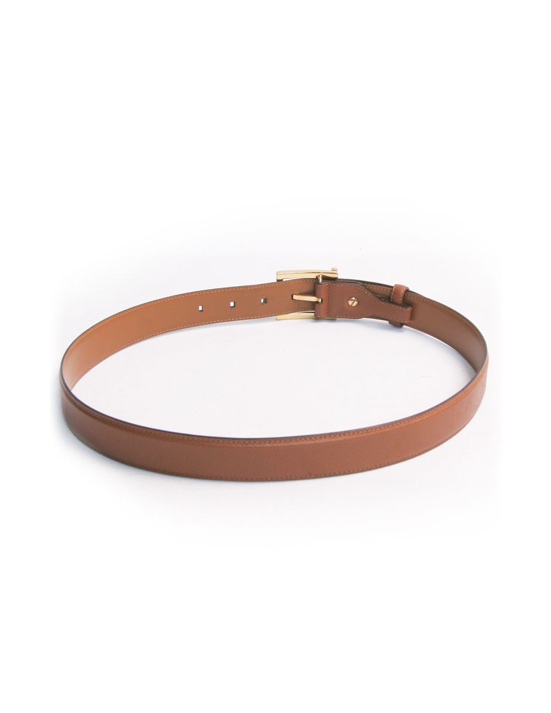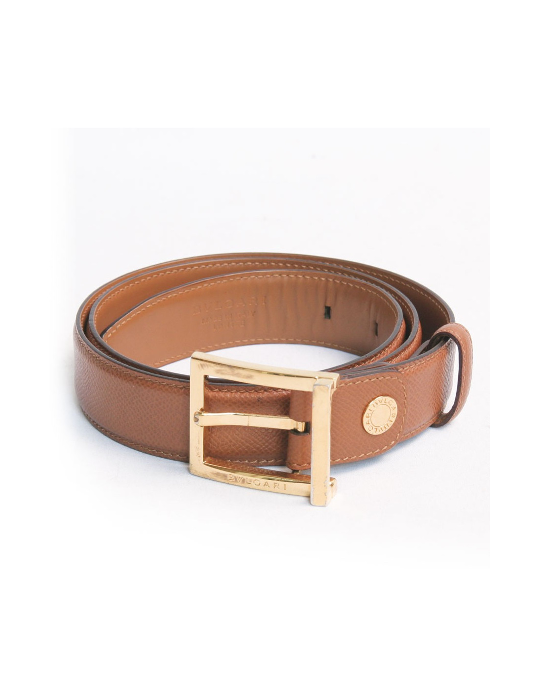 Ceinture Bulgari en cuir grainé gold et boucle dorée, la ceinture a cinq trous de fermeture, aucune trace d'usure, elle est en très bon état.