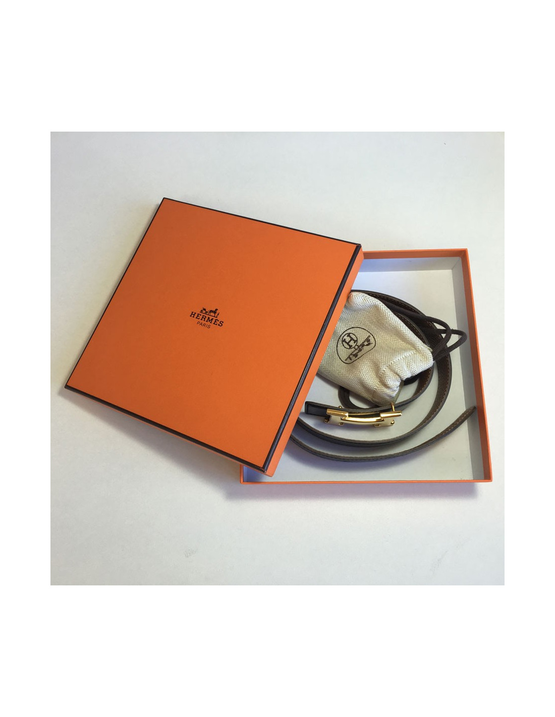 Livrée dans sa boîte HERMES avec un pochon pour la boucle H dorée