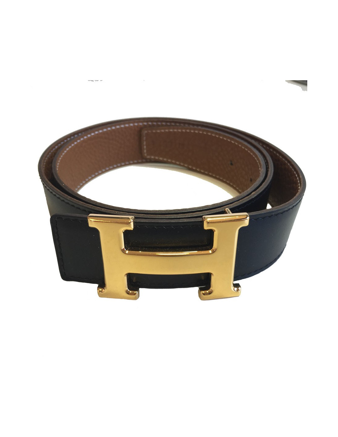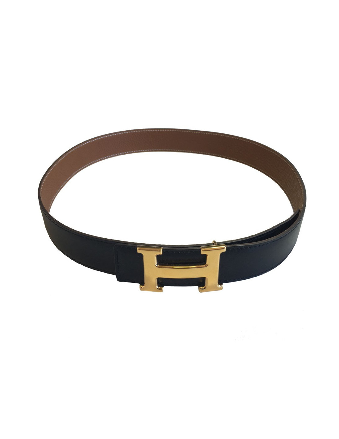 Ceinture HERMES réversible en cuir box noir et cuir togo gold, bijouterie H en métal doré. Taille 85.