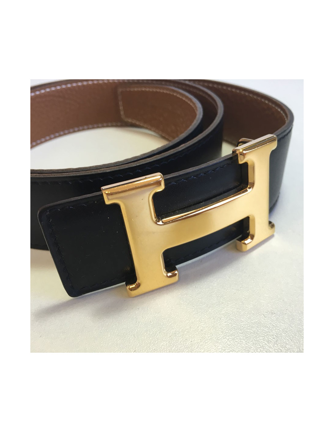 Ceinture HERMES T 85 réversible en cuir box noir et cuir togo gold