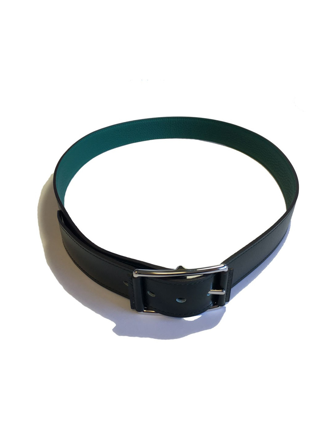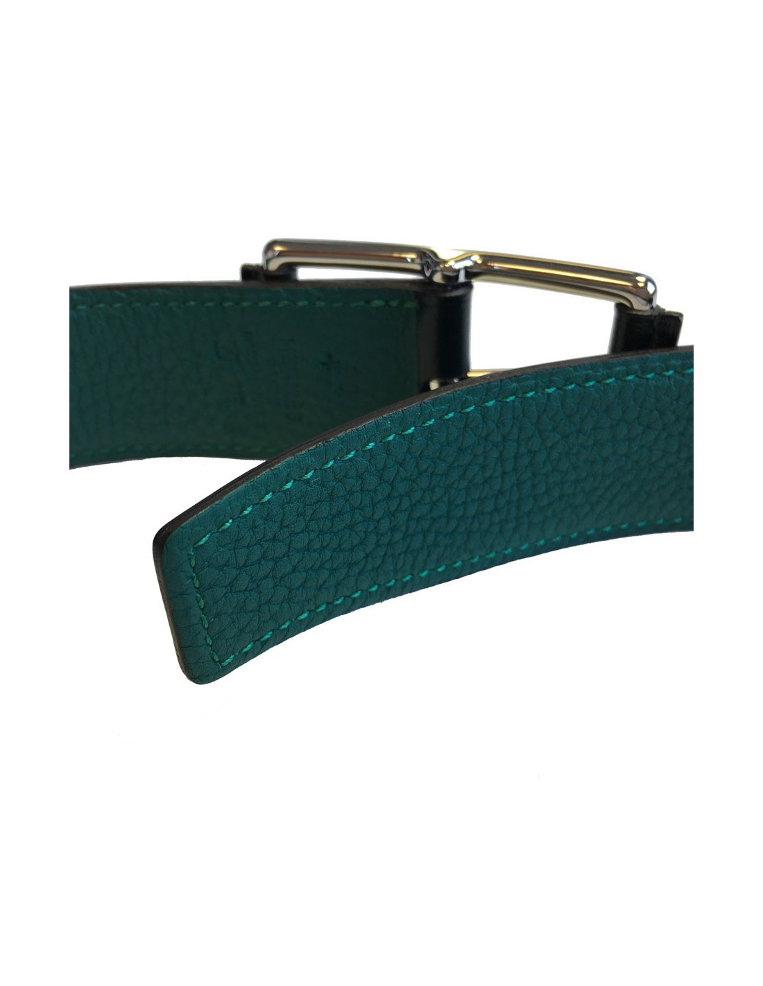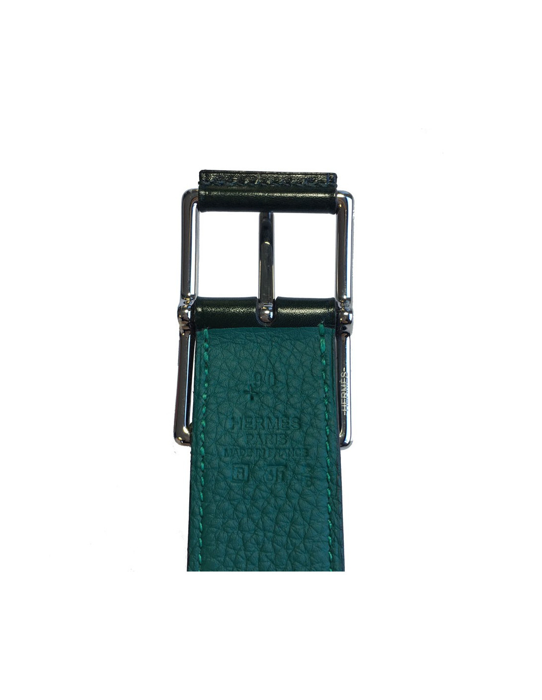 Ceinture HERMES "Hop" en veau box et togo vert foncé et malachite et boucle en laiton palladié. Taille 90.