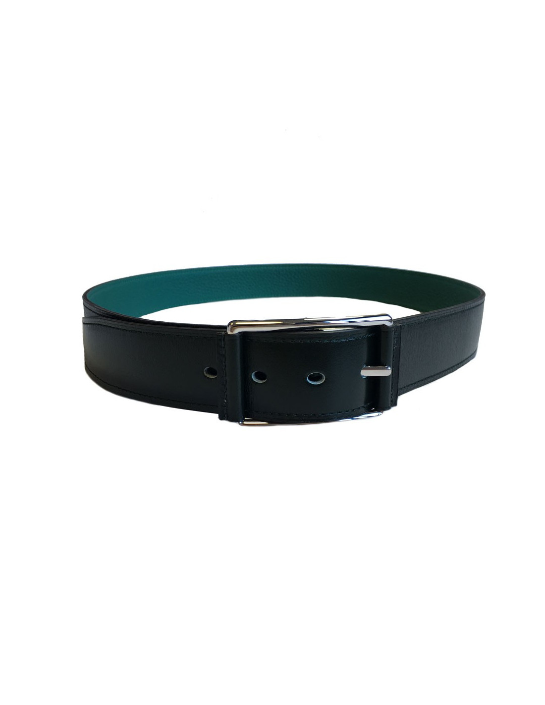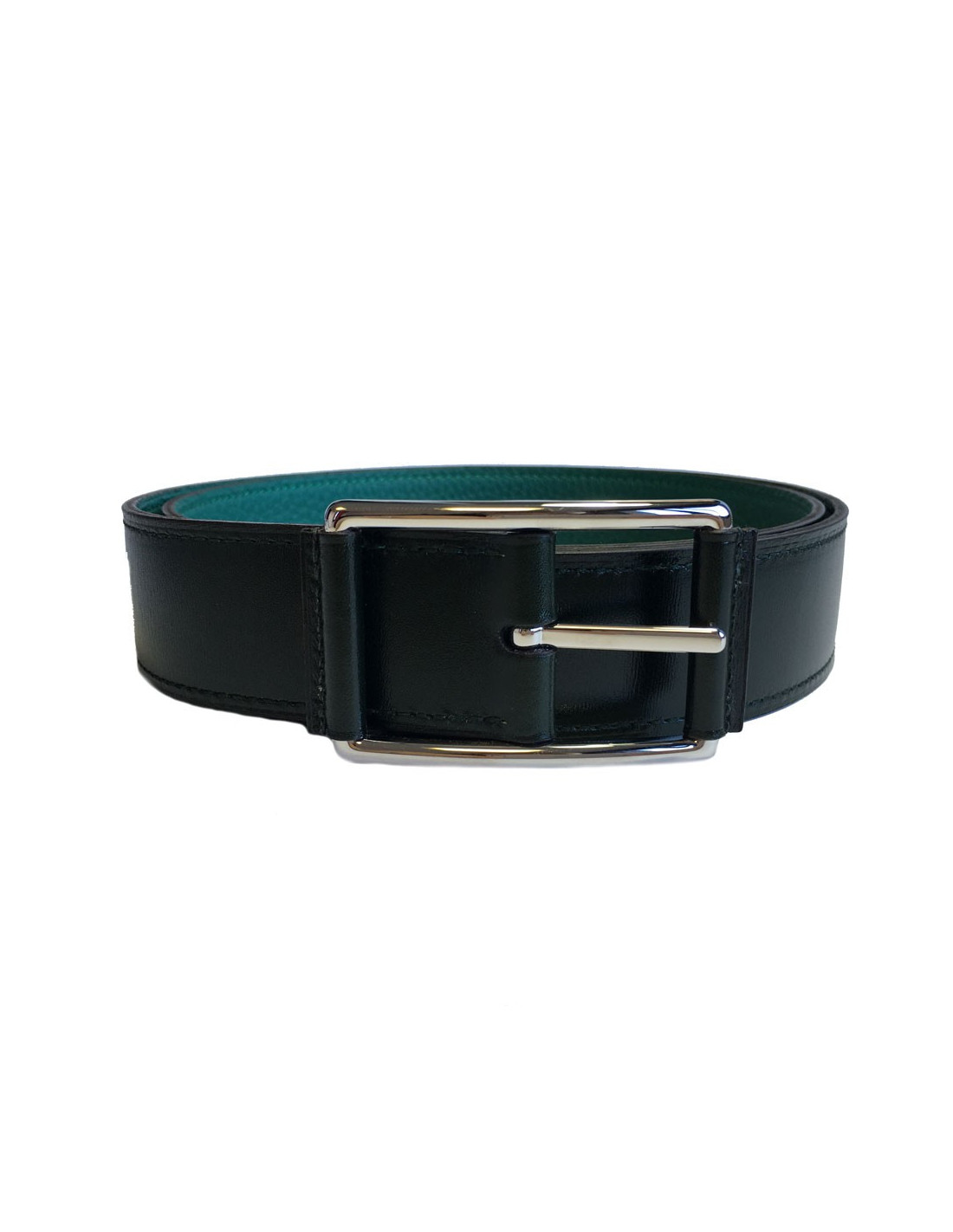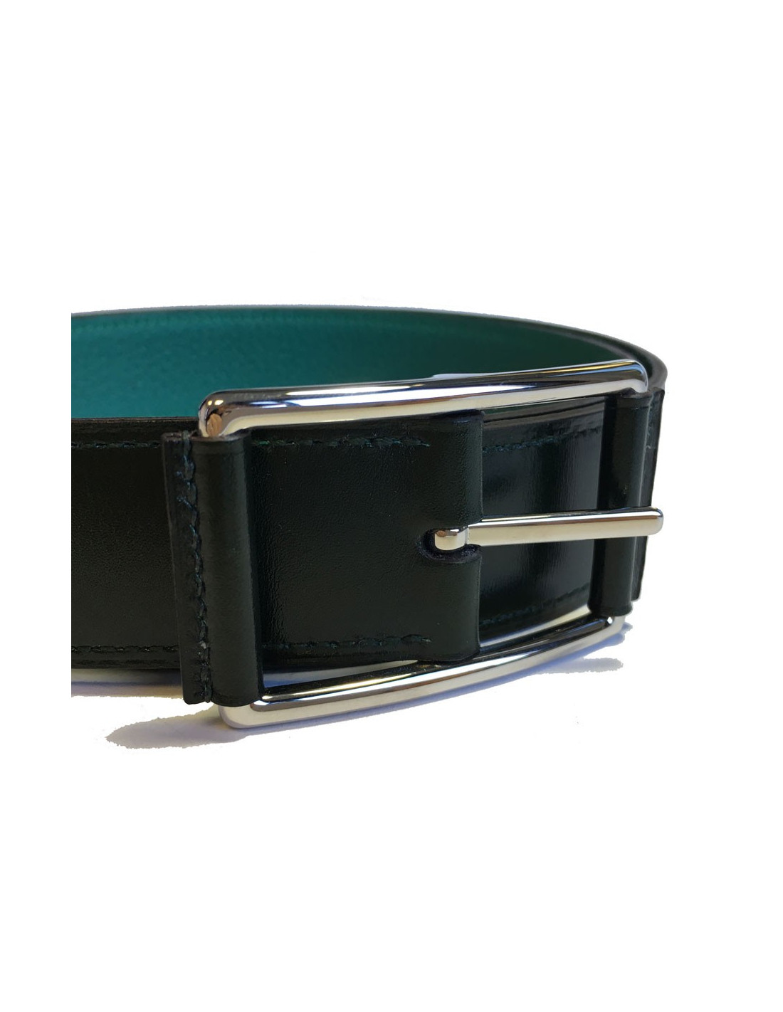 Ceinture HERMES "Hop" en veau box et togo vert foncé et malachite et boucle en laiton palladié. Taille 90.