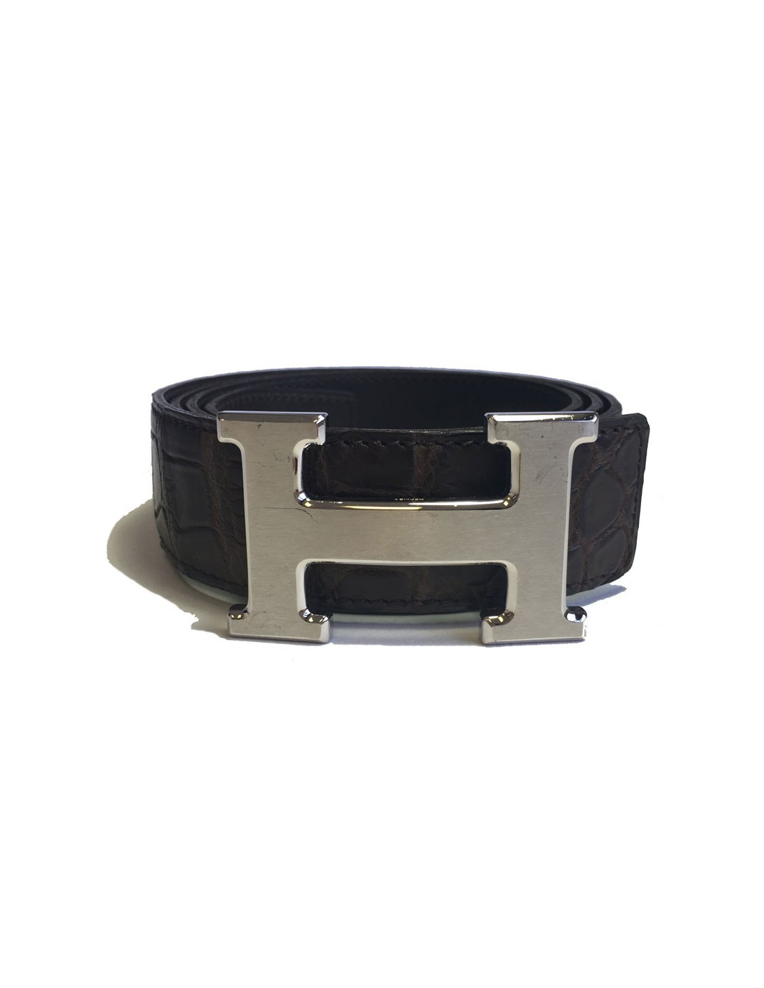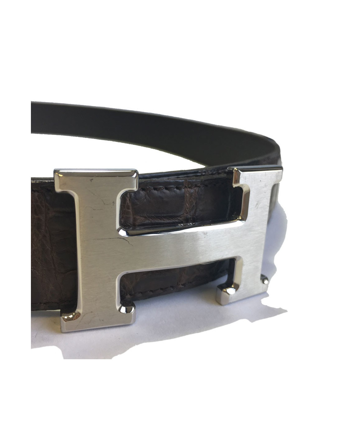 Ceinture Hermès homme en crocodile porosus marron, boucle H en argent palladié brossé. La ceinture n’a jamais été portée. Petites marques sur la boucle (voir photo); Taille 95