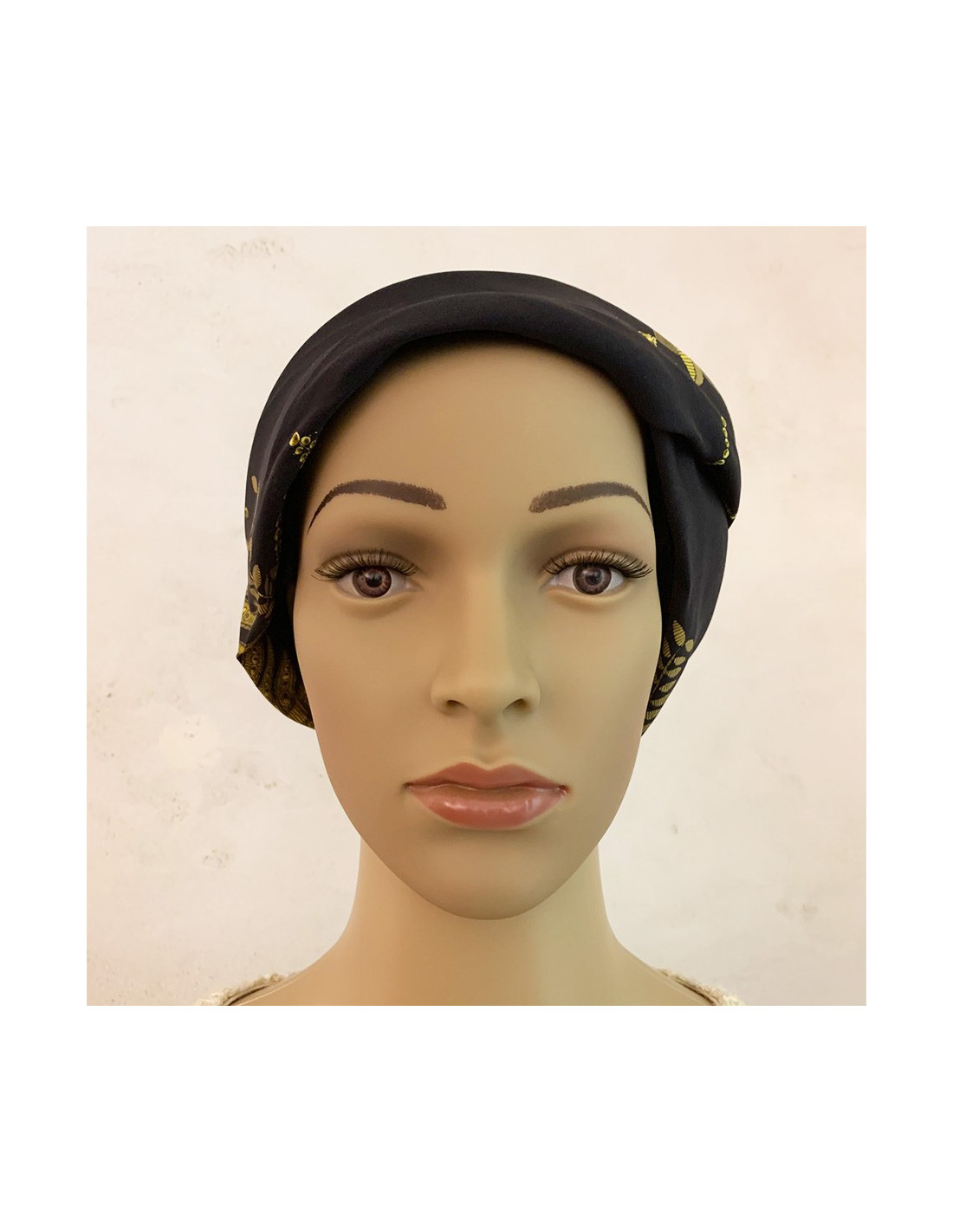 Le chapeau est de la Maison HERMES. Il est semblable a un foulard que l'on aurait noué autour de la tête. Pour une élégance à toute épreuve.