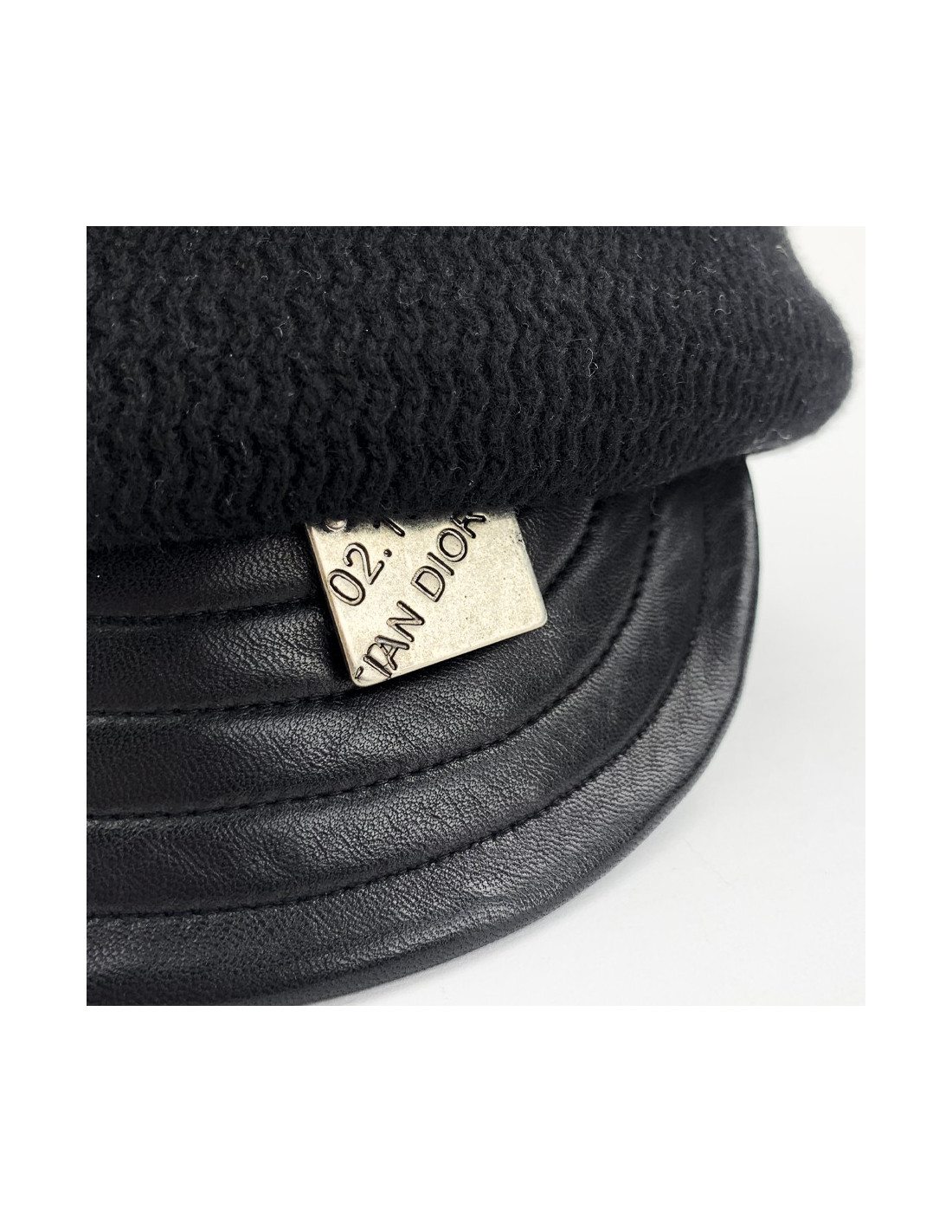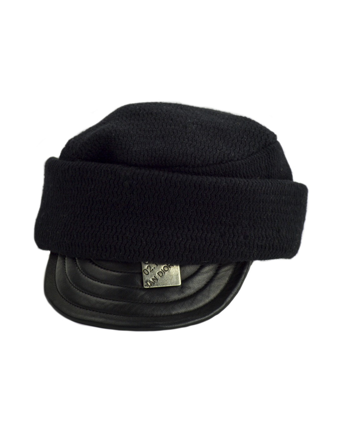 La casquette est de la Maison CHRISTIAN DIOR. Elle est en cachemire noir avec une visière en cuir noir portant un plaque en métal argenté sur laquelle nous trouvons l'inscription 02.194 DIOR.