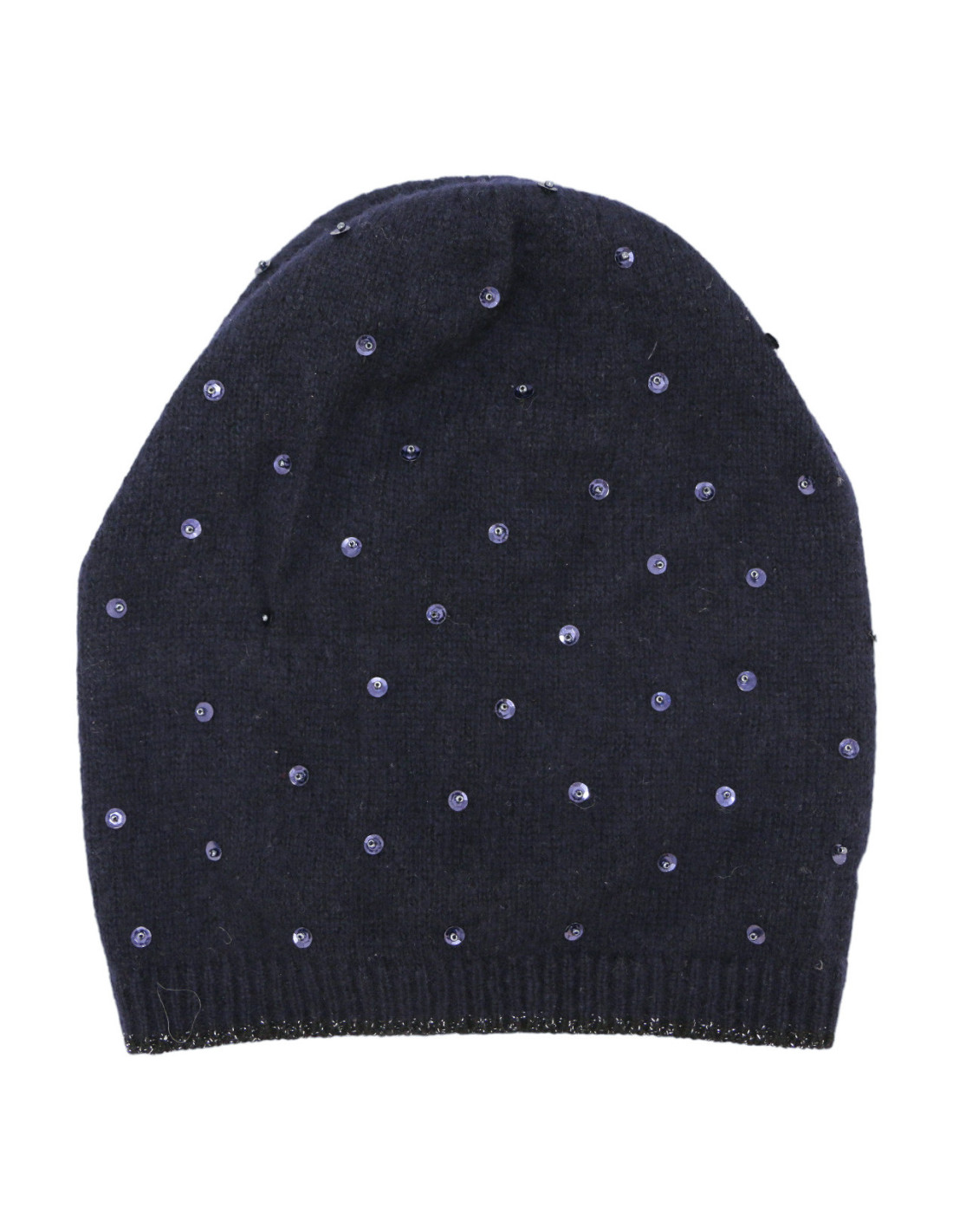 Détails : bonnet en cachemire bleu nuit avec des sequins, aucune usure . Un gros CC gansé de perles. Présence des étiquettes de marque et de composition.