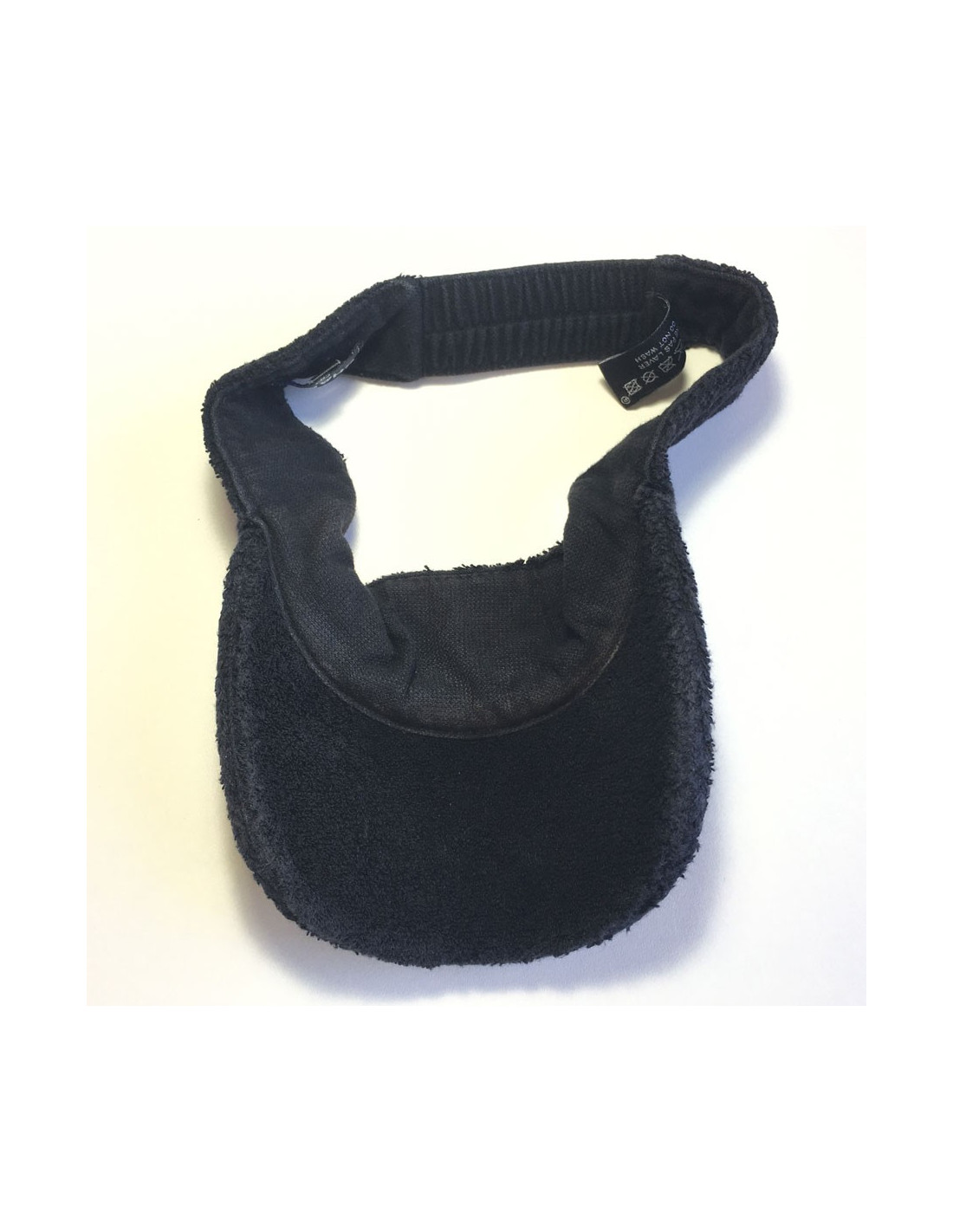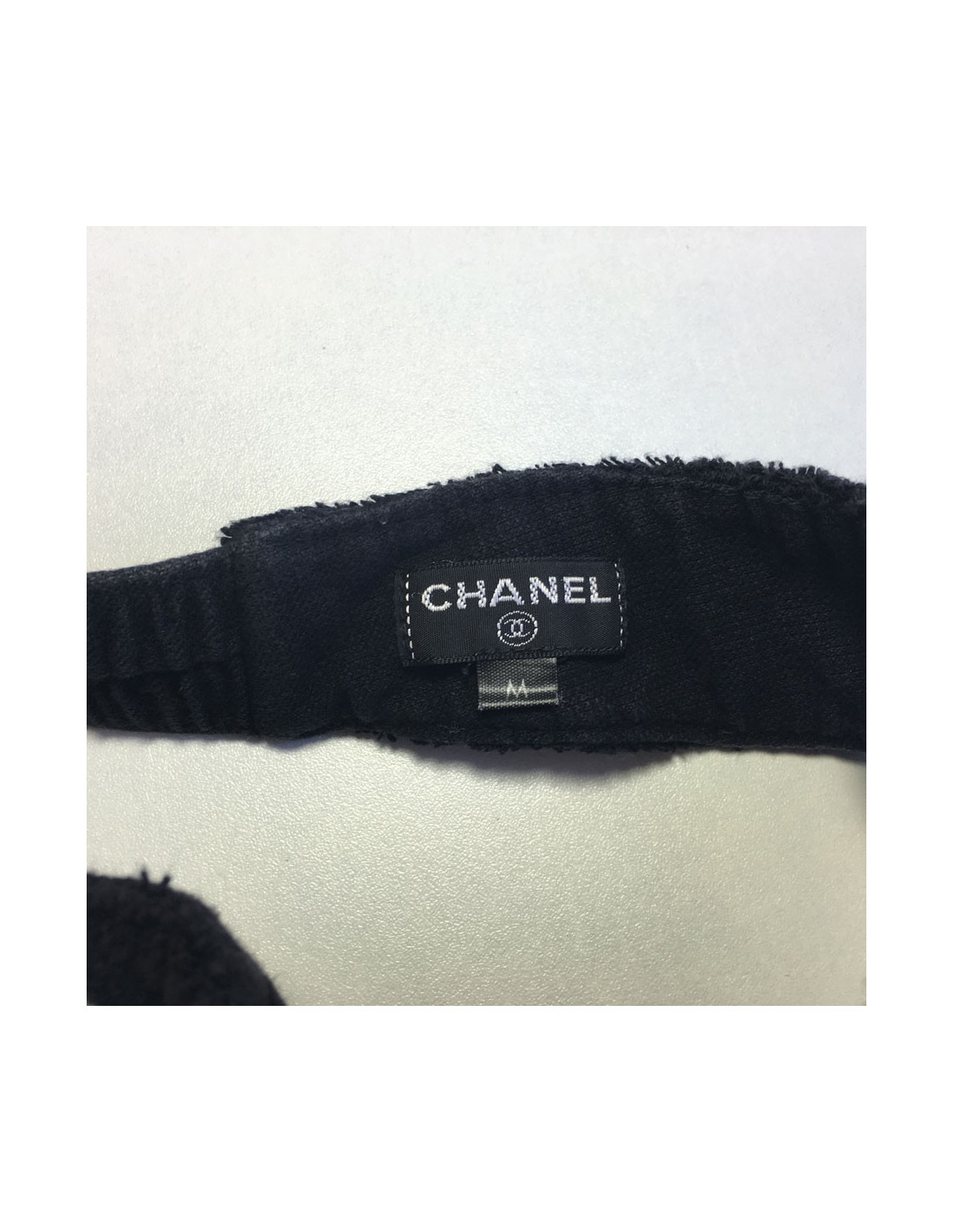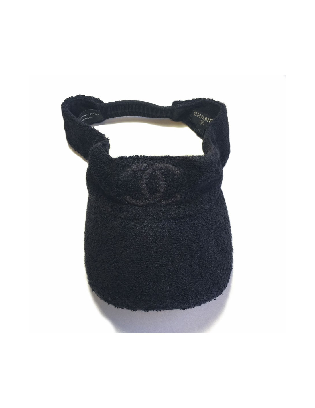 Visière CHANEL en coton éponge noir, bande élastique. Taille M. Etiquette de matière et de marque présentes.
