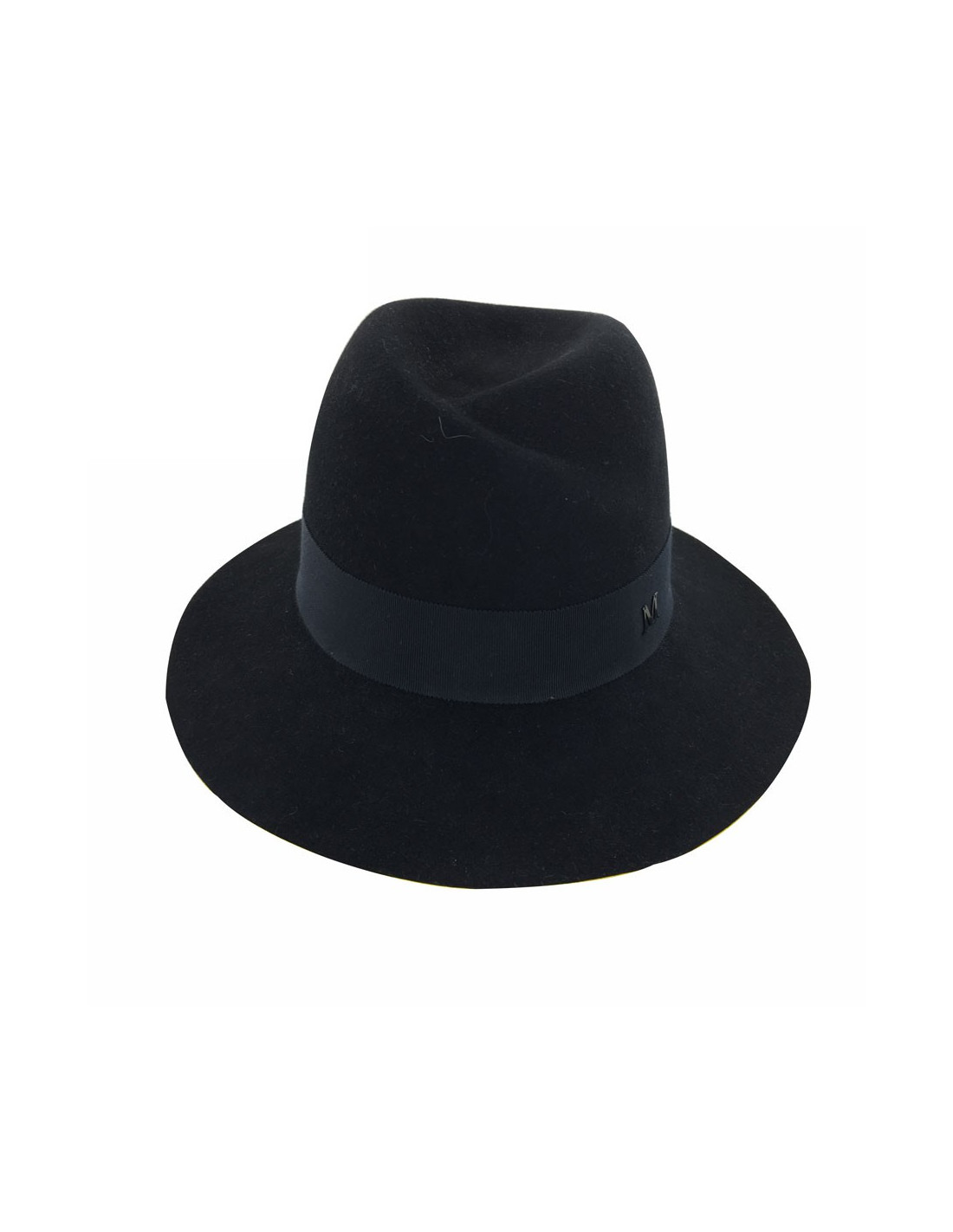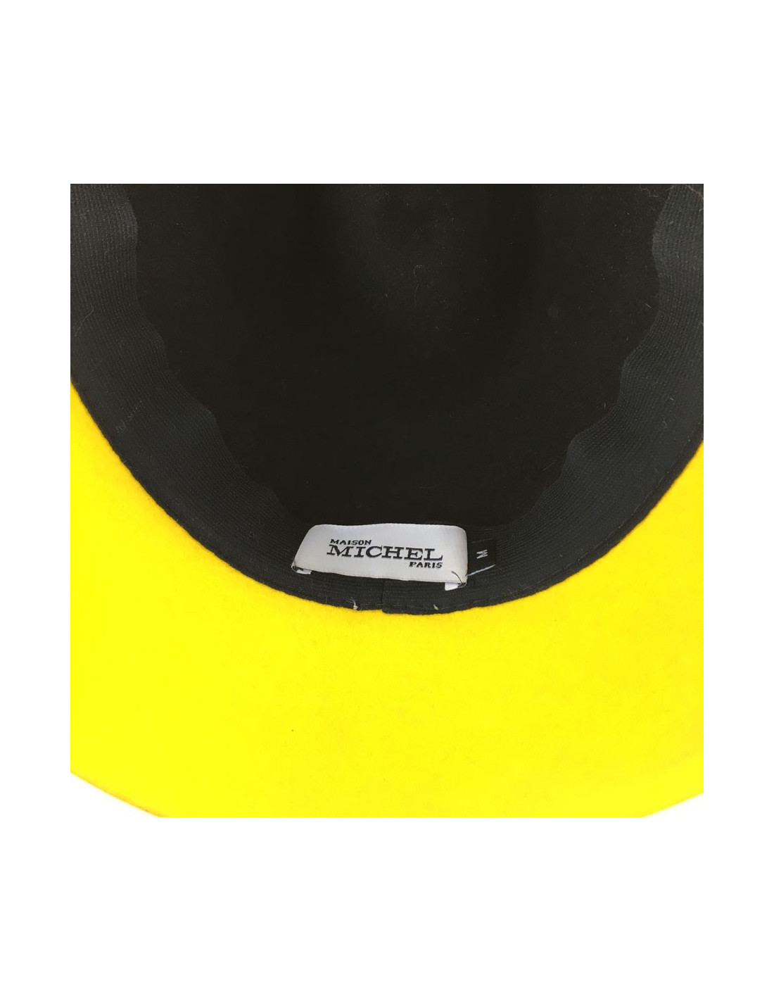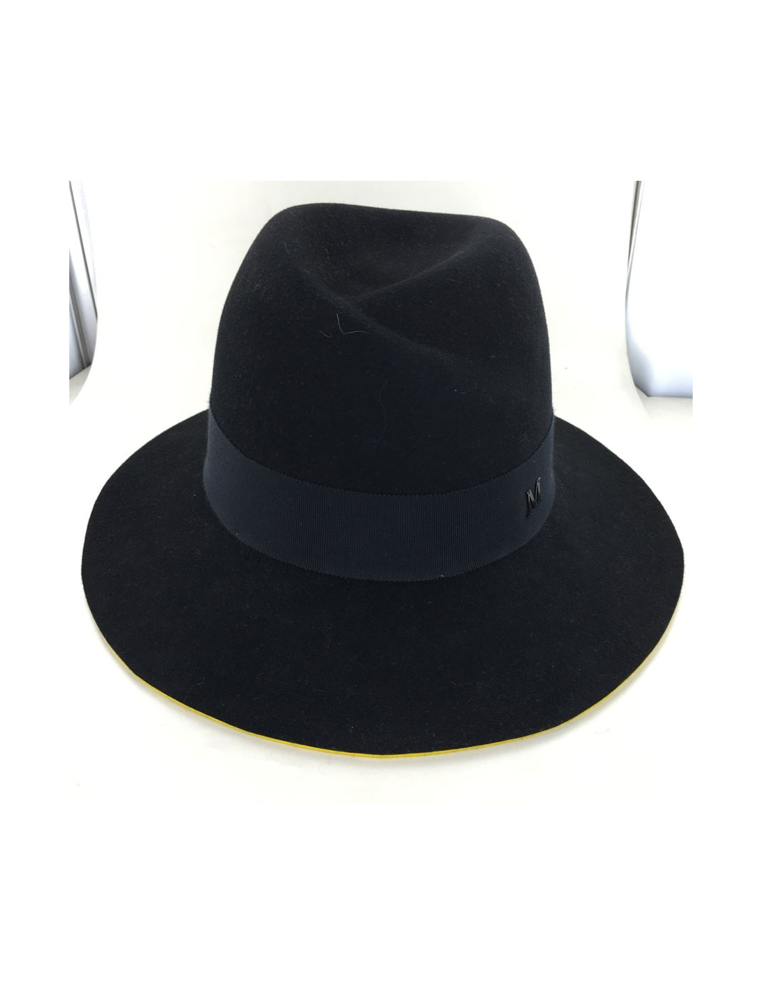 Magnifique feutre "Virginie" Maison Michel taille M, bicolore noir et jaune, à bords renforcés, gros grain noir (4 cm de large). Gros grain réhaussé d'un charm M, sigle de la marque. En très bon état.