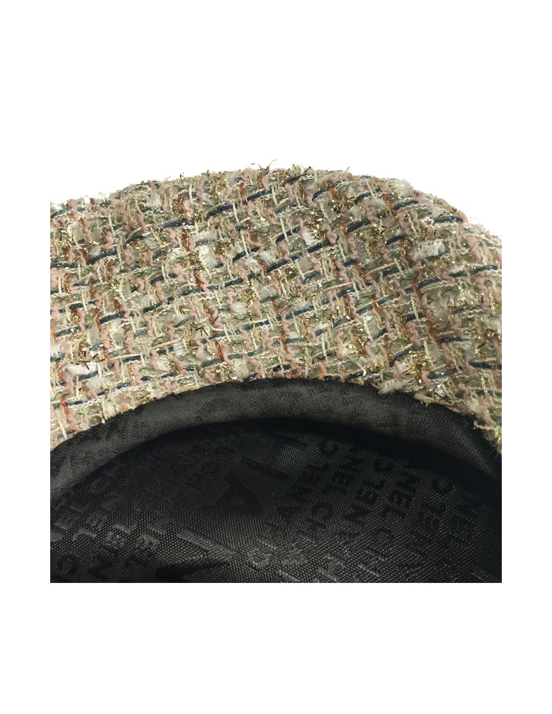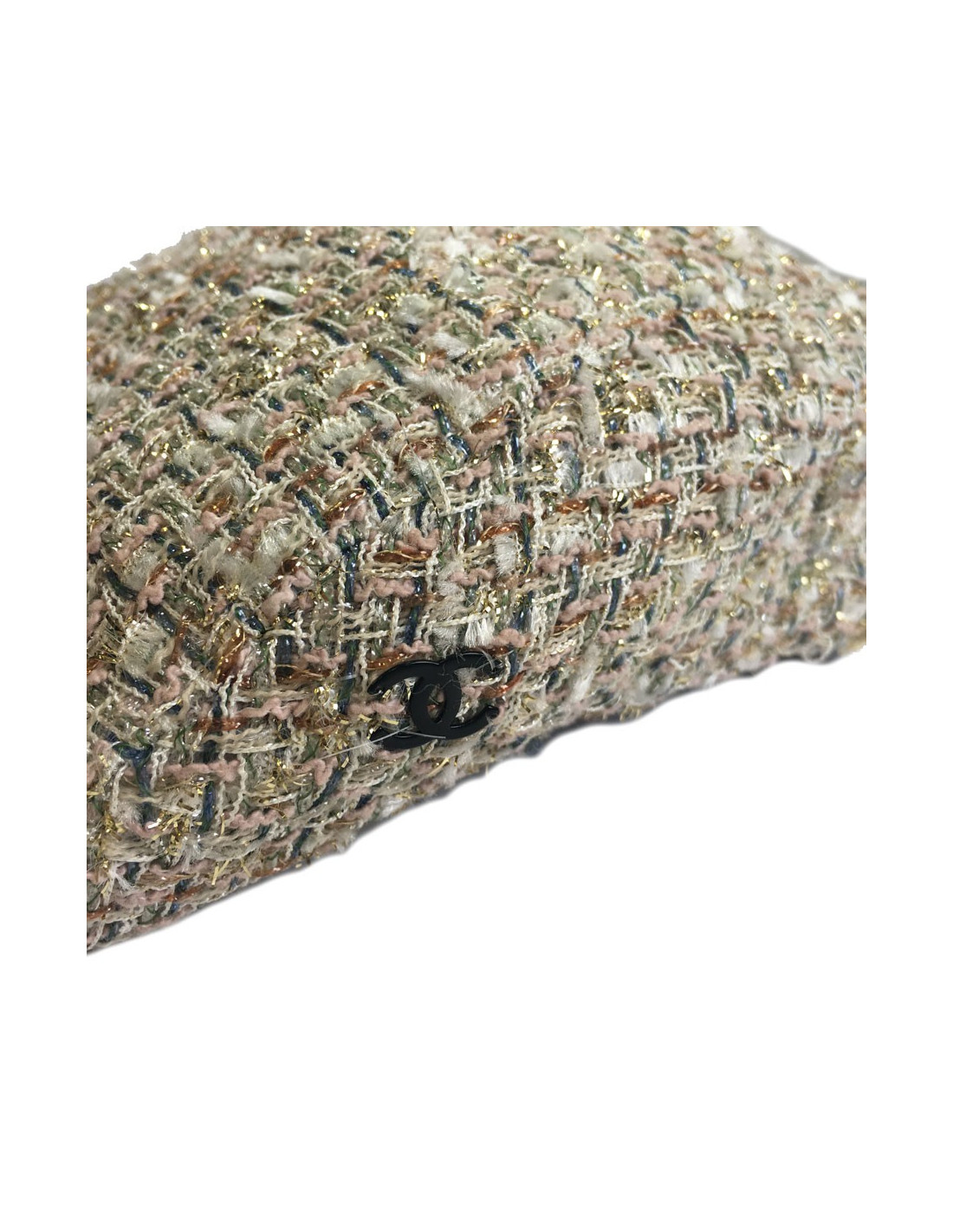 Ravissante casquette Chanel, taille M, en tweed rose, blanc, vert jade, dorées, gris, ambre. Cette multitude de fils entrelacés font de ce beret/casquette un accessoire de mode indispensable et surtout pouvant s’accorder avec une multitude de pièces.