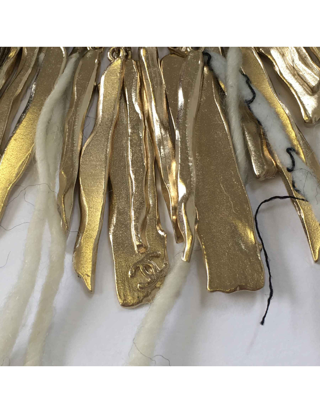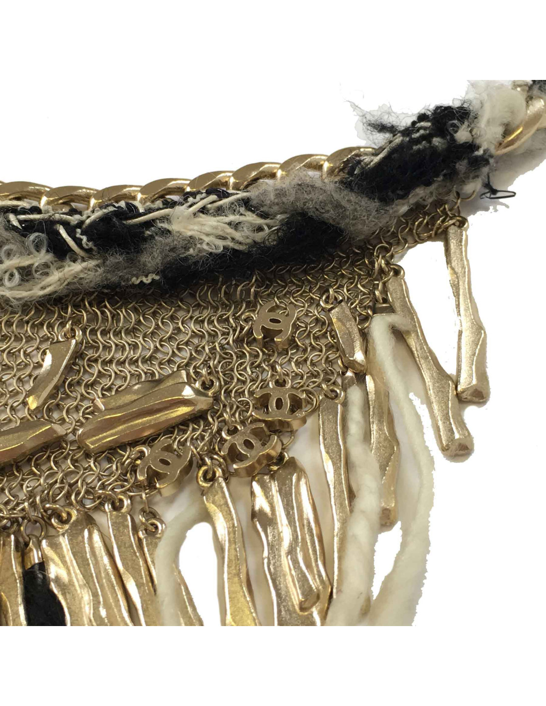 Collier CHANEL en cote de maille en métal doré et chutes de laine