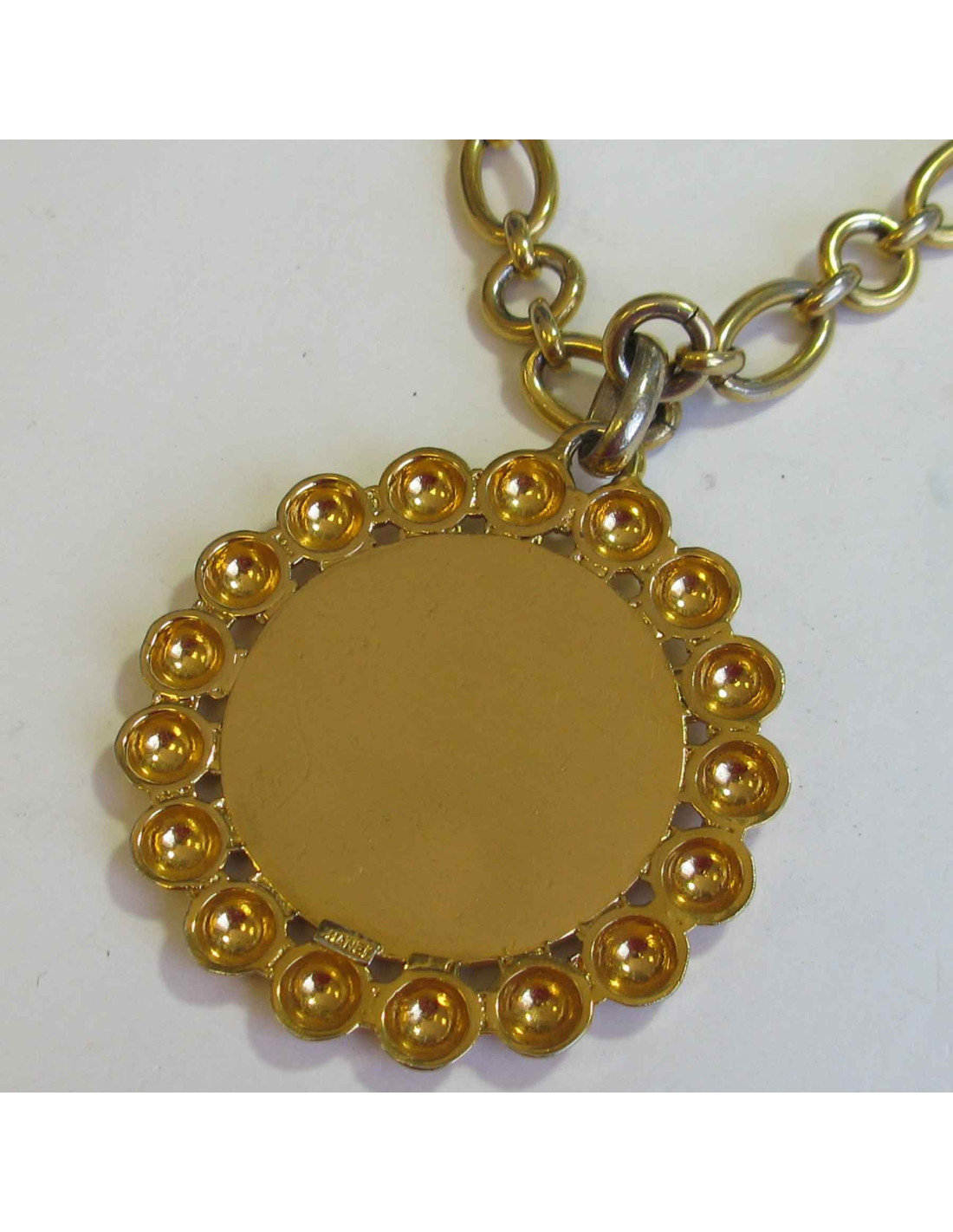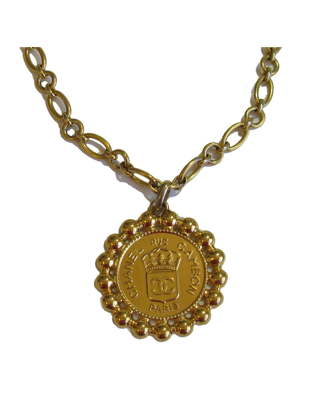 Détails :chaîne à anneau en métal doré, pendentif imposant, rond en métal doré. Inscription CHANEL rue Cambon Paris. Fermoir crochet.