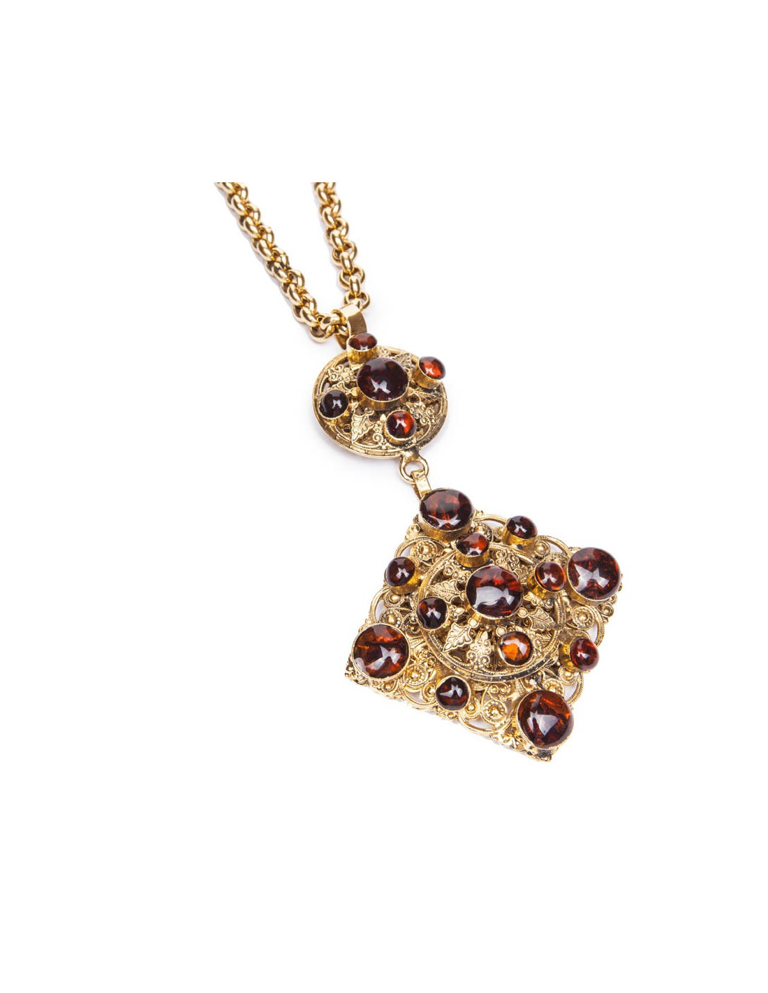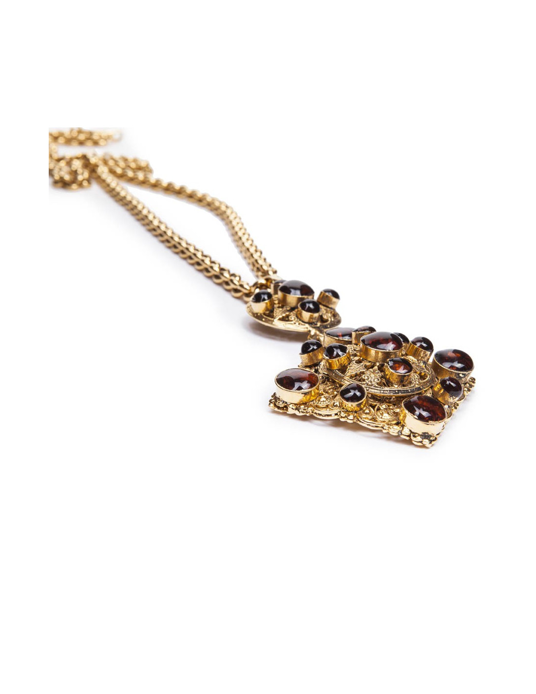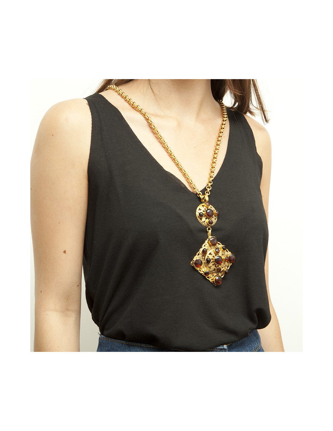 Long collier Couture Marguerite de Valois en métal doré à l'or fin, avec un pendentif en filigrane, sertie de cabochons en pâte de verre topaze. Travail minutieux du métal sur l'envers du pendentif. Etat neuf.