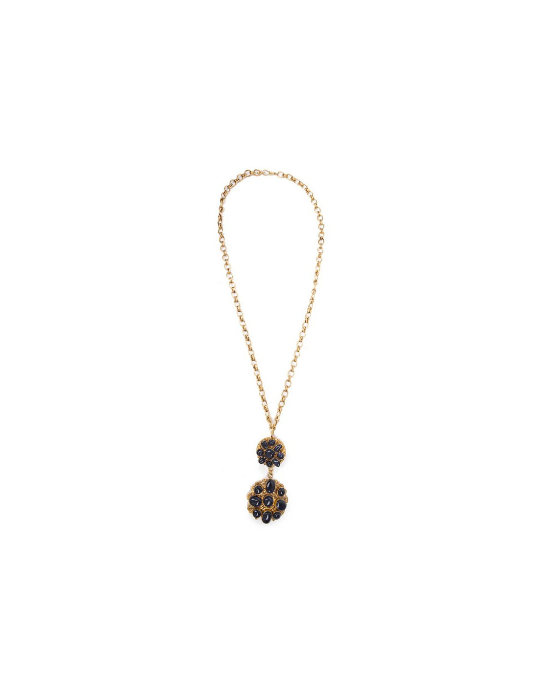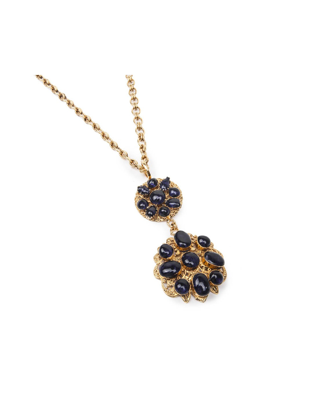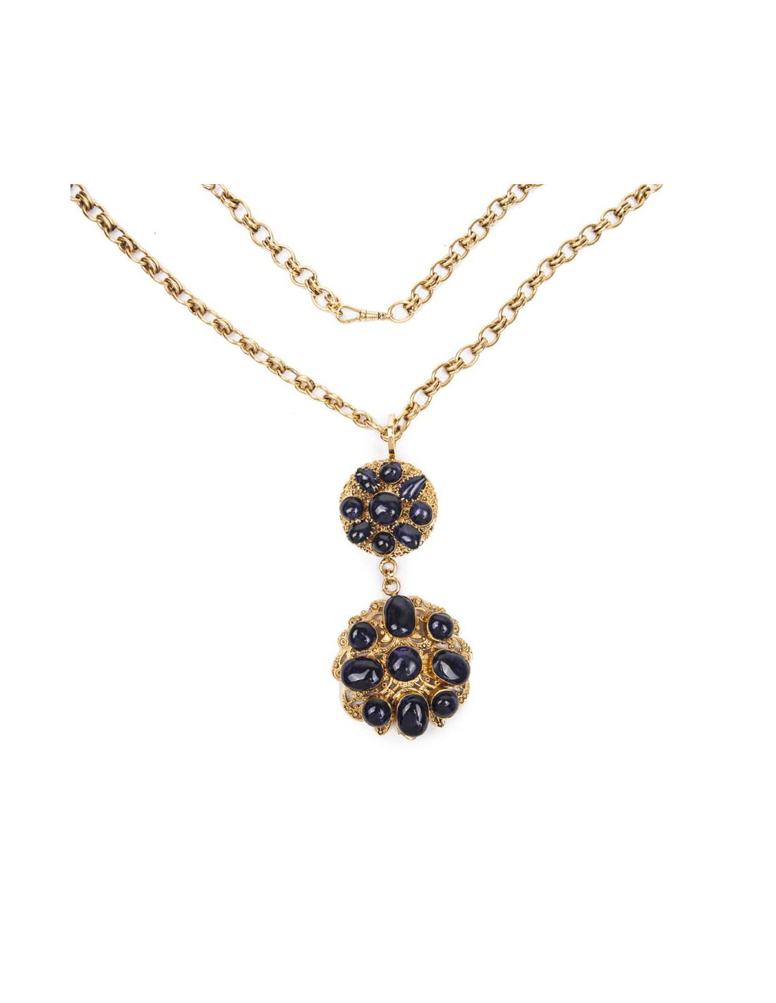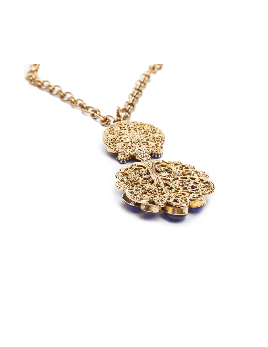 Long collier Couture Marguerite de Valois en métal doré à l'or fin, avec pendentif en filigrane serti de cabochons en pâte de verre saphir. Travail superbe du métal sur l'envers du pendentif. Etat neuf.