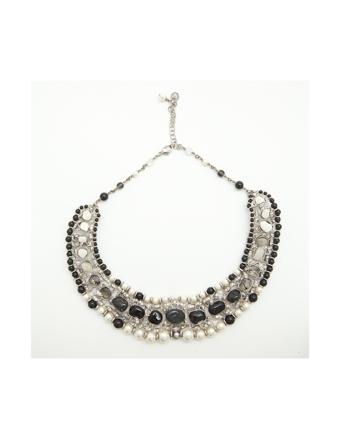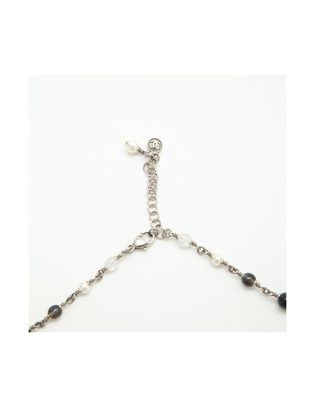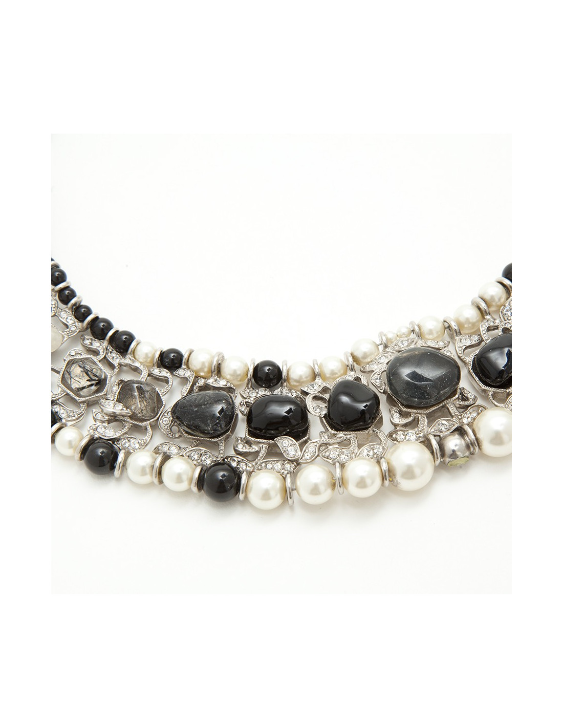 Collier ras de cou Chanel, collection A/2012. Il a 3 rangs de perles nacrées et noires, cabochons gris irisé, noir et strass avec bijouterie métal argent palladié. En très bon état.