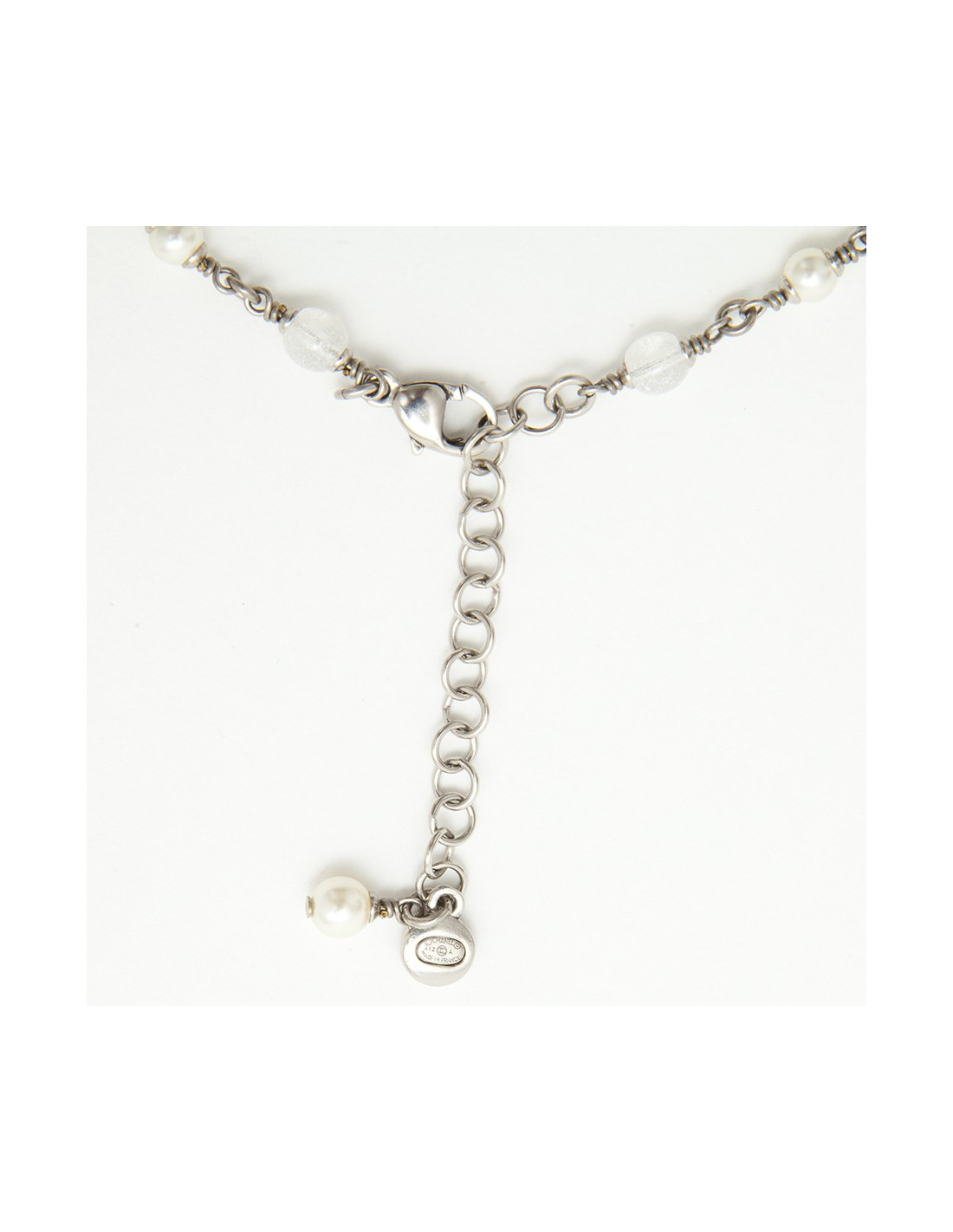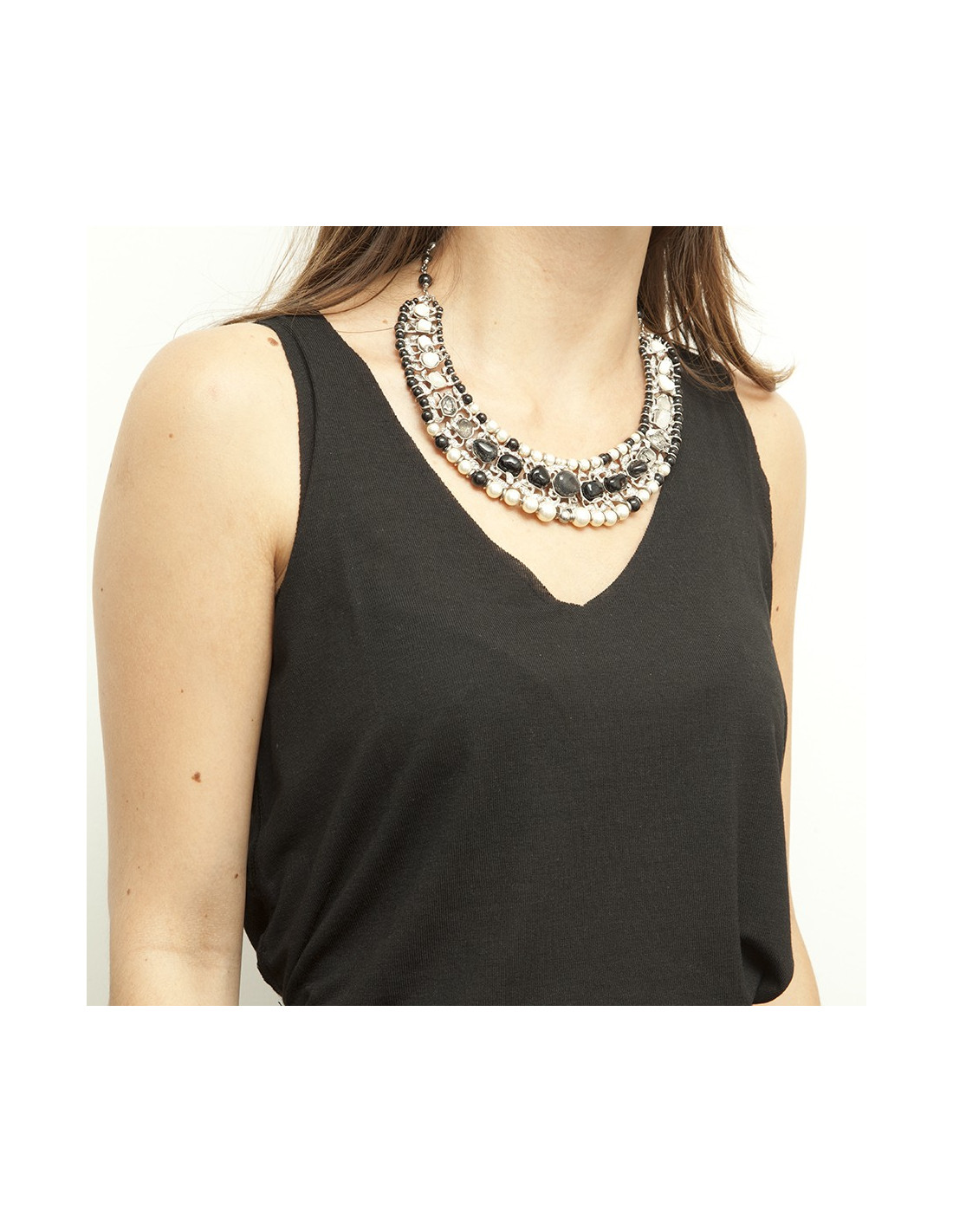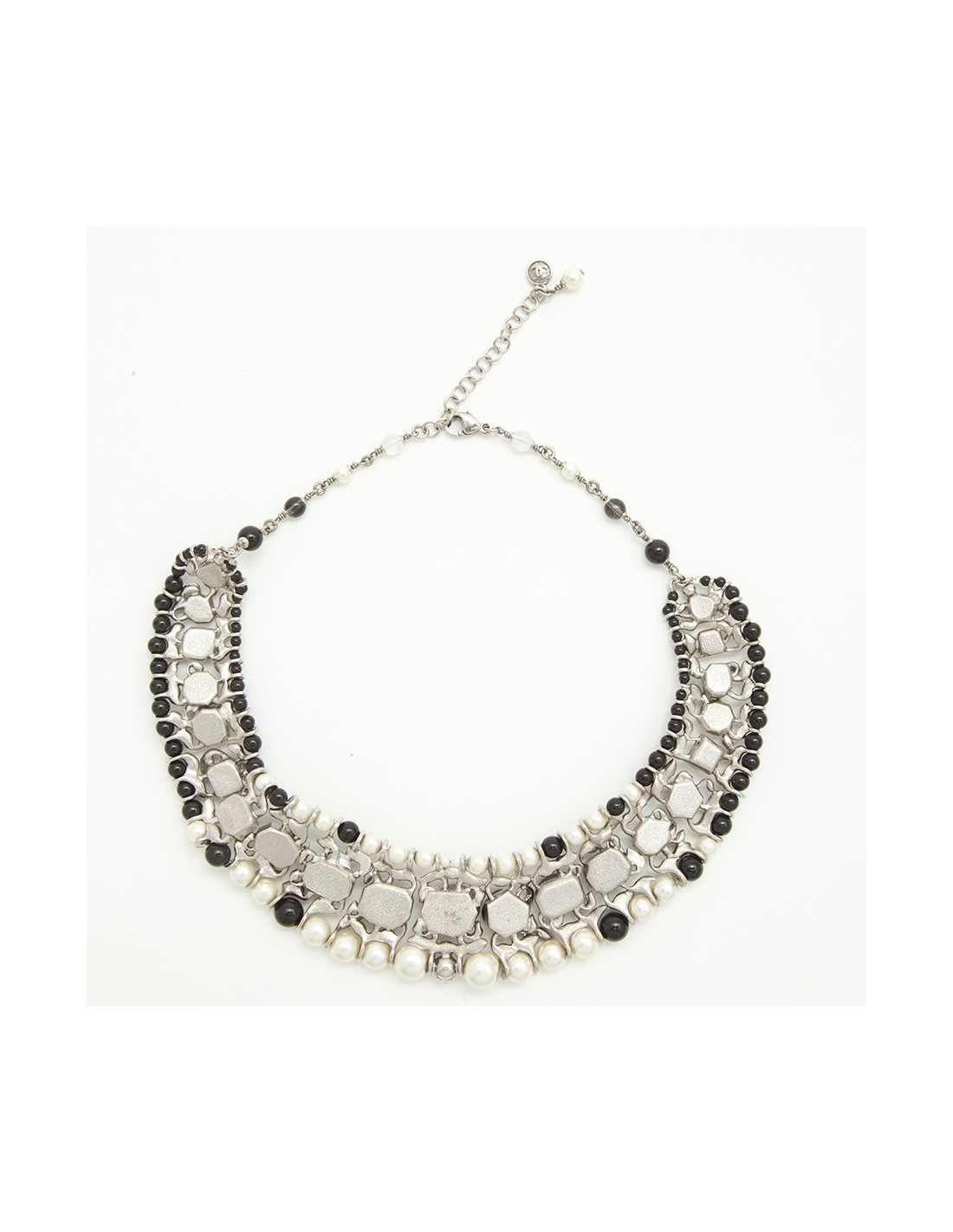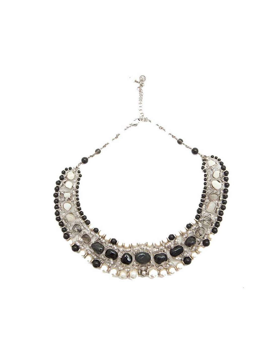 Collier ras de cou Chanel, collection A/2012. Il a 3 rangs de perles nacrées et noires, cabochons gris irisé, noir et strass avec bijouterie métal argent palladié. En très bon état.