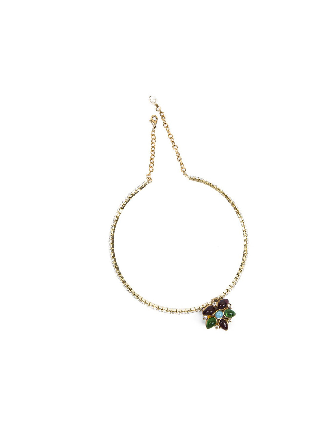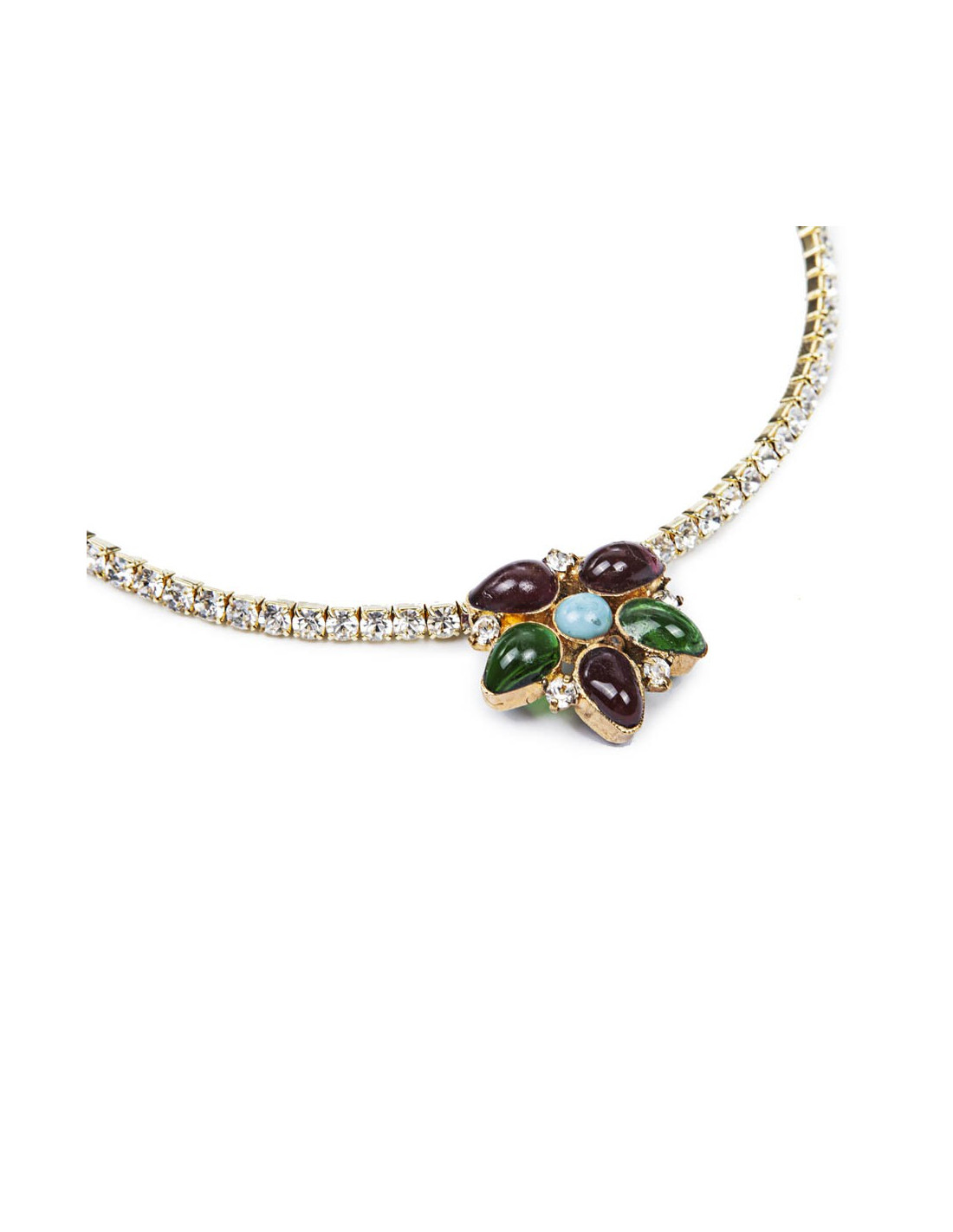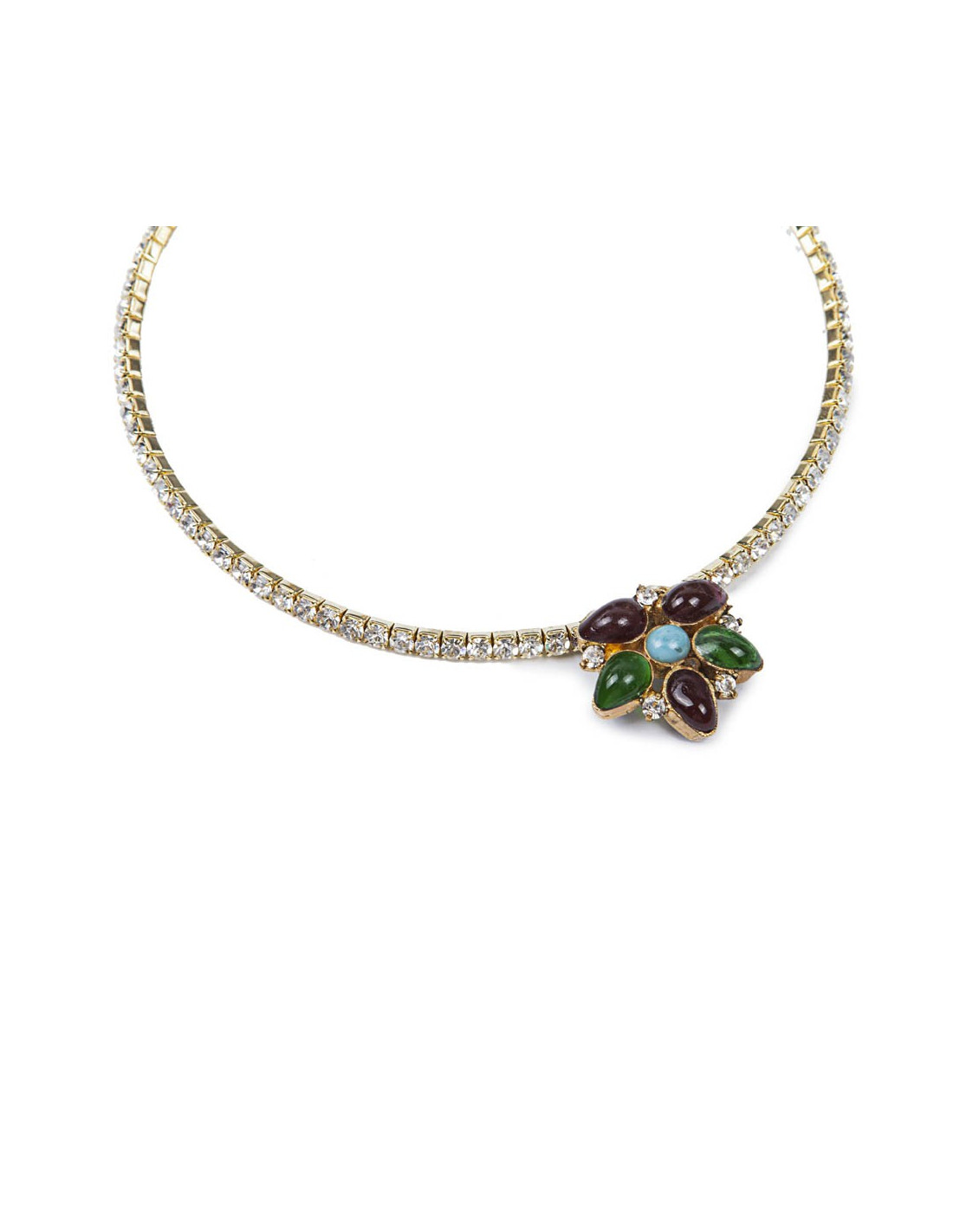 Collier ras de cou Marguerite de Valois serti de brillants Swarovski et pâte de verre saphir, émeraude et turquoise, état neuf.