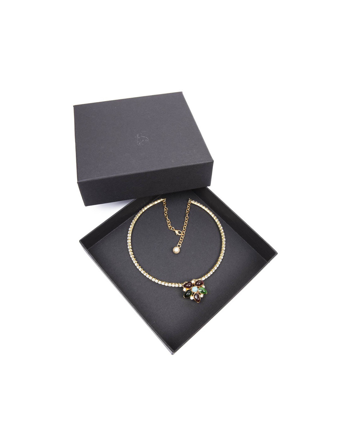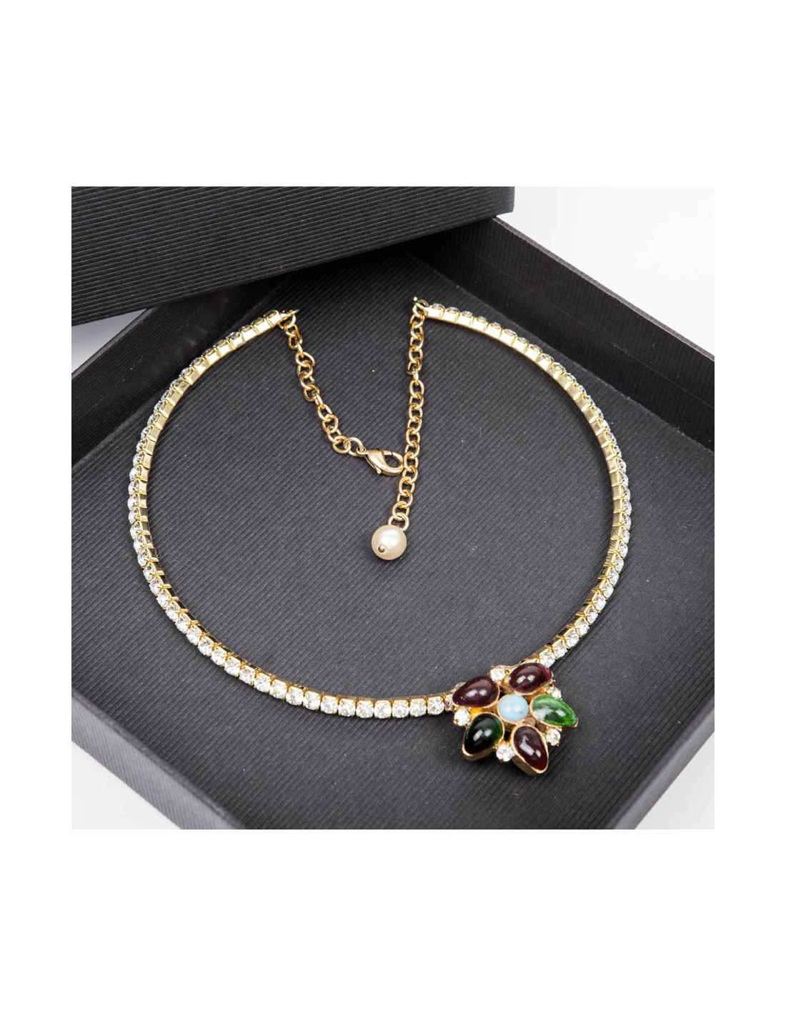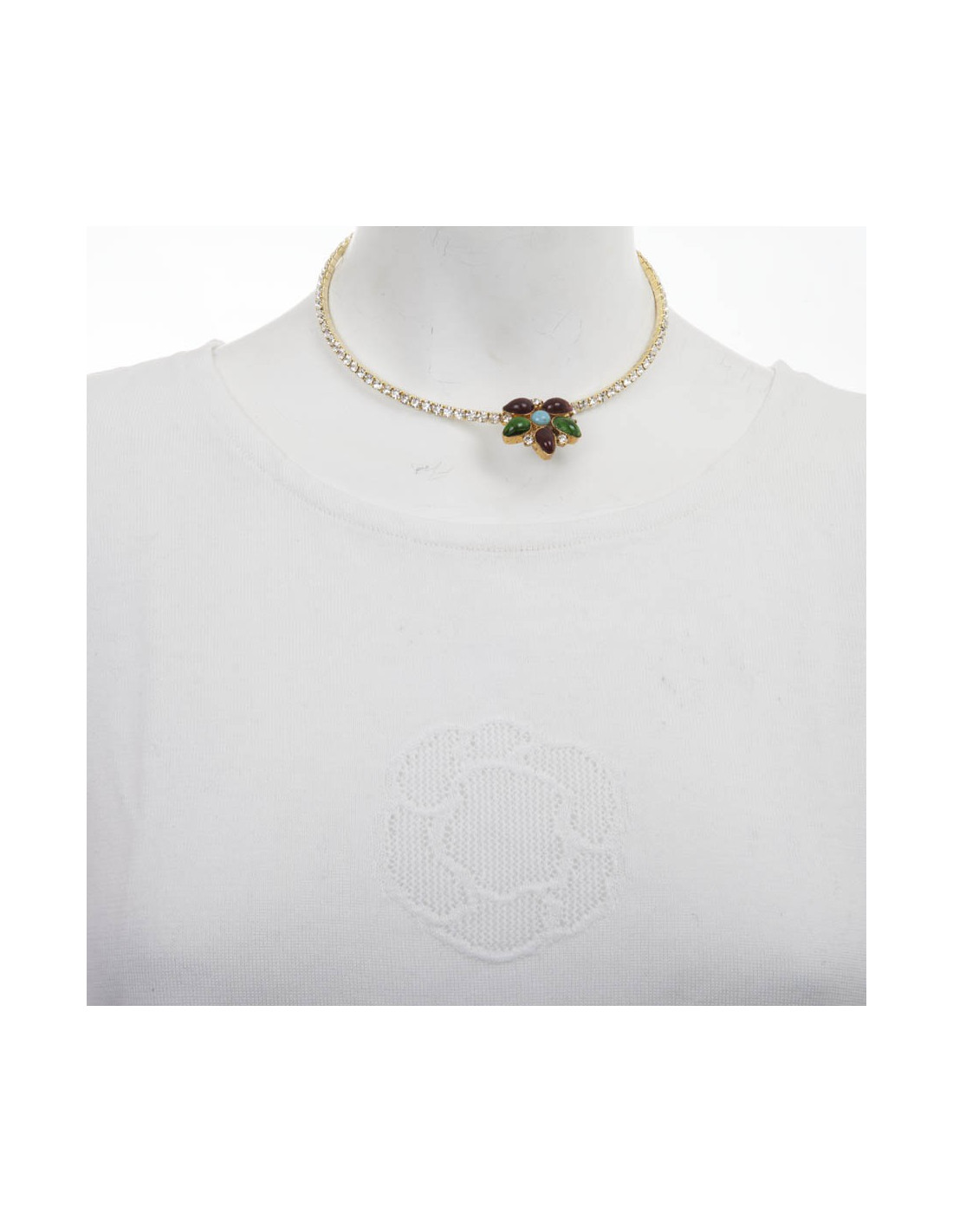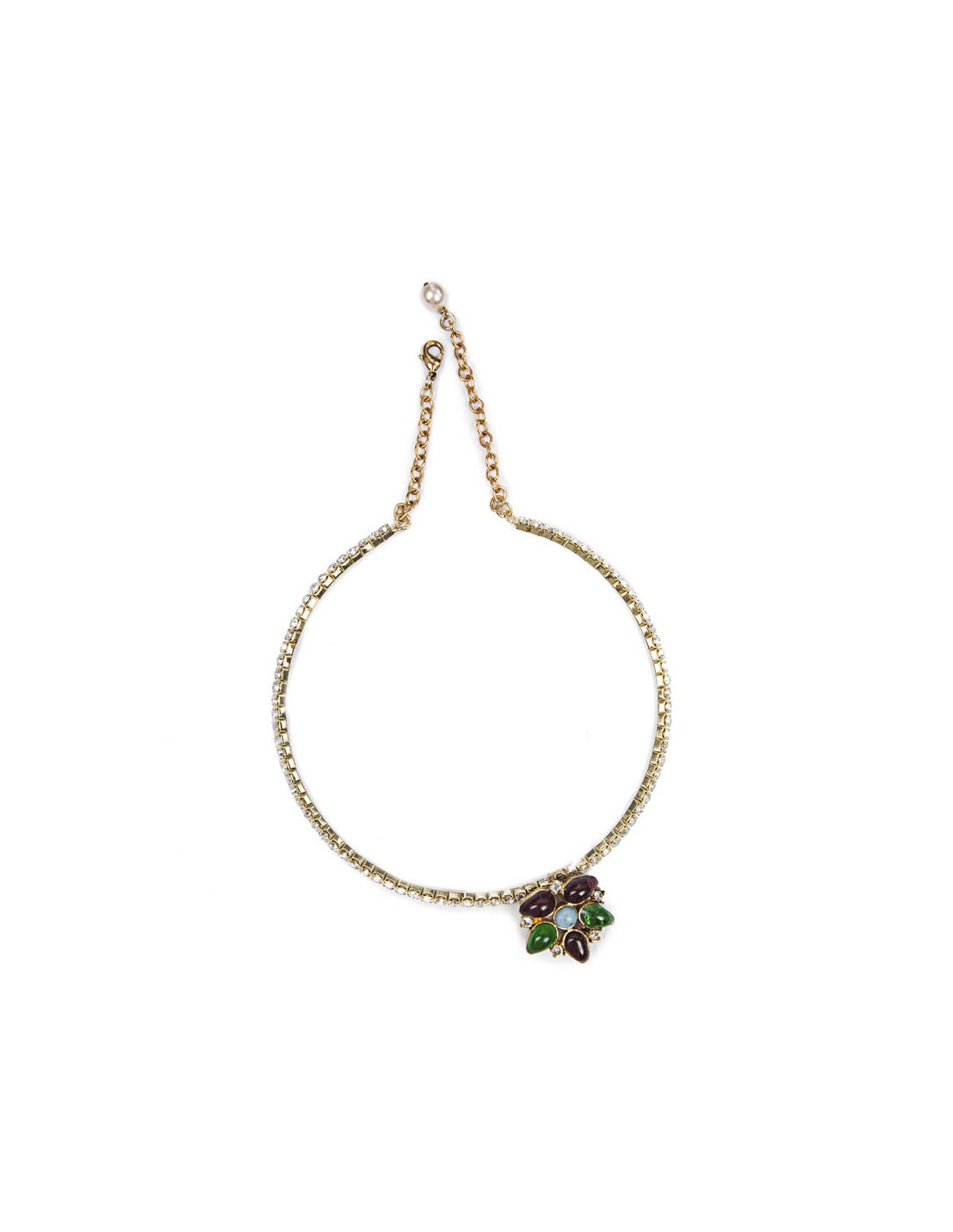 Collier ras de cou Marguerite de Valois serti de brillants Swarovski et pâte de verre saphir, émeraude et turquoise, état neuf.