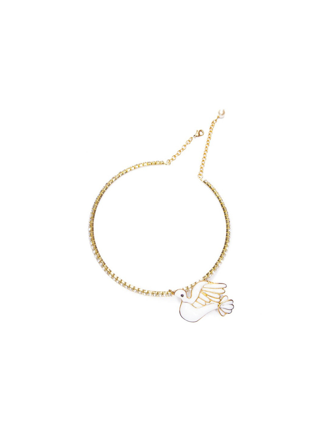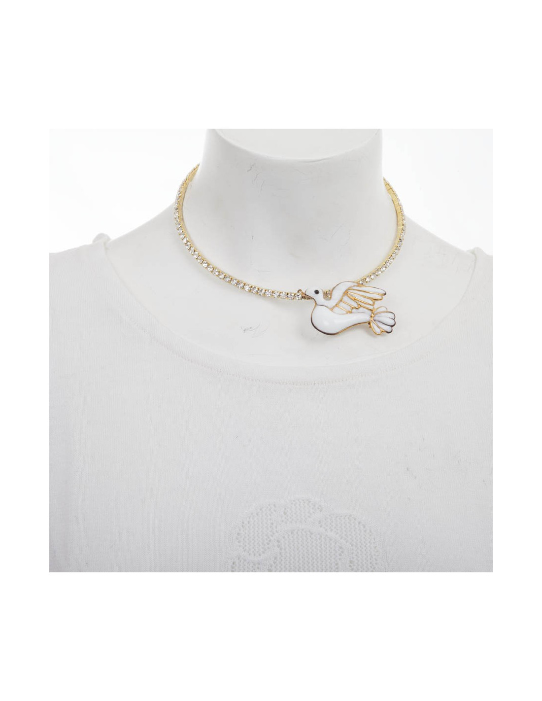 Détails : vintage. Fabriqué à l'époque par la Maison Gripoix, le pendentif représentant une colombe et la tête a été cassée puis a été recollée. Il ne manque aucun brillant. Fermoir mousqueton. Fermoir broche à l'arrière de la colombe.