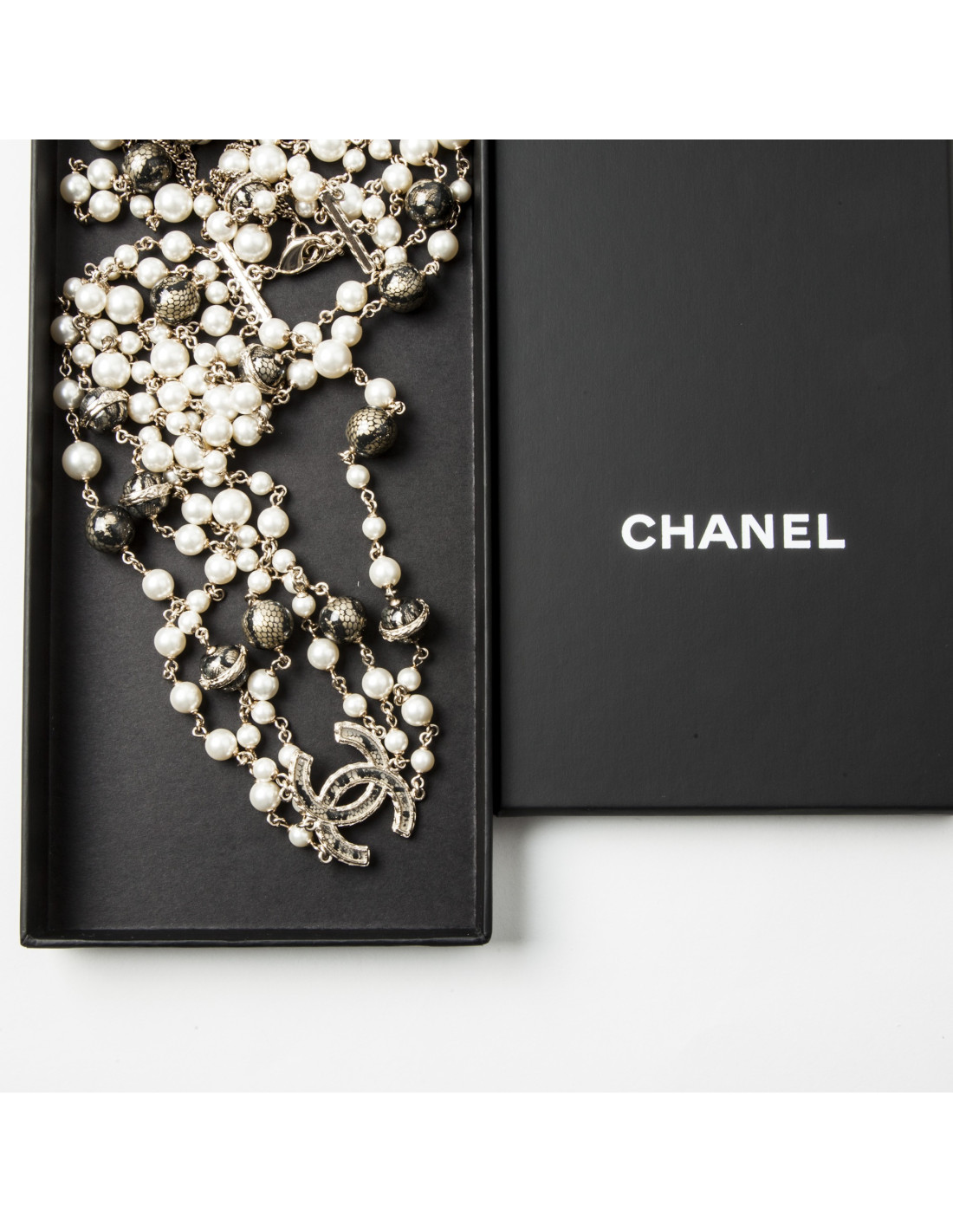 Sautoir triple rangs CHANEL perles nacrées et boules noires dorées
