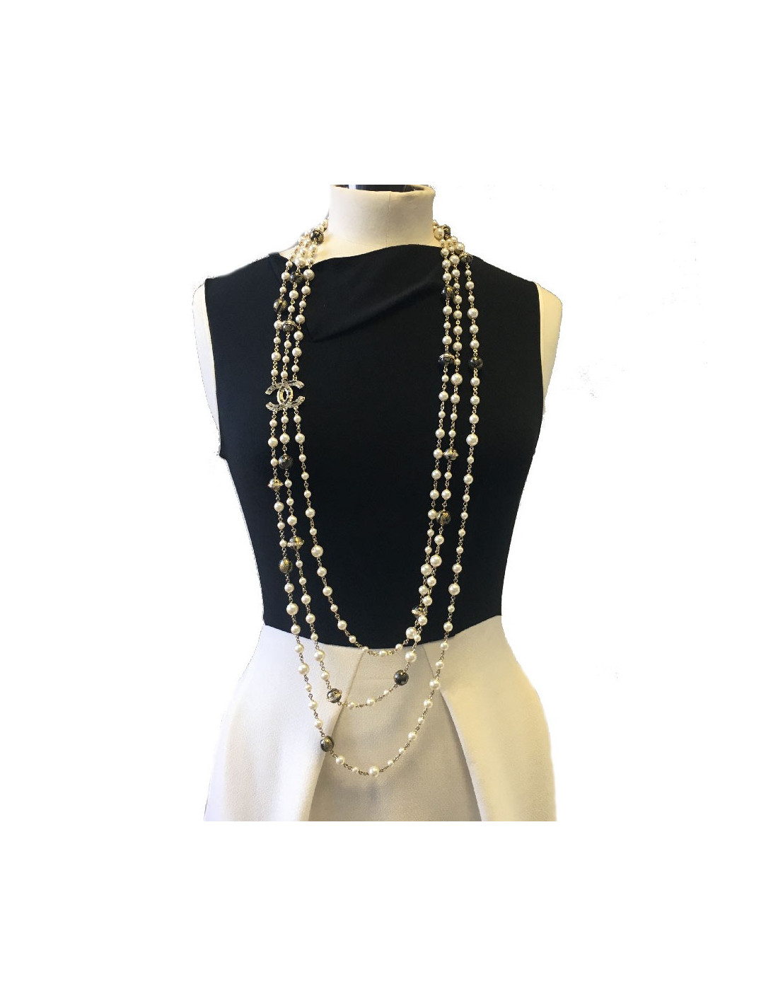 Magnifique sautoir Chanel triple rangs en perles nacrées et boules dorées et noires, un CC doré relie les 3 rangées de perles.