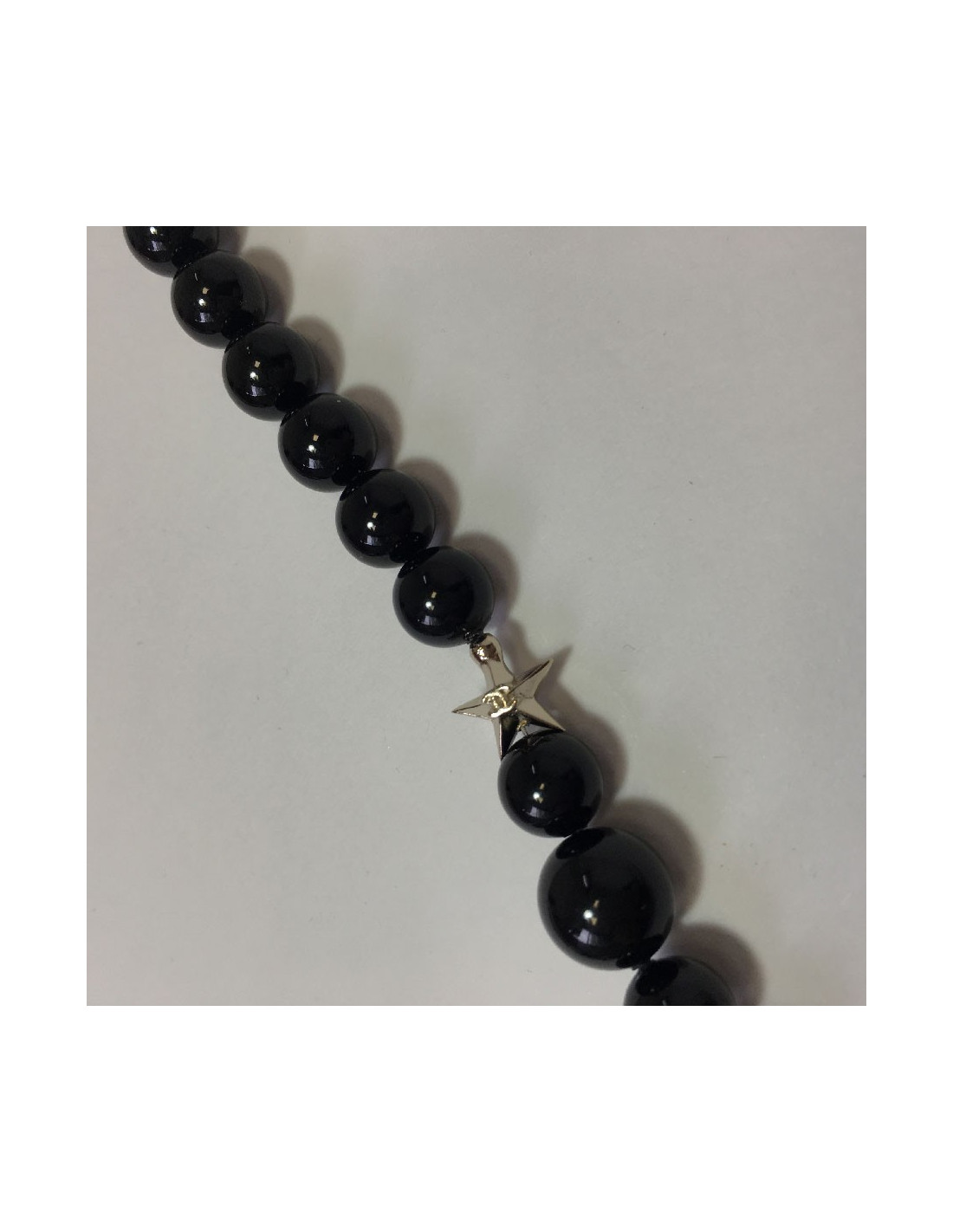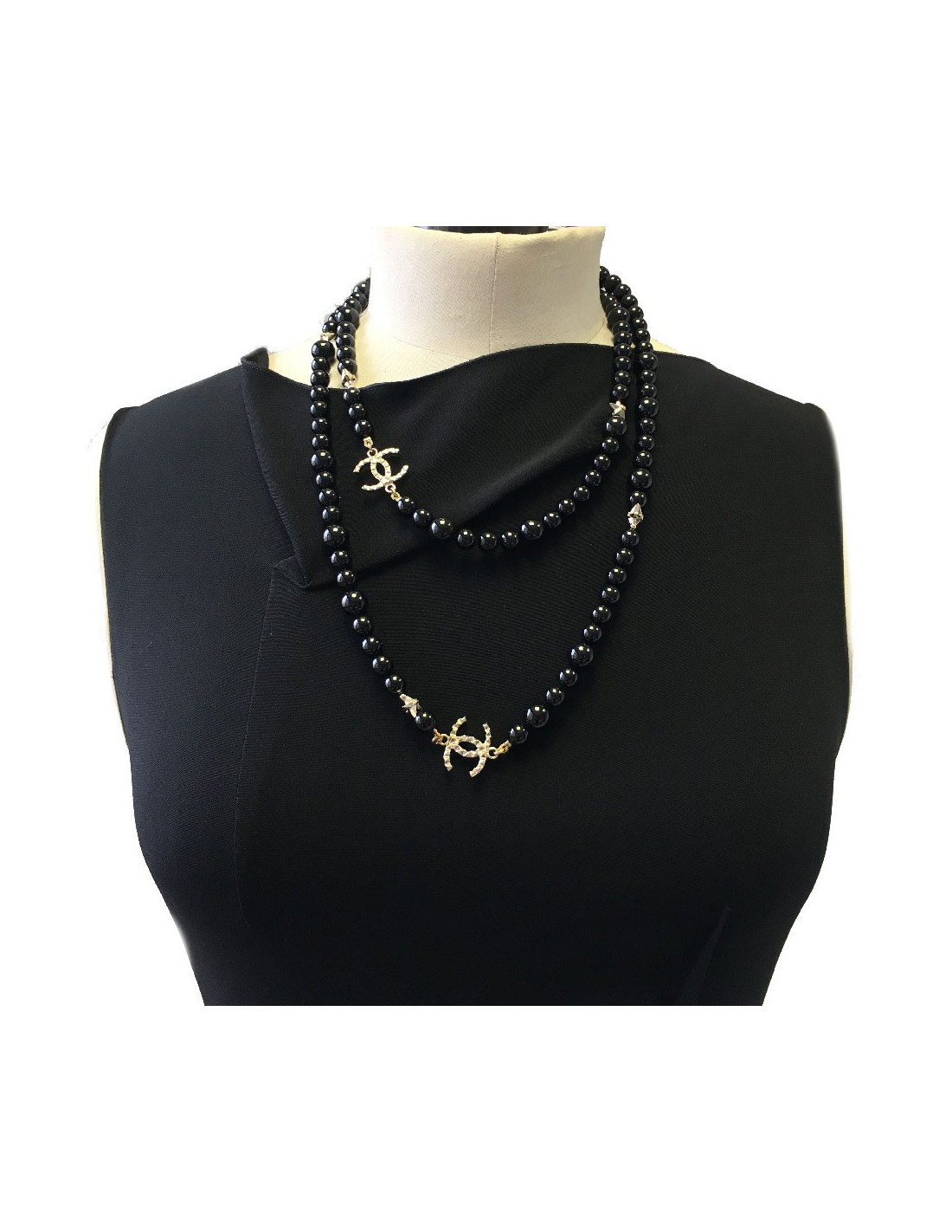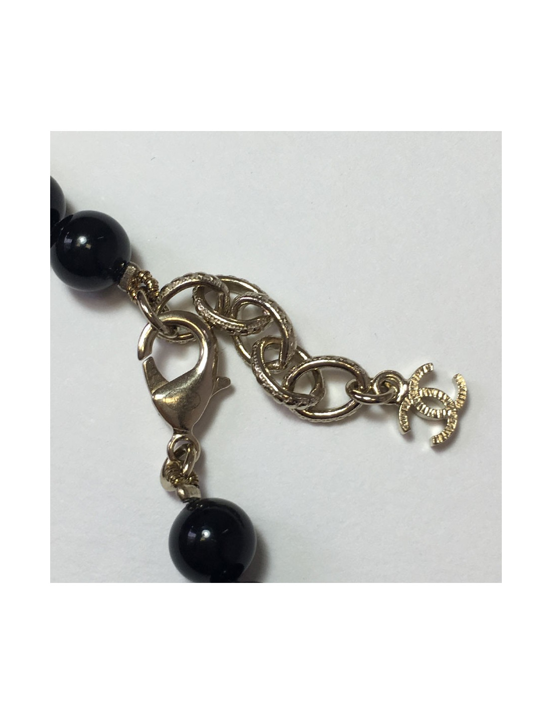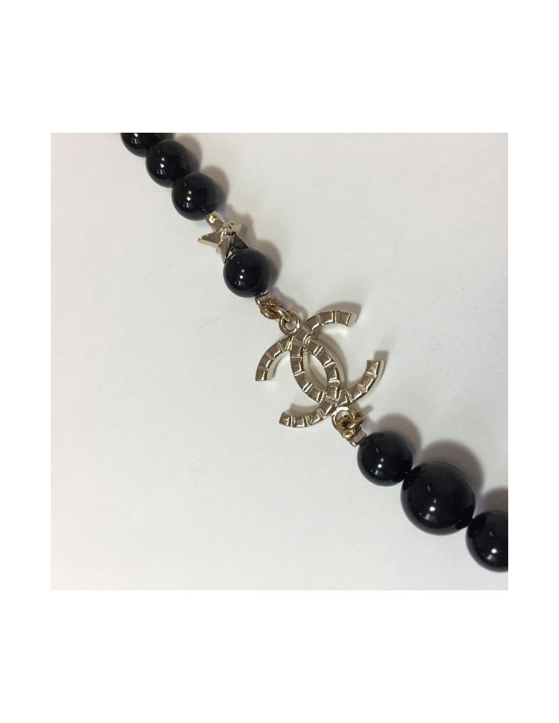 Sautoir Chanel en perles noires, CC et étoiles dorées pâles. En très bon état.