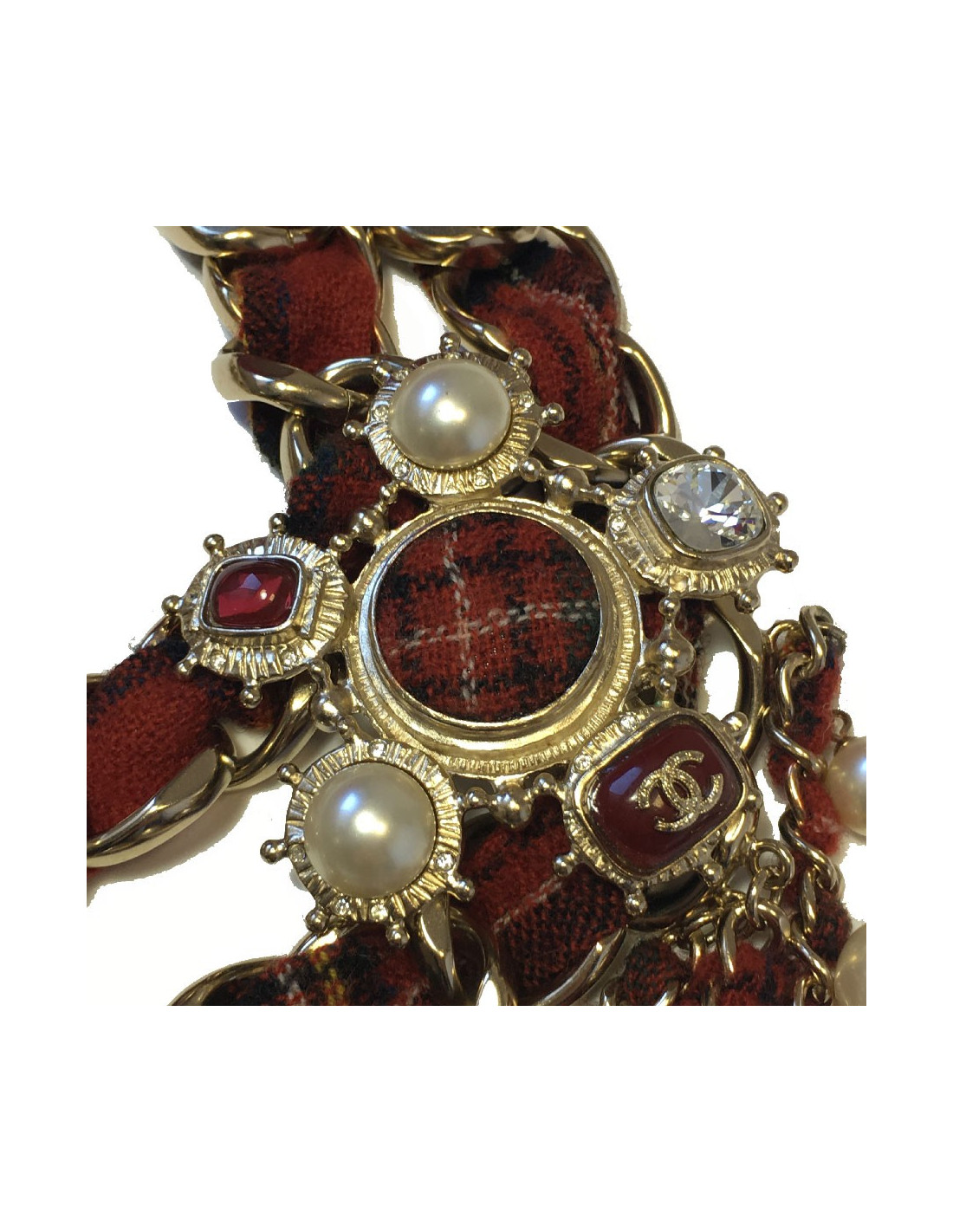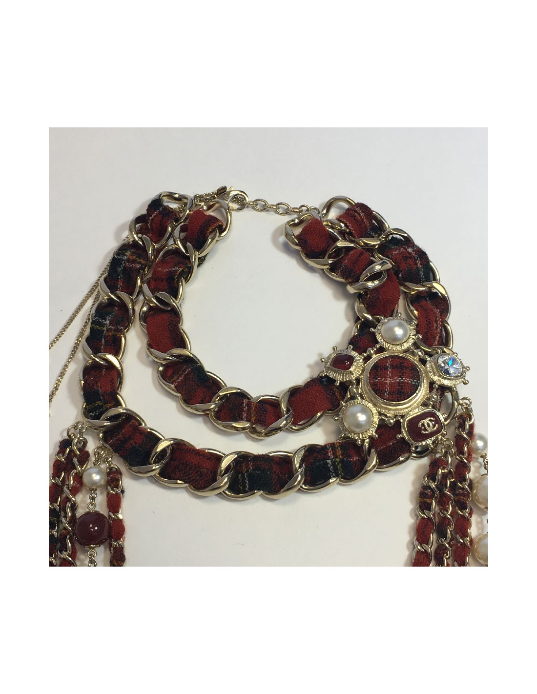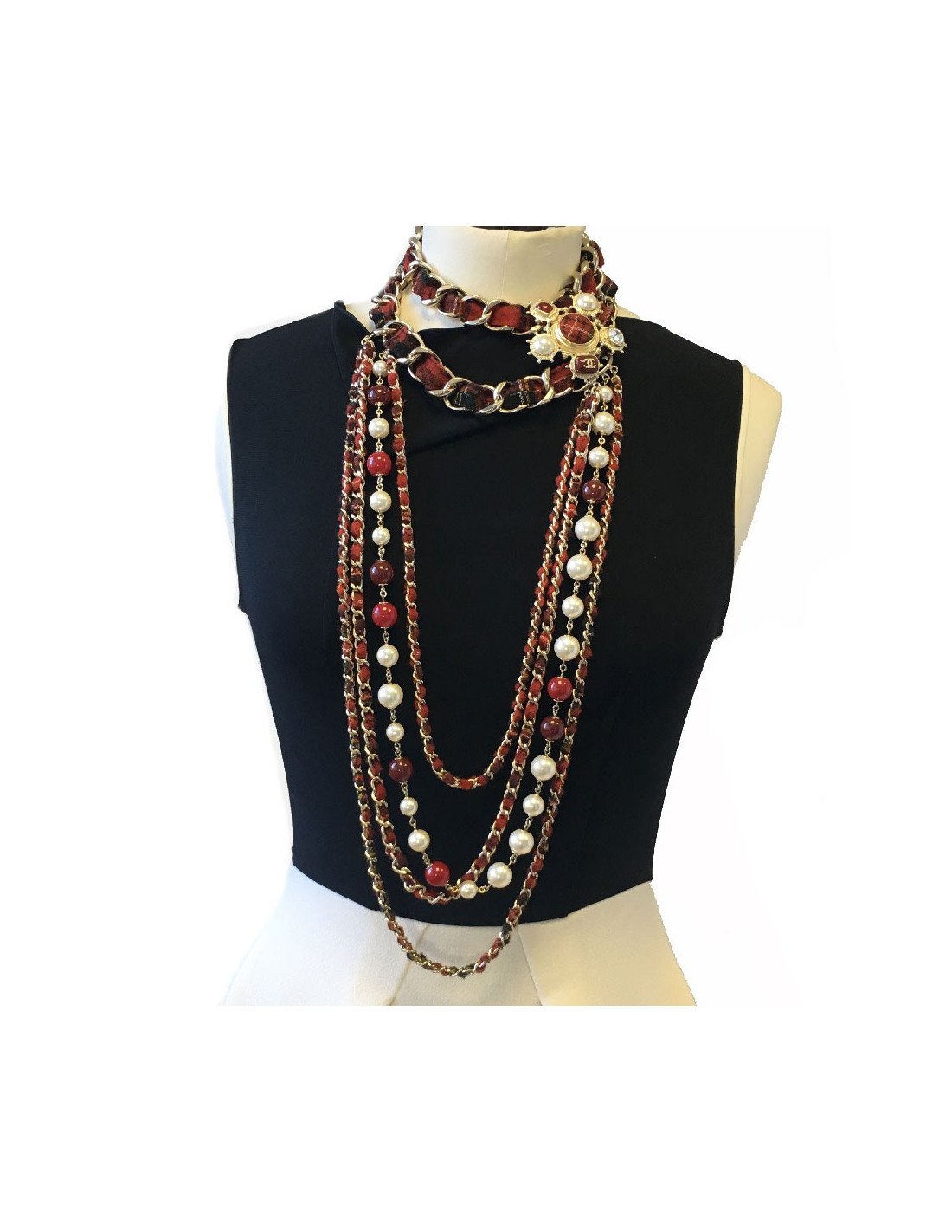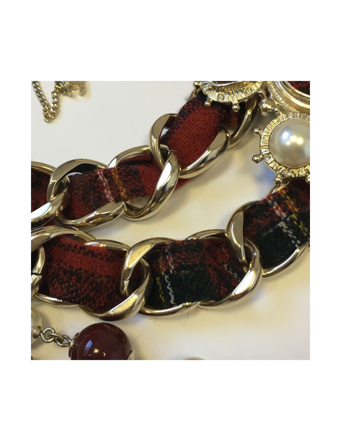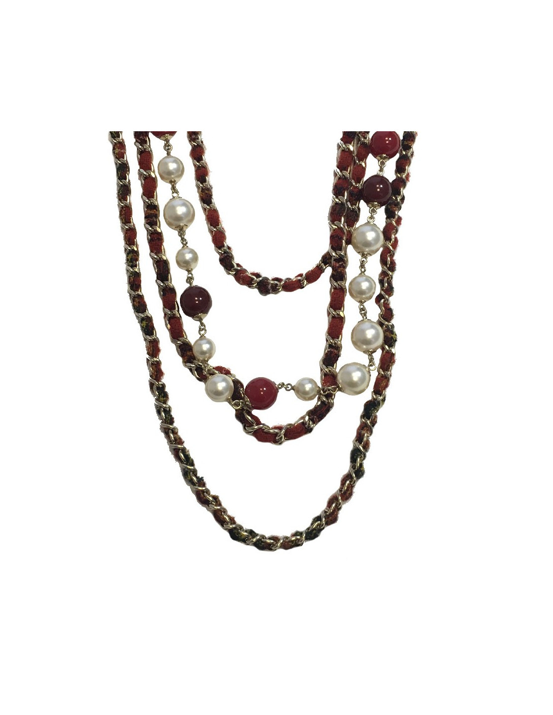 Sautoir en tweed rouge, une rangée de perles nacrées et de verre rouge, 4 chaines en métal doré entrelacées de tweed rouge
