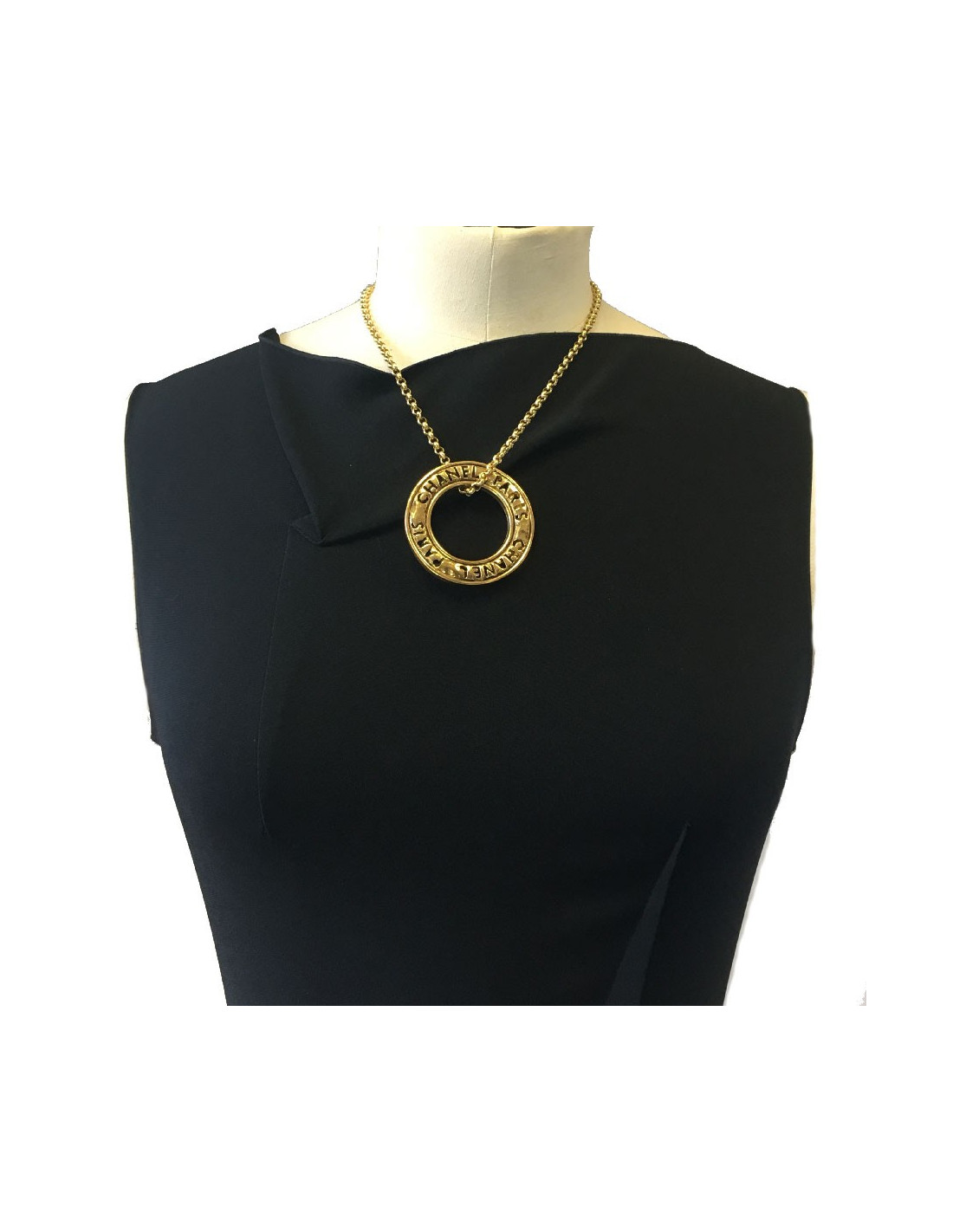 Collier Chanel pendentif rond, inscriptions PARIS CHANEL, et petite chaîne à anneau en or 750.
