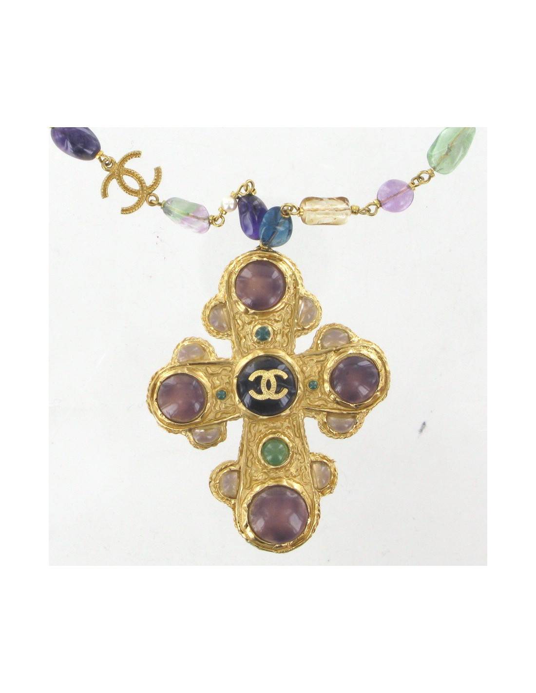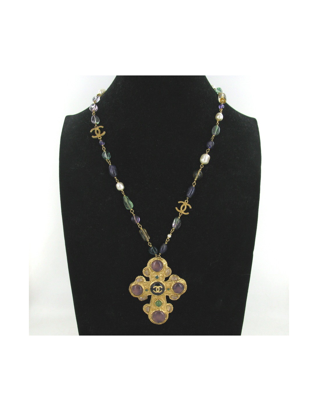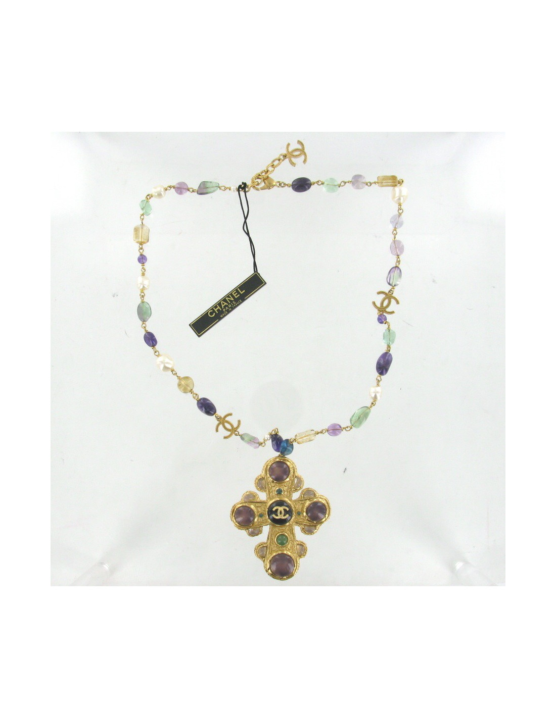 Magnifique collier croix CHANEL serti de perles multicolores. Chaîne en métal or pâle sertie de perles blanches nacrées, vertes, violettes, jaunes et de CC or pâle. Le pendentif est une croix en métal or pâle sertie de cabochons violets, transparents et verts. le cabochon du milieu est sertie d'un CC or pâle.