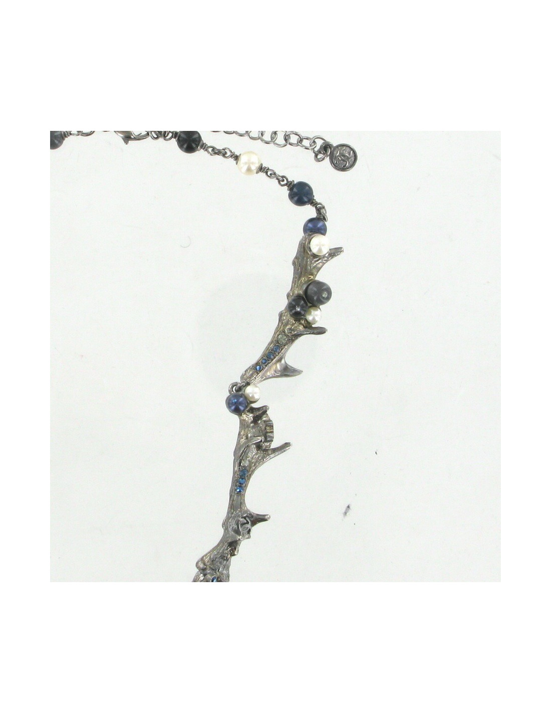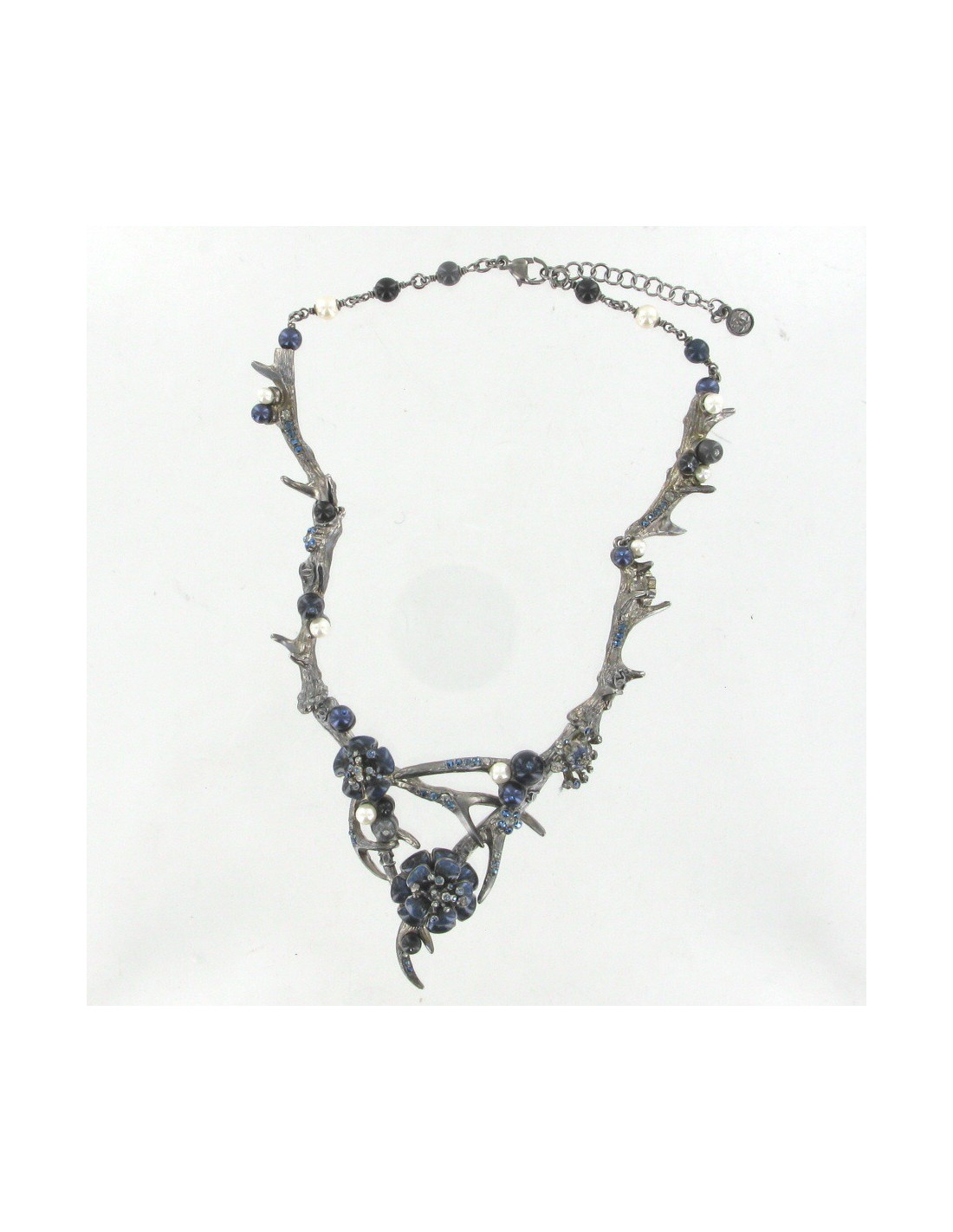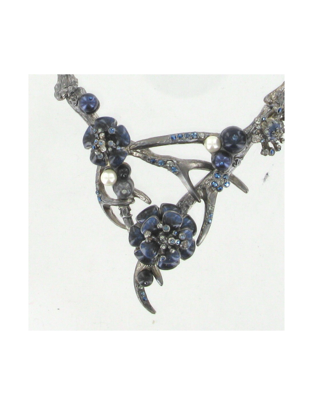 Il est composé de bois de cerf en métal ruthénium serties de perles nacrées, noires et bleues, de strass bleus et blancs, et de deux camélias bleu nuit serties de strass.