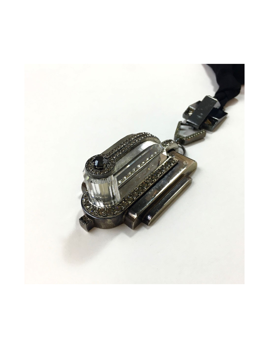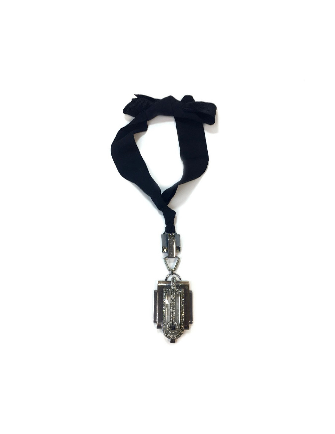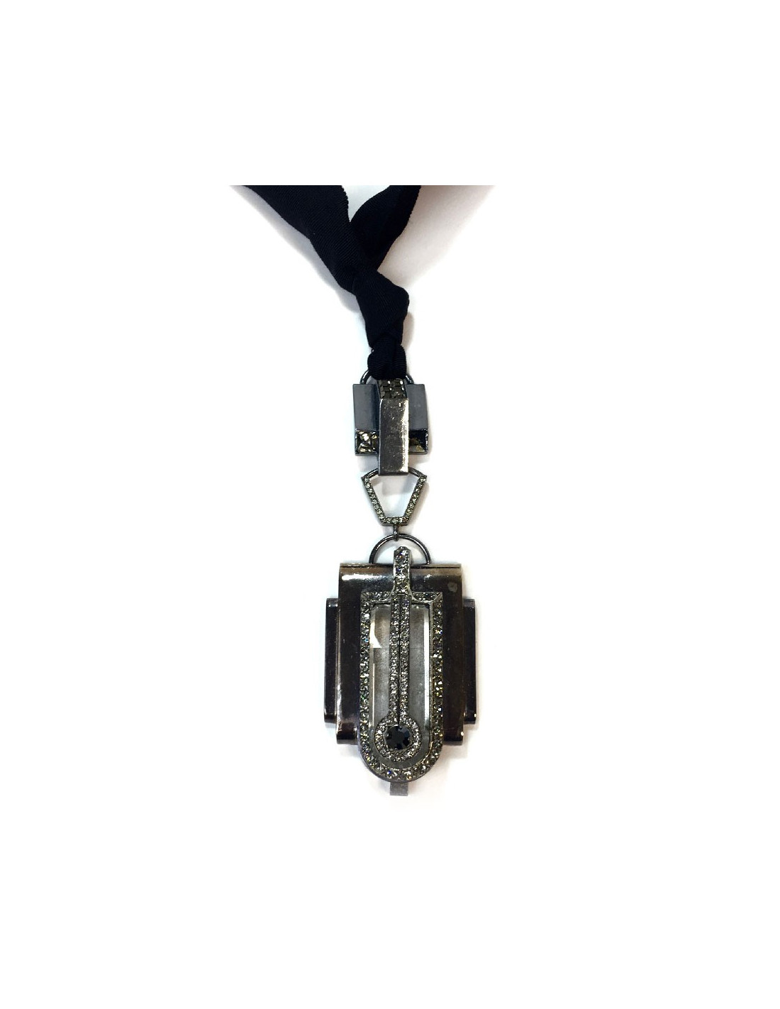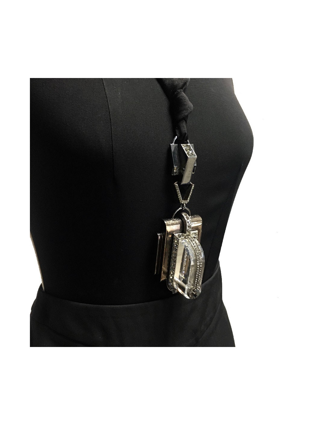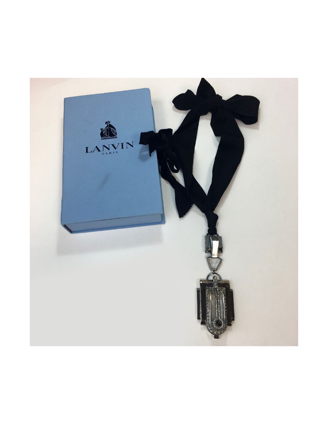 COLLECTOR! Imposant sautoir Lanvin avec un pendentif en métal argenté noirci, cristal et strass. L'attache est en ruban gros grain noir satiné. Il manque 3 strass aux extrémités (voir photos). Il est en bon état