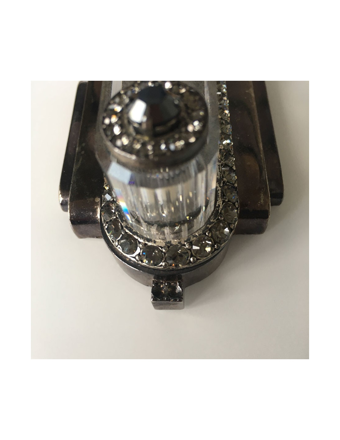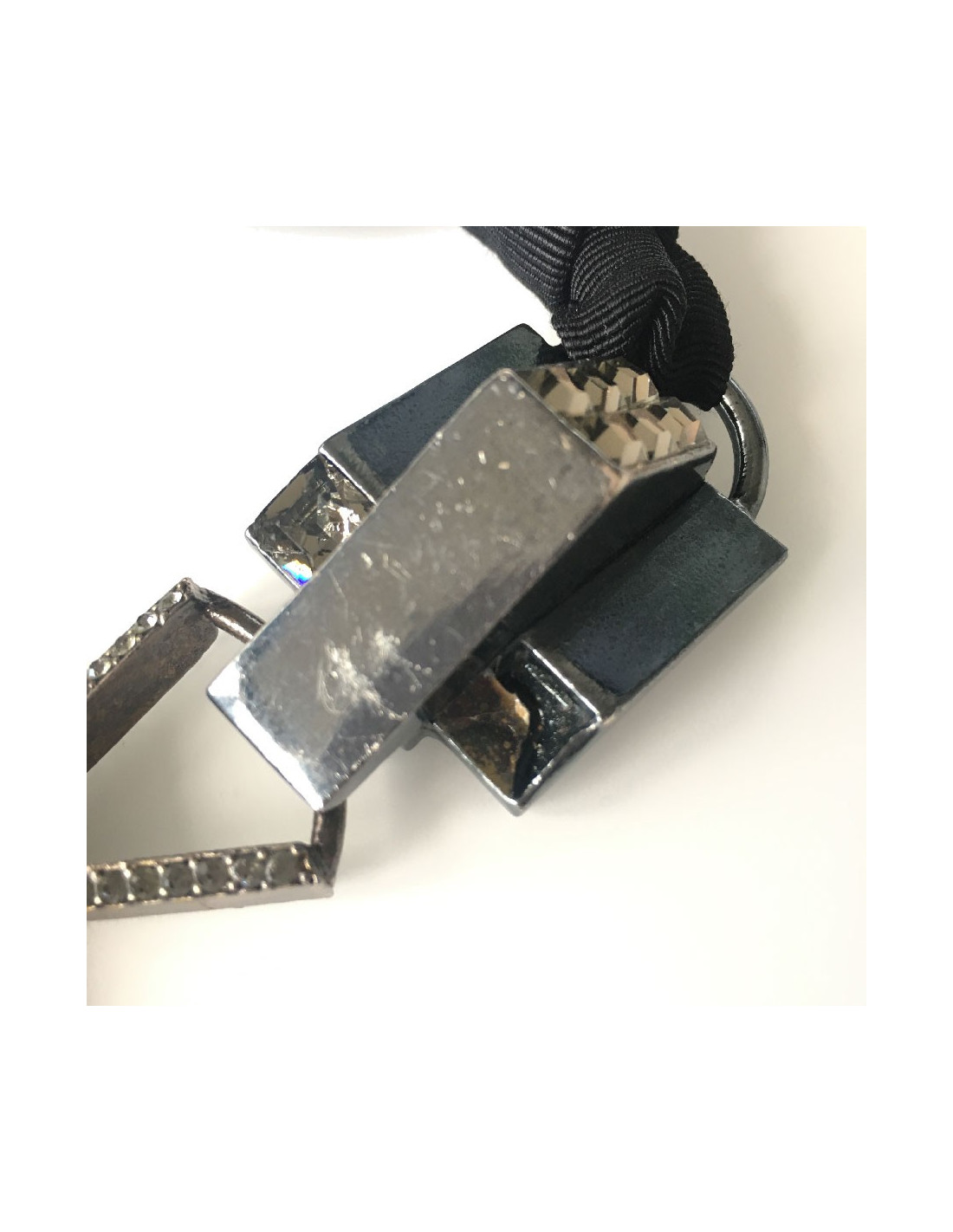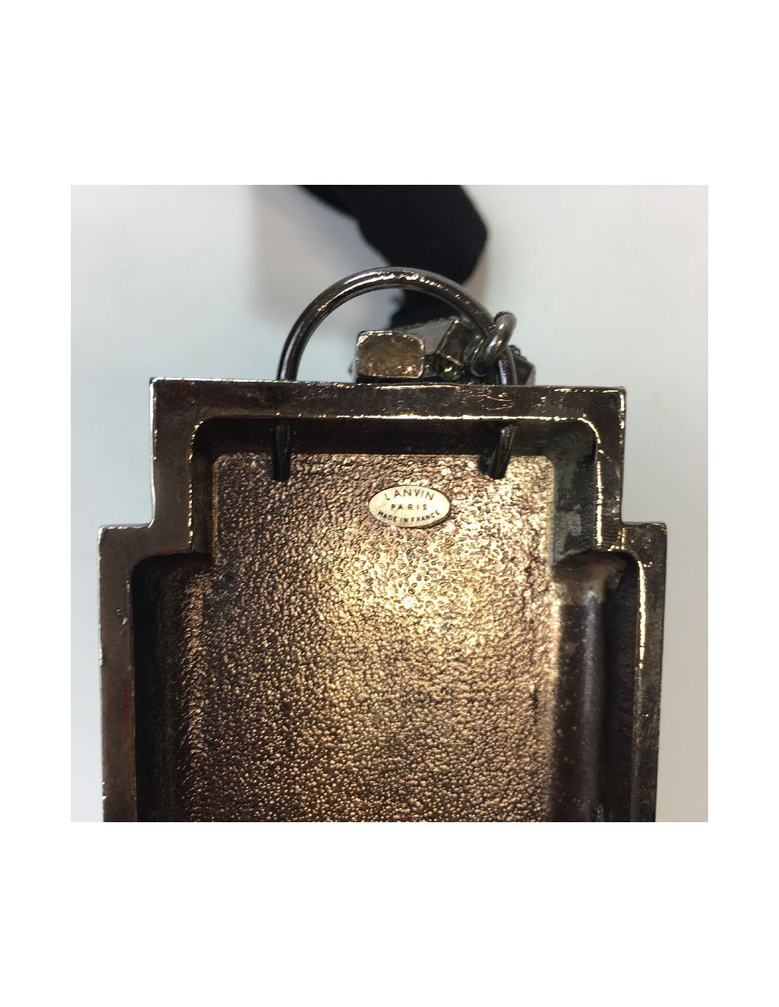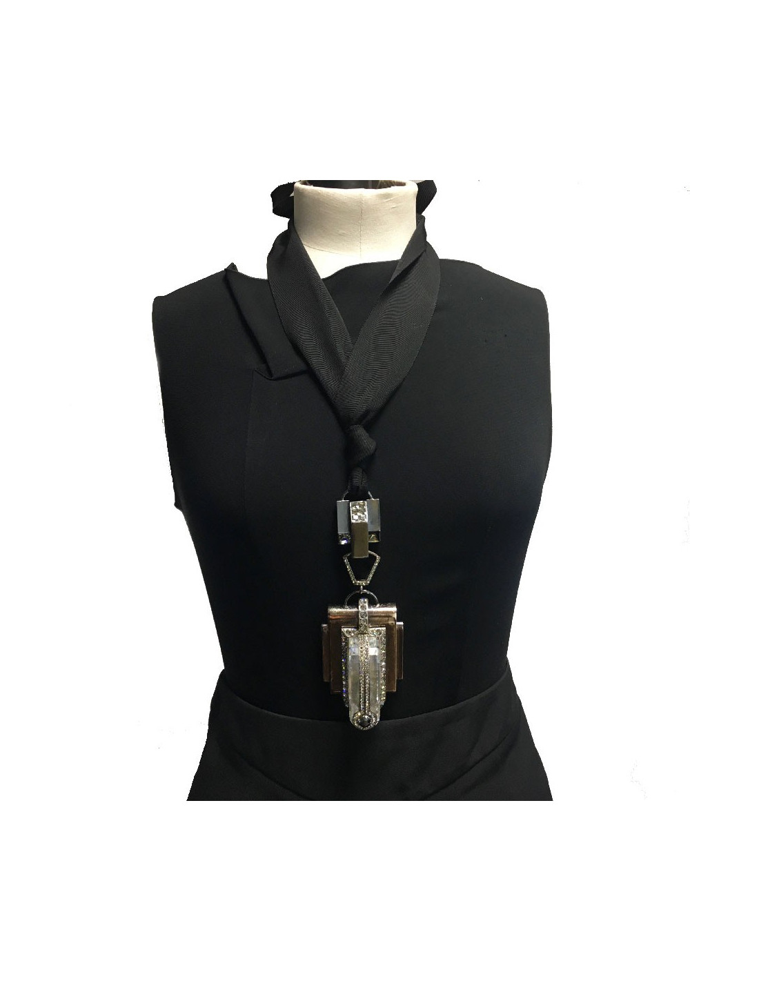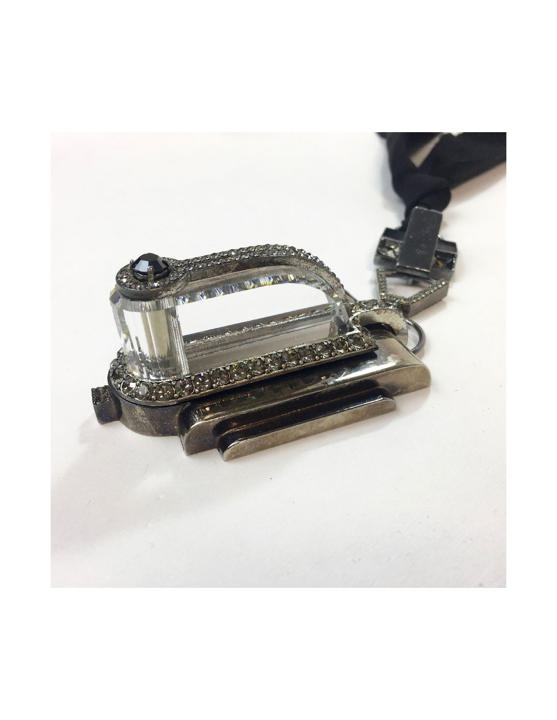 COLLECTOR! Imposant sautoir Lanvin avec un pendentif en métal argenté noirci, cristal et strass. L'attache est en ruban gros grain noir satiné. Il manque 3 strass aux extrémités (voir photos). Il est en bon état