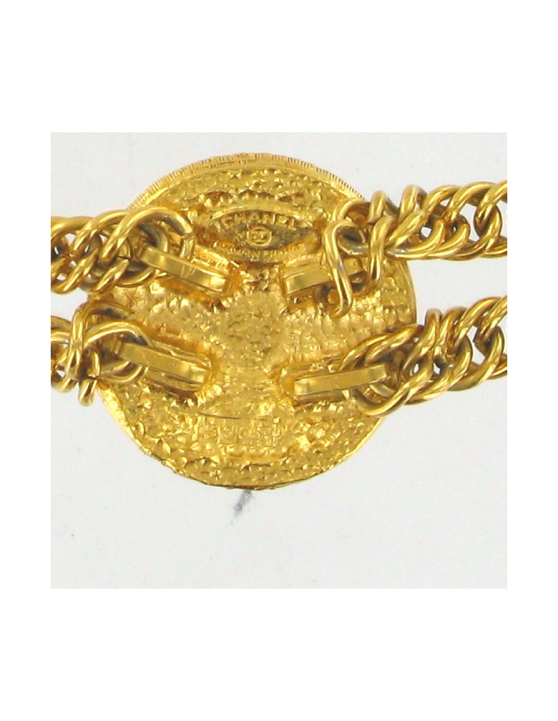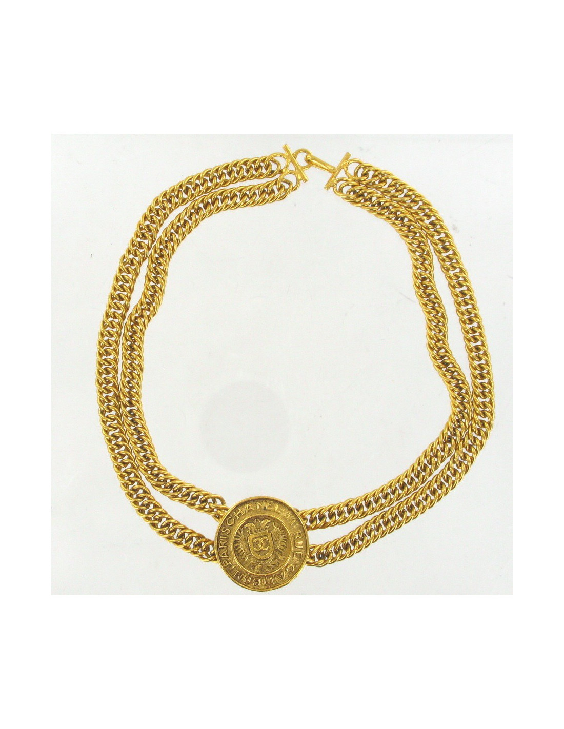 Collier CHANEL vintage composé d'une double chaine en métal doré et d'un médaillon au centre rue Cambon, siglé CC.