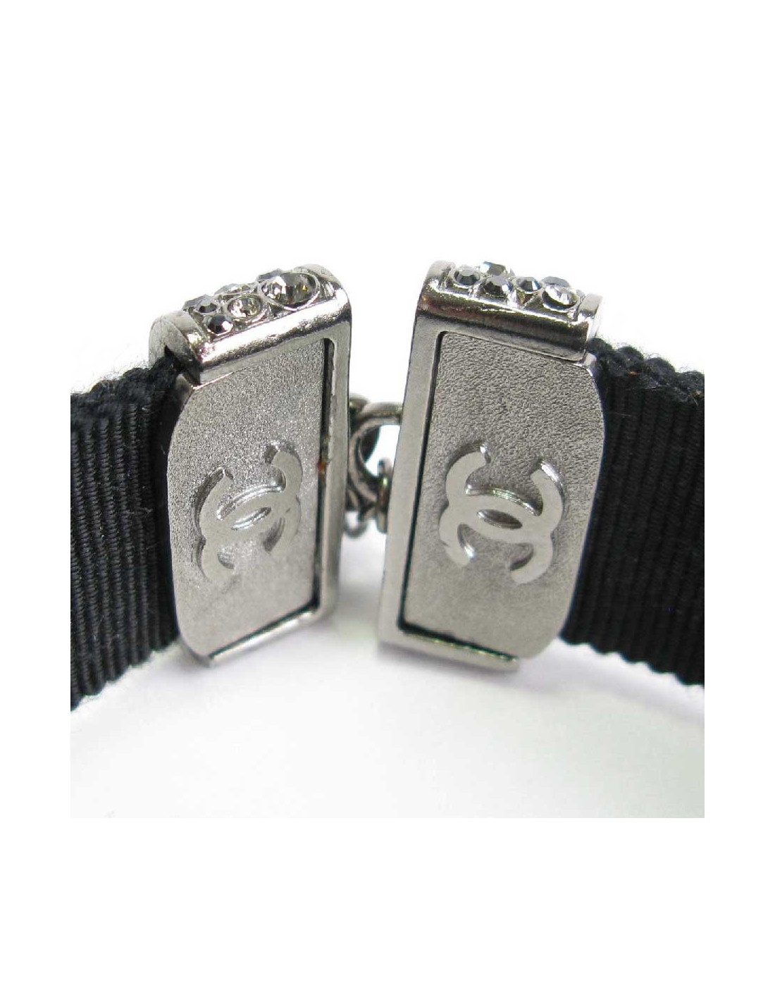 Ras de cou Chanel ruban serti de strass en métal argenté et ruban en gros grain noir. Un CC avec des strass noir et blanc et une perle nacrée terminent la chaîne.