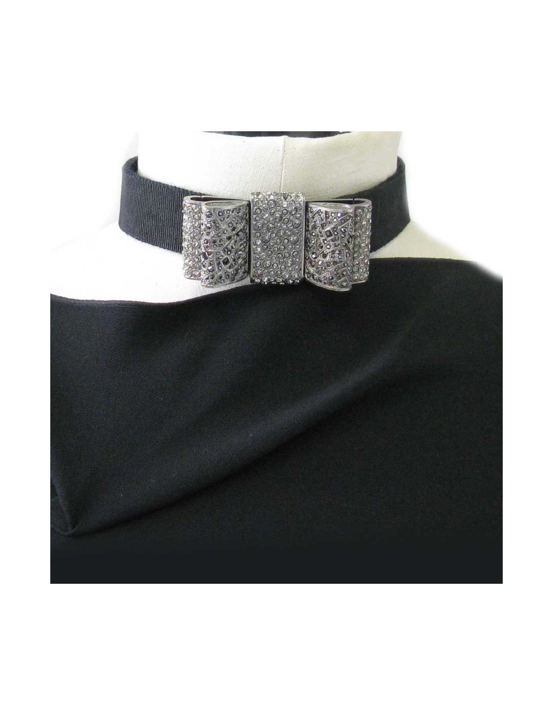 Collier ras de cou CHANEL noeud strass en métal argenté