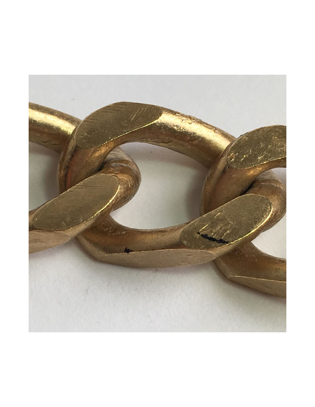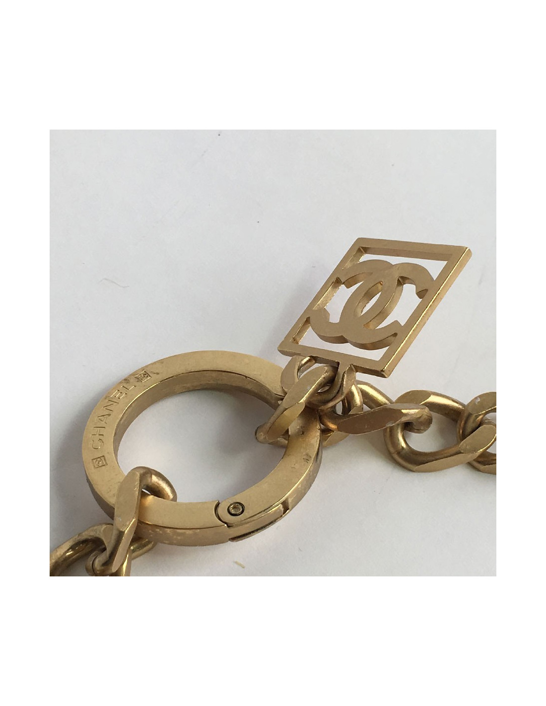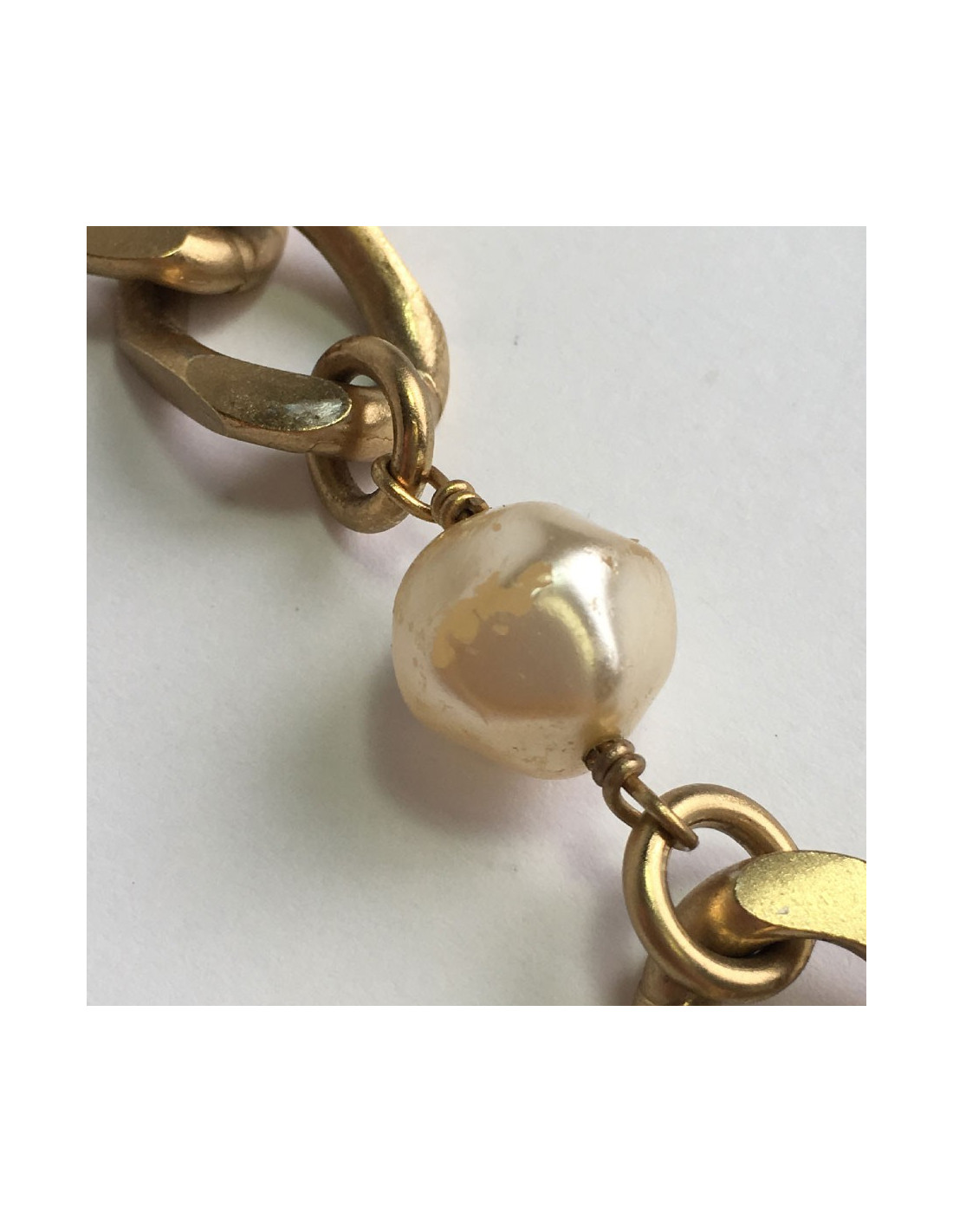 Ceinture-sautoir Chanel en grosse maille dorée or mat agrémentée de perles nacrées. Un CC dans un carré termine le bijou.