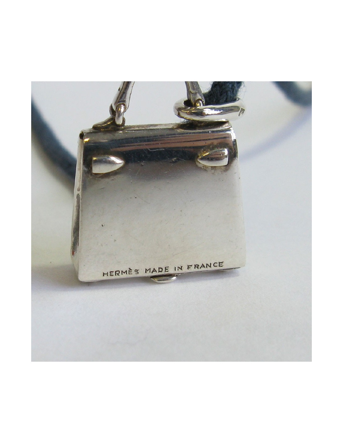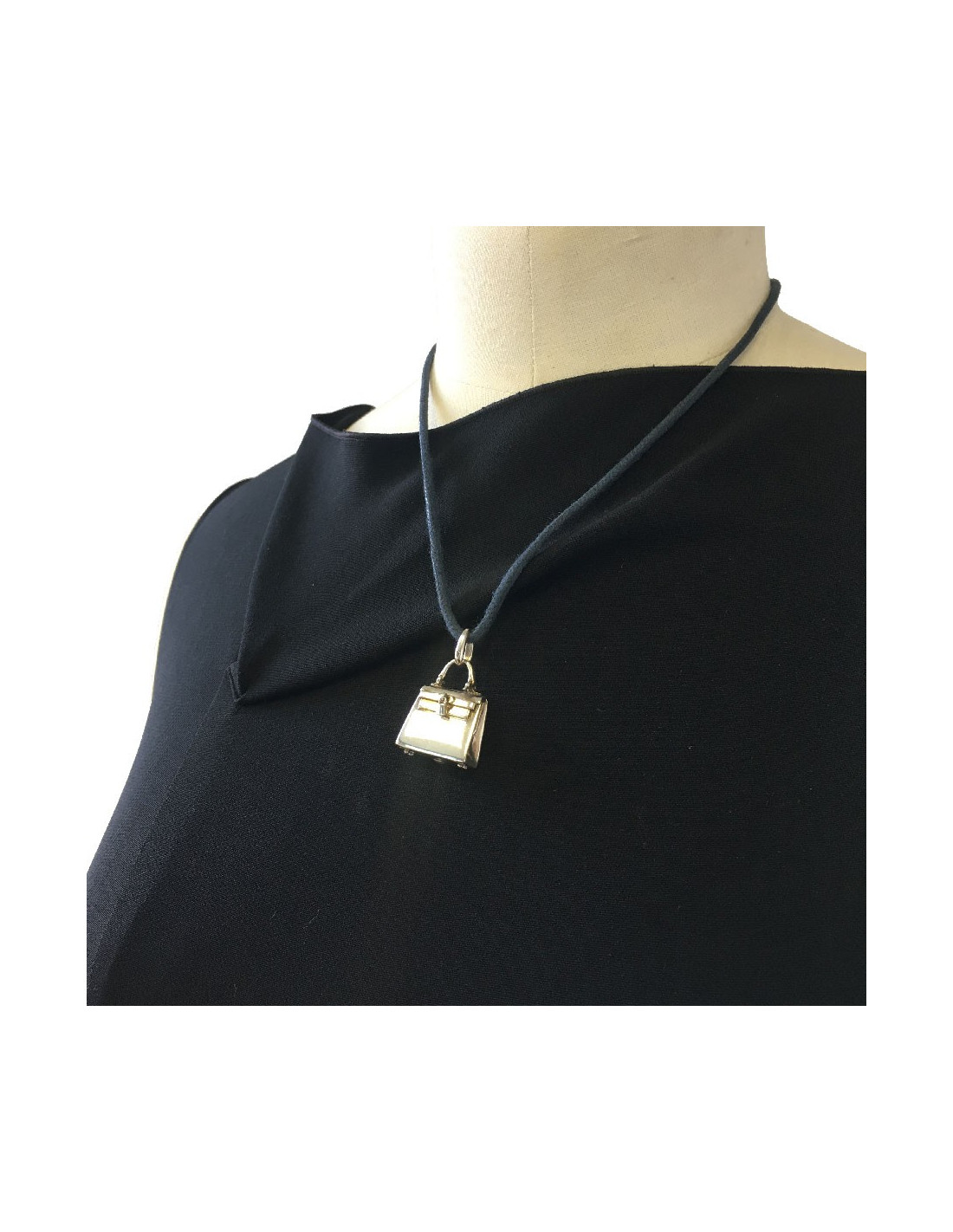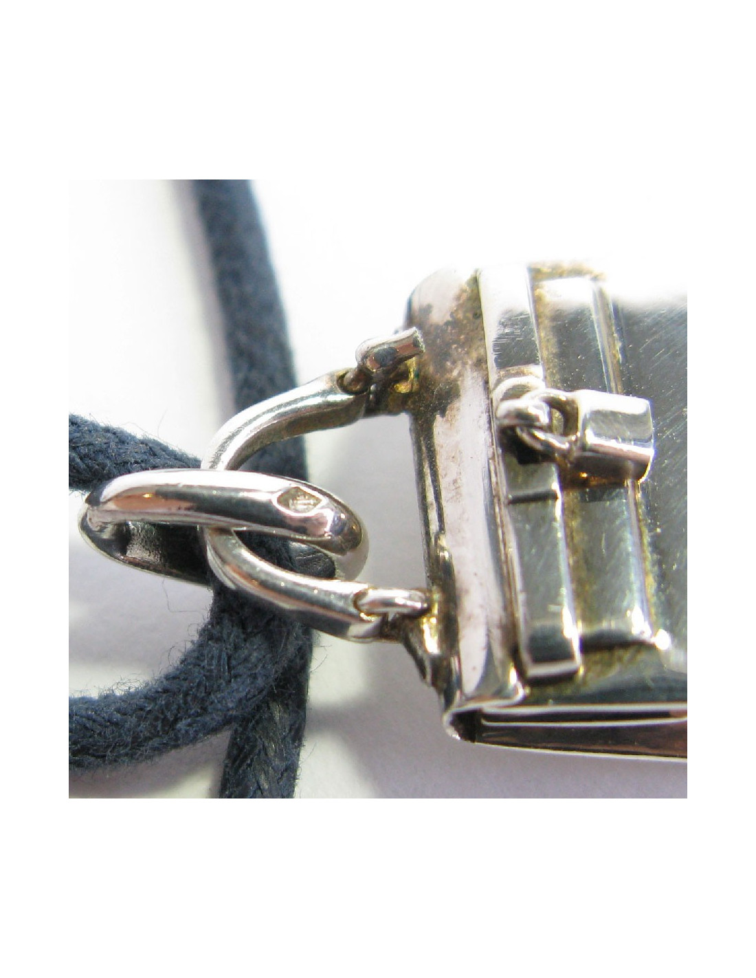 Collier cordon Hermès et son pendentif amulette 'sac Kelly' en argent. Petit détail : le sac est un boite à pilules, le fond s'ouvre.
