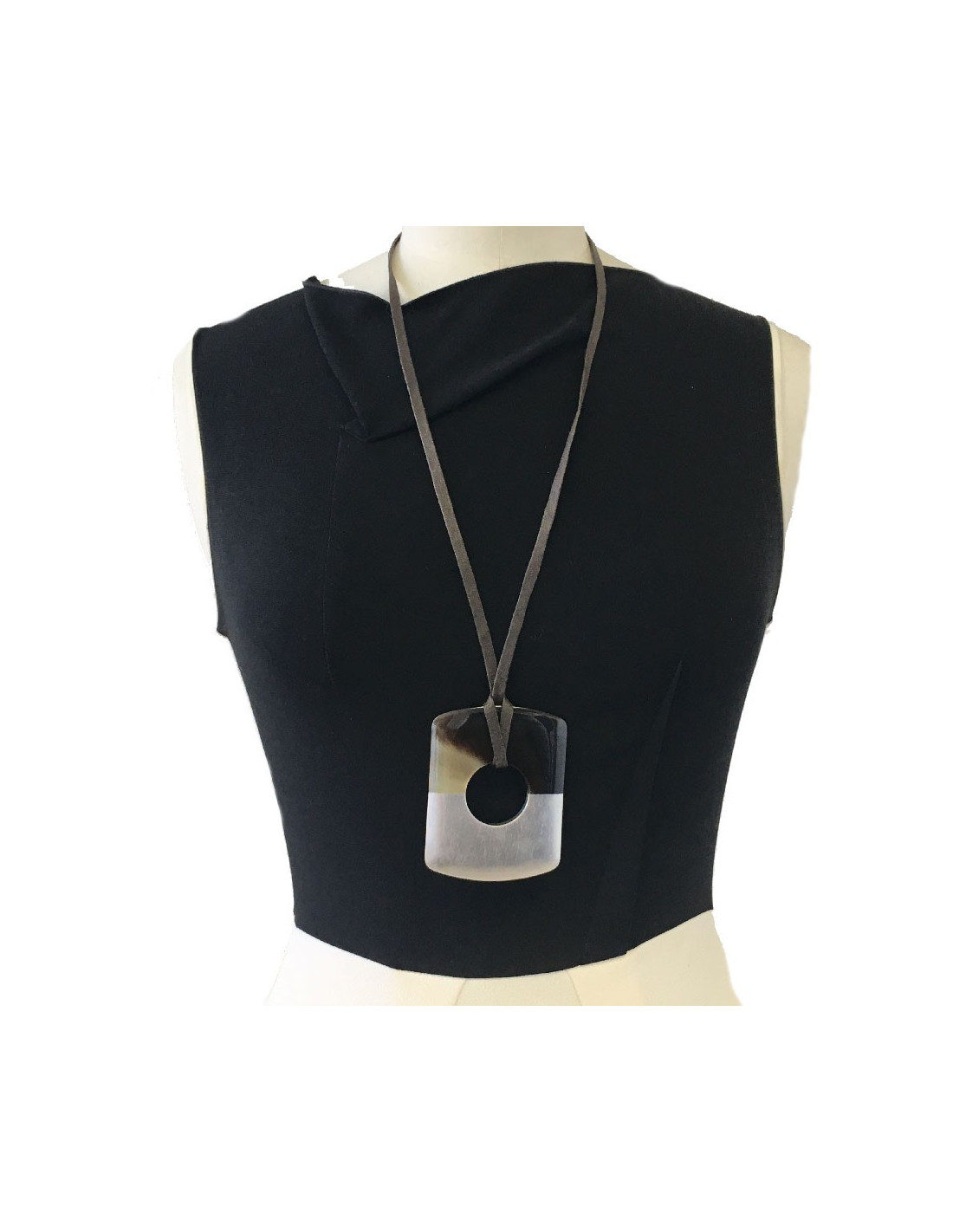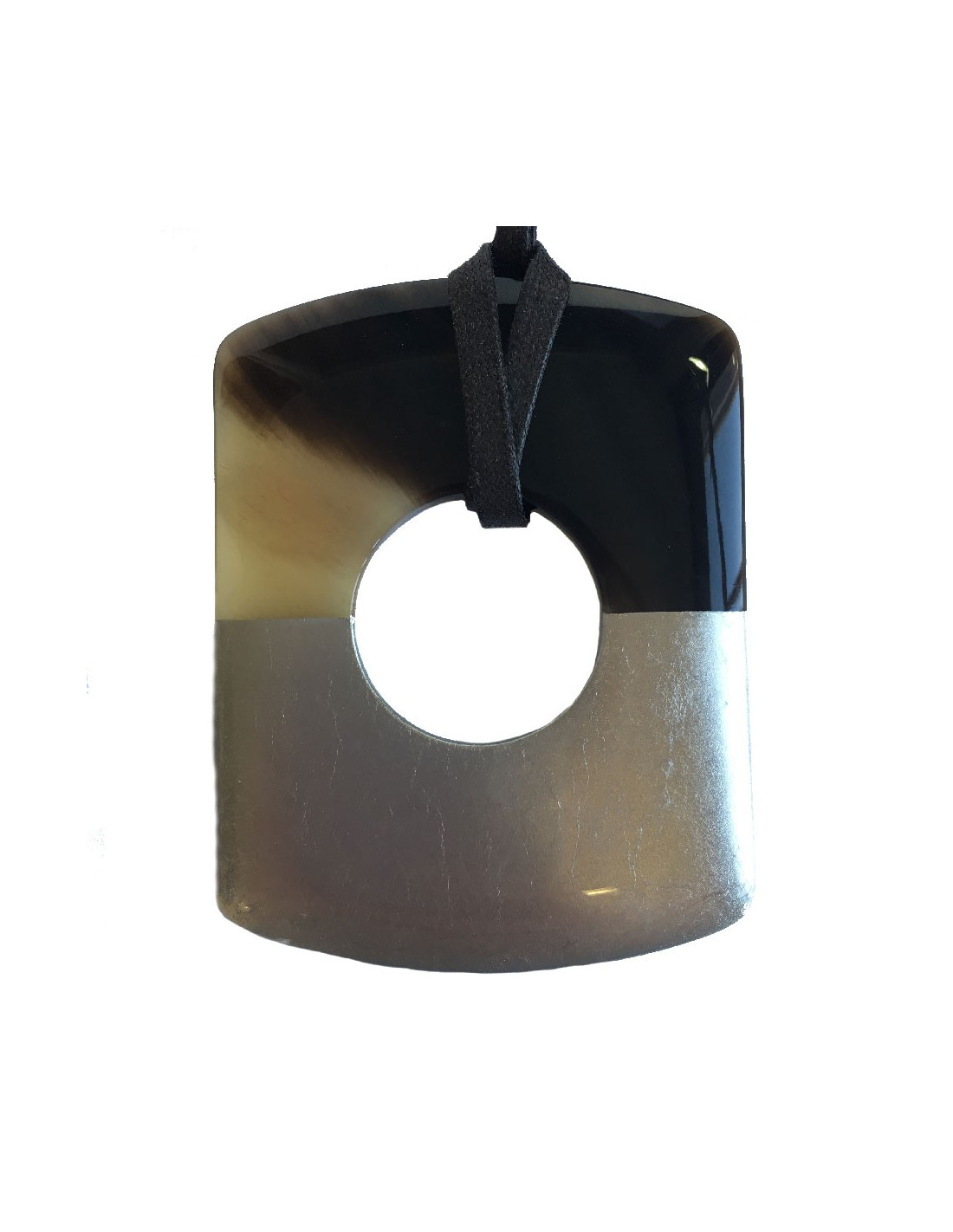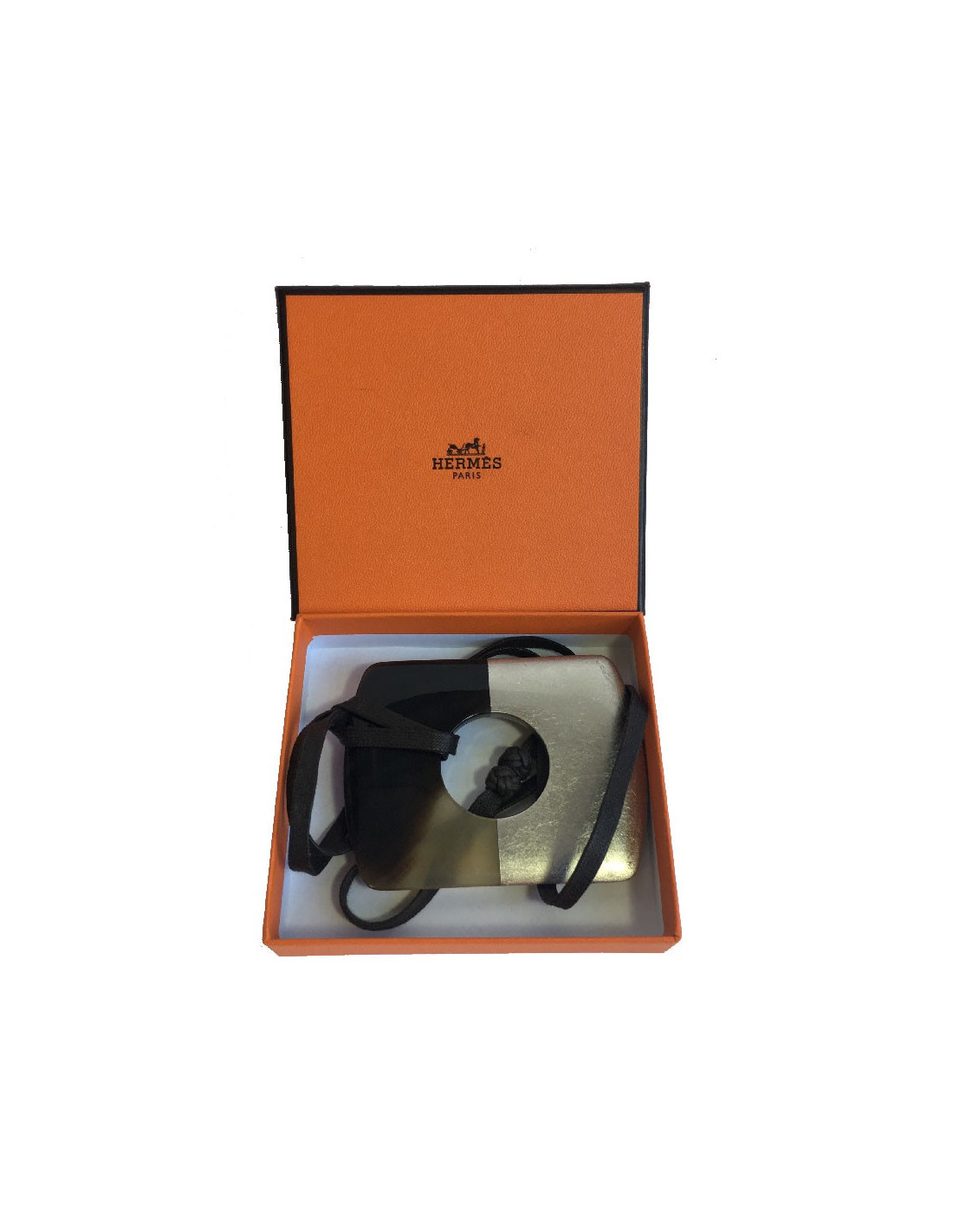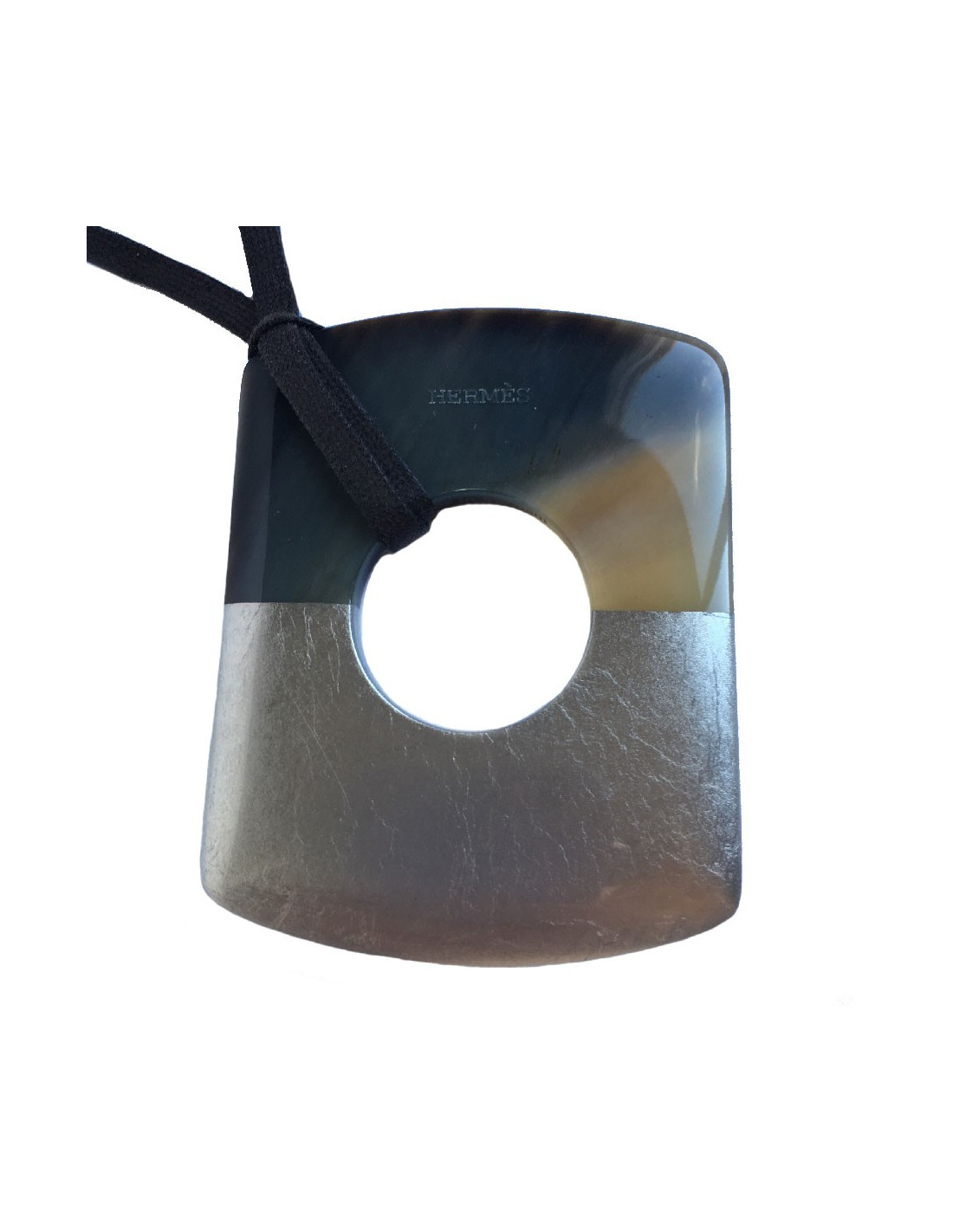 Pendentif Hermès, modèle Dalva, en corne et feuille d'or bronze doré Hermès, avec corde réglable.