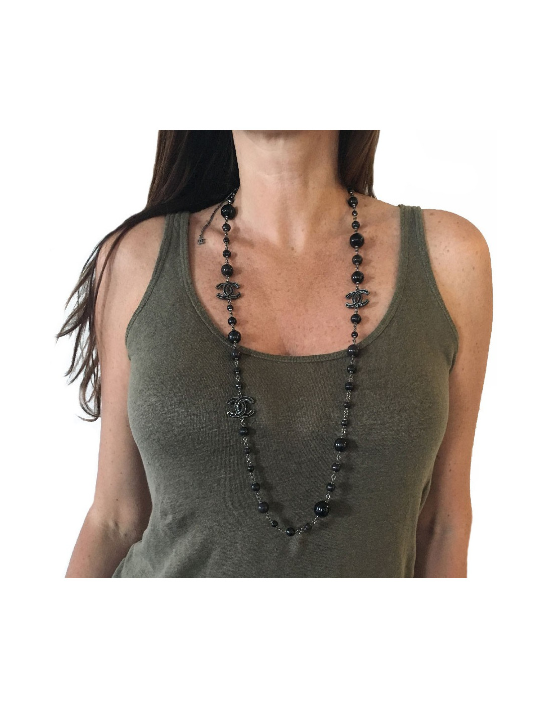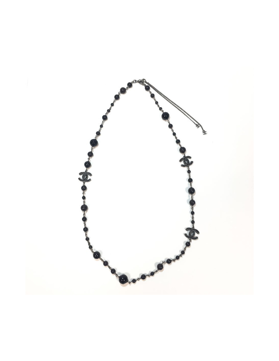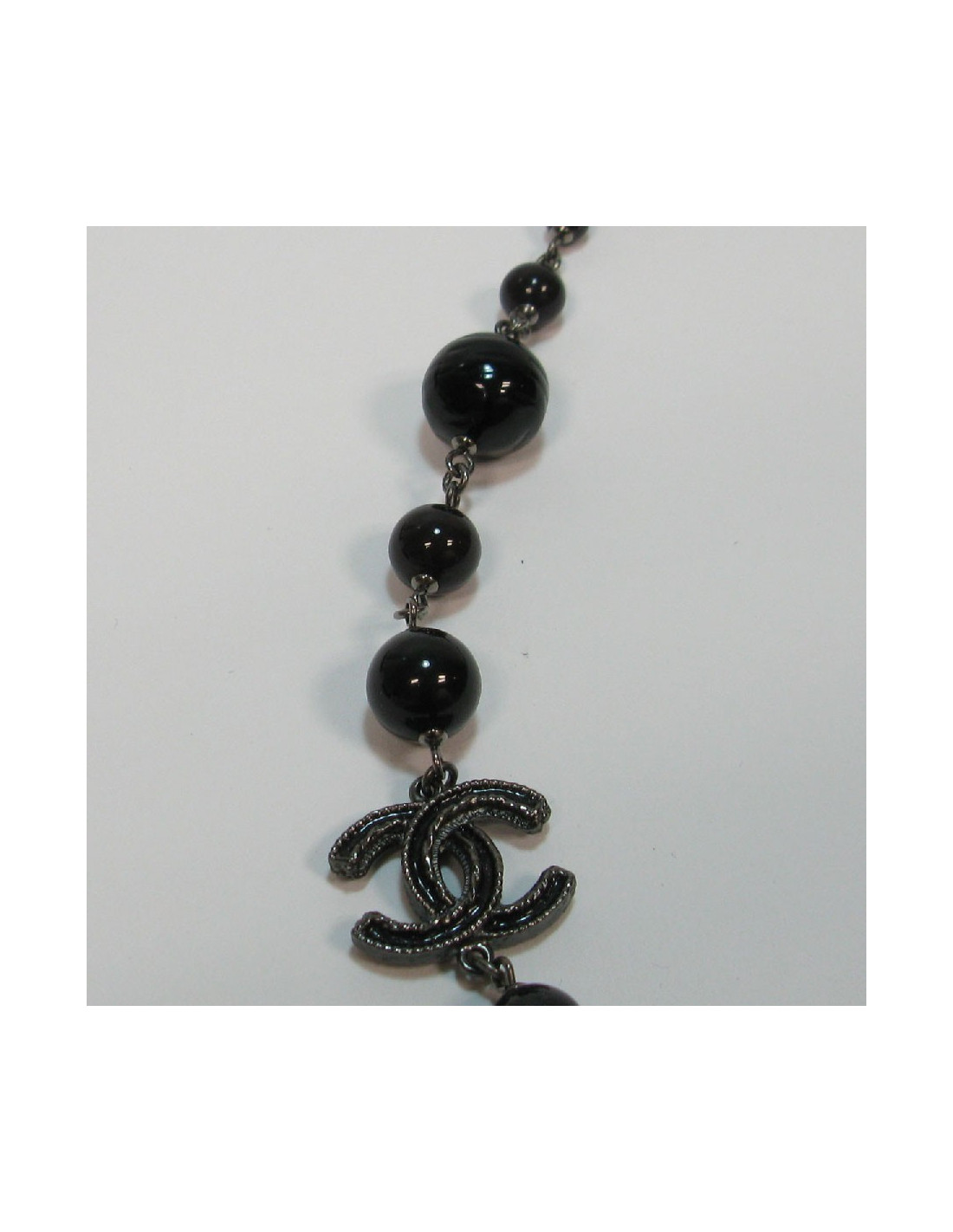 Sautoir CHANEL en perles noires, gris foncé