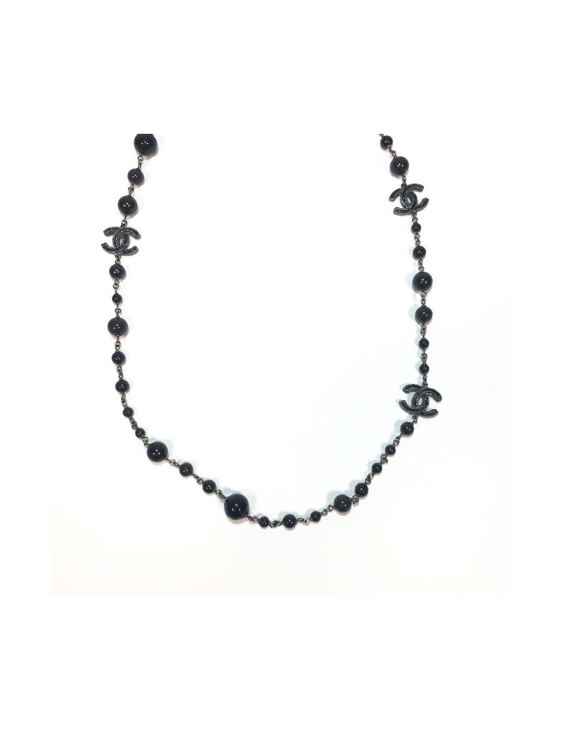 Magnifique sautoir Chanel en perles noires et gris foncé, chaîne en ruthénium, CC en ruthénium et résine noire. 2 chaînes en fine maille ruthénium.