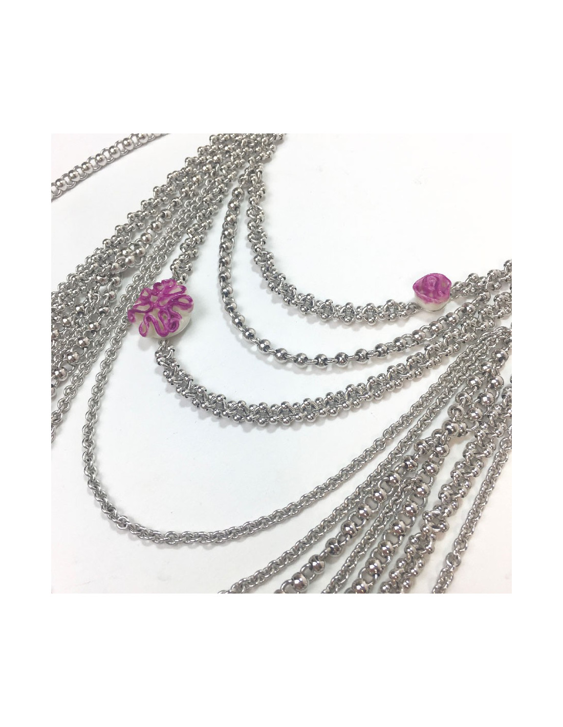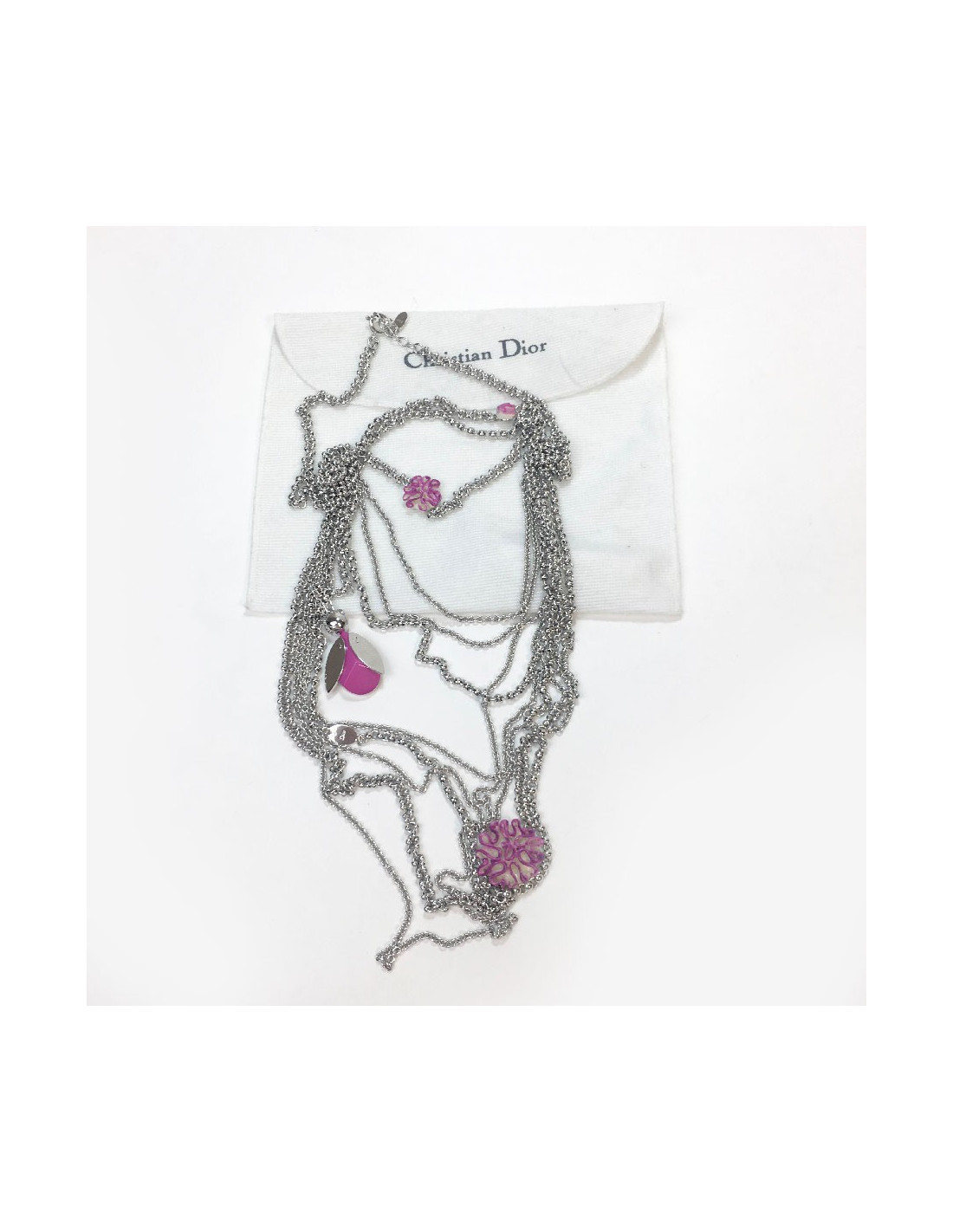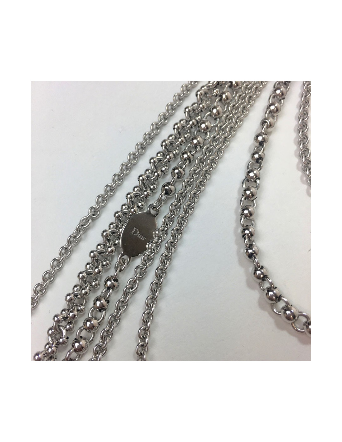 Beau sautoir Dior multi-rangs en métal argenté.