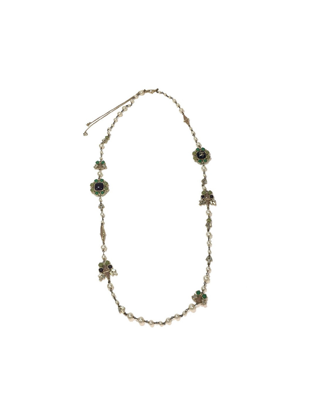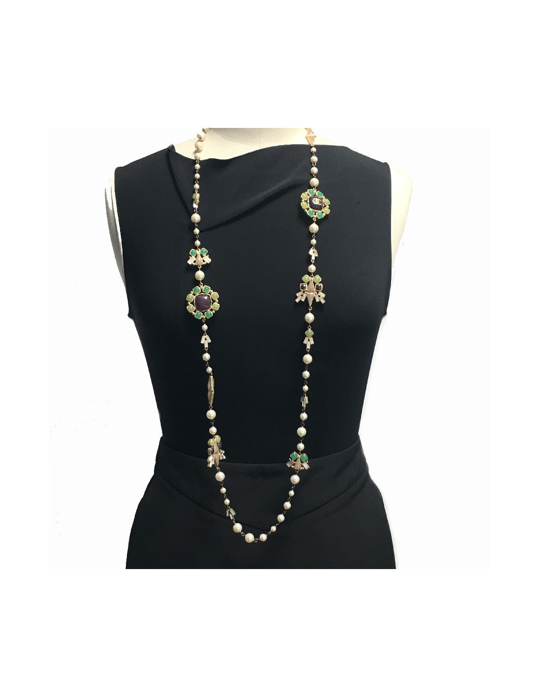 Superbe sautoir Chanel Couture en perle de pâte de verre, magnifique bijou en pâte de verre noir, vert celadon et vert jade. Issue de la Collection Chanel Printemps/Été 2010. Le tout monté sur métal doré à l’or fin.
