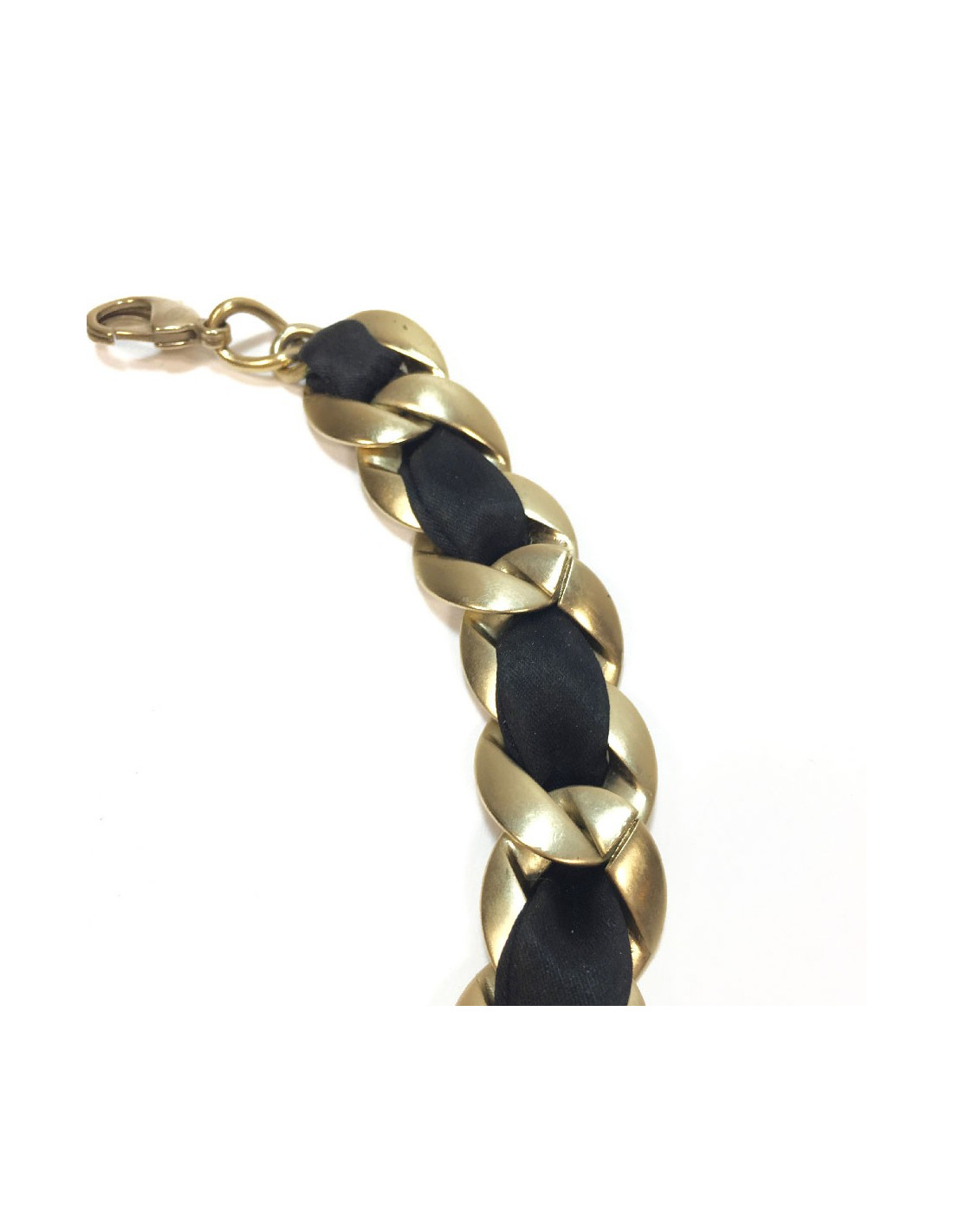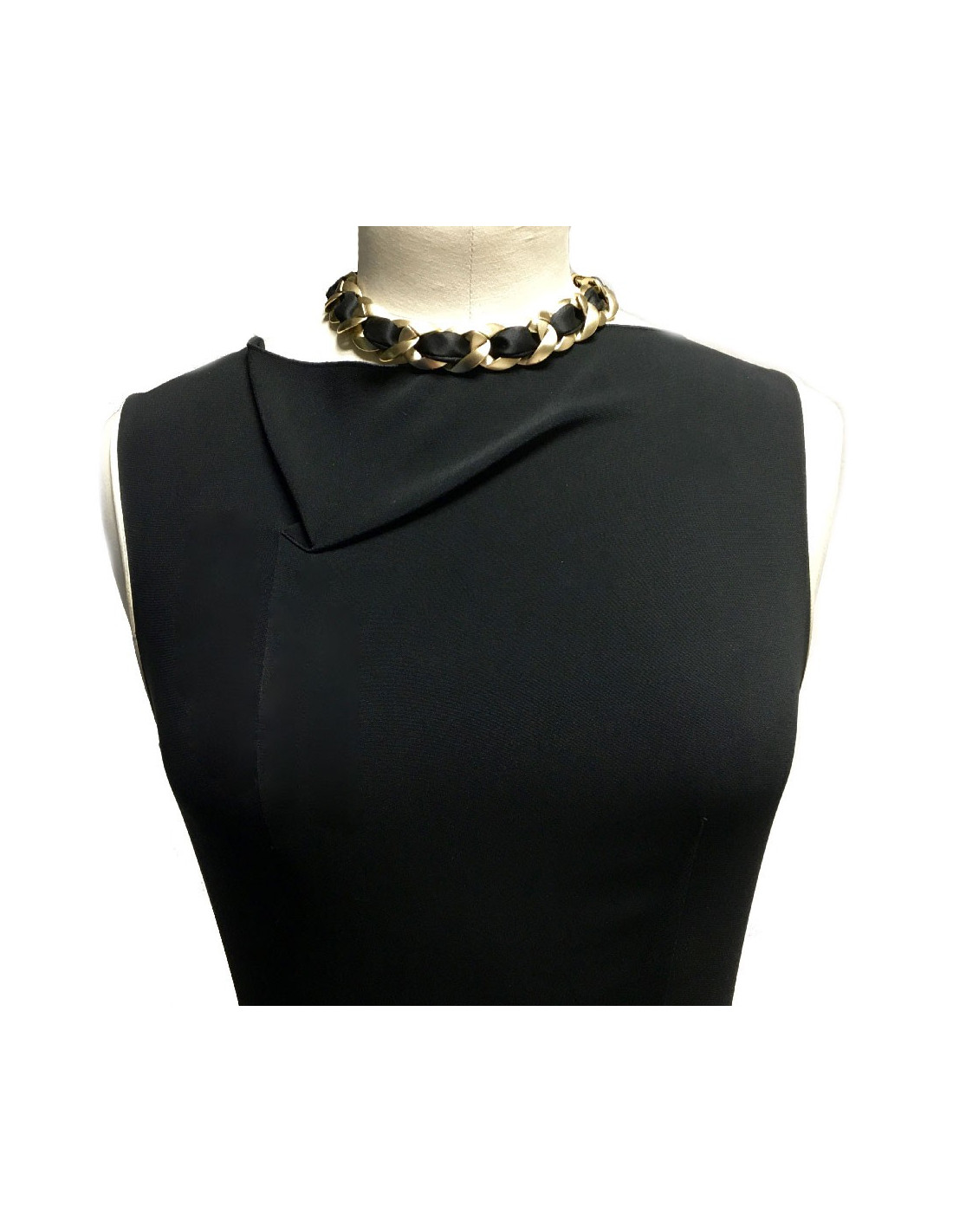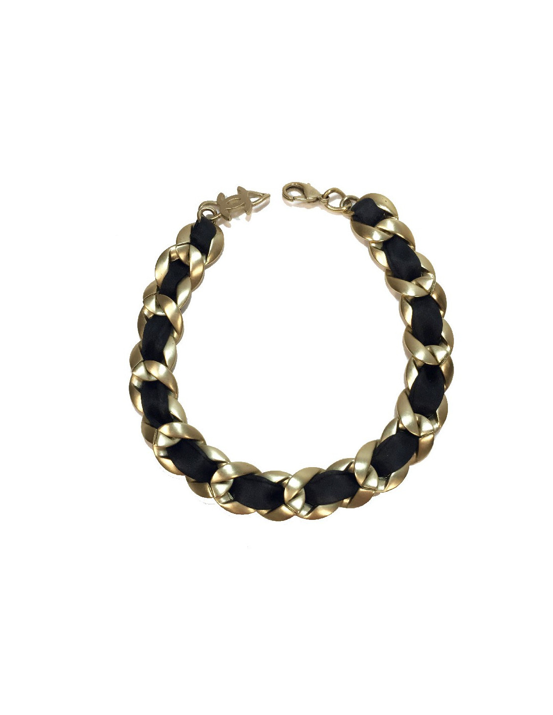 Très beau ras de cou Chanel chaîne en métal or mat entrelacé de ruban en satin noir.